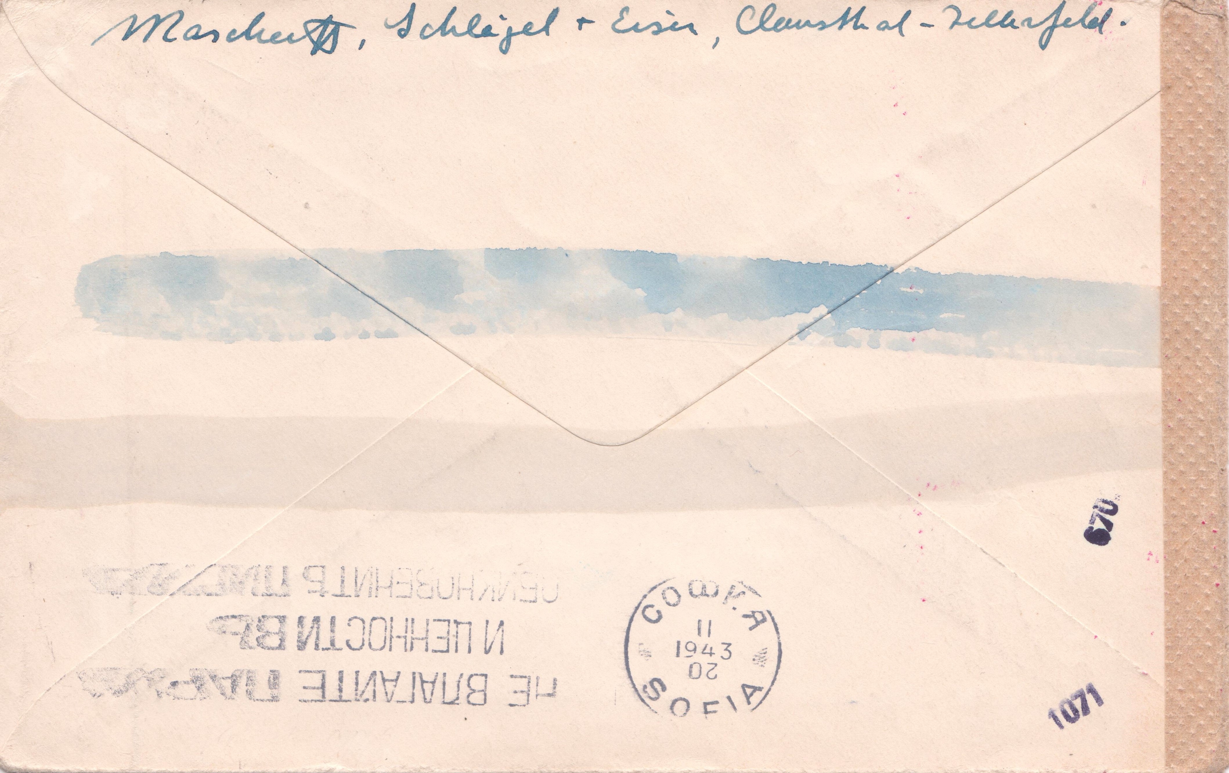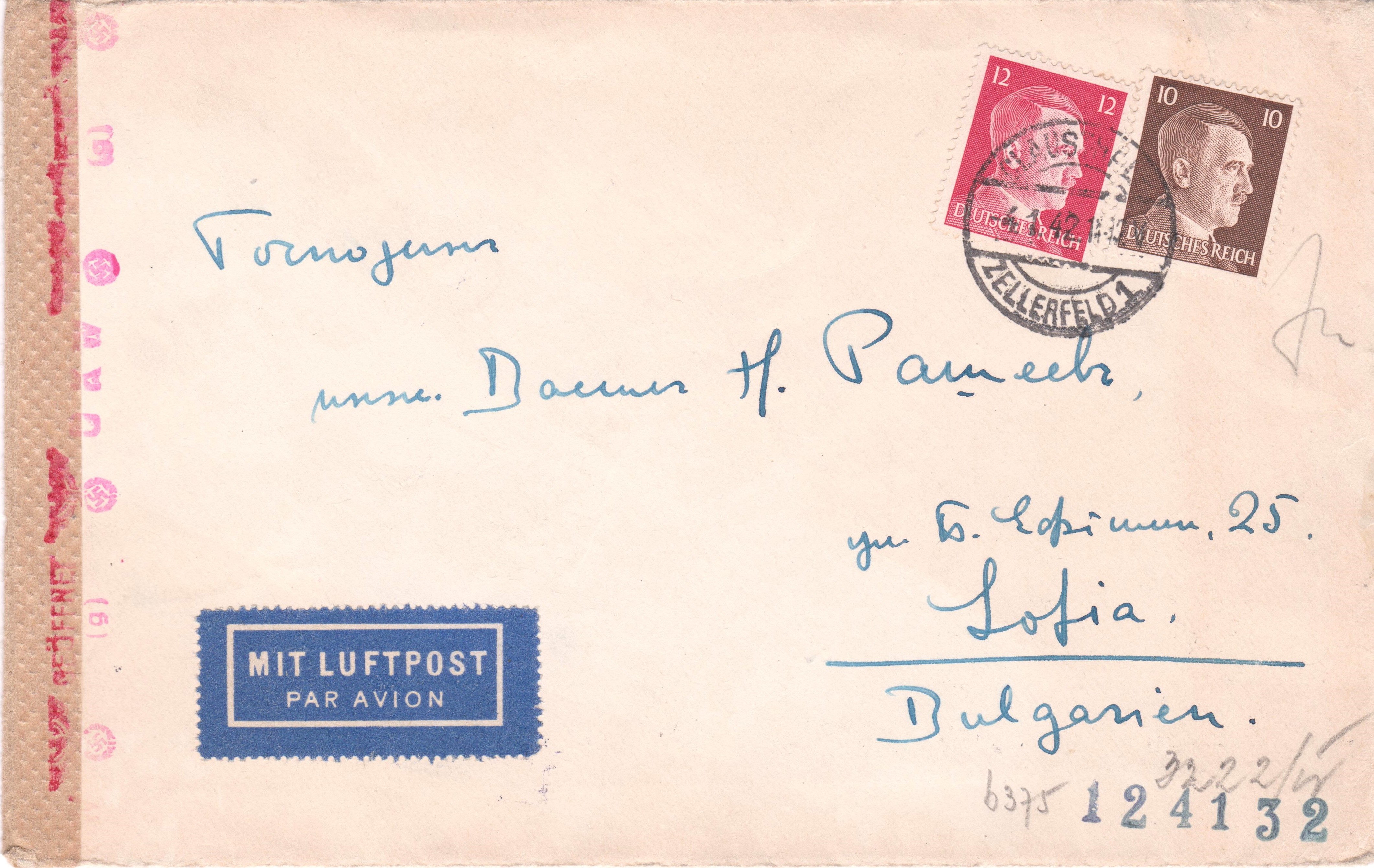 Luftpostbrief, adressiert nach Sofia, Bulgarien, frankiert mit 22 Pf Dauerserie Adolf Hitler aufgegeben am 04.01.1942 in CLAUSTHAL-ZELLERFELD 1: