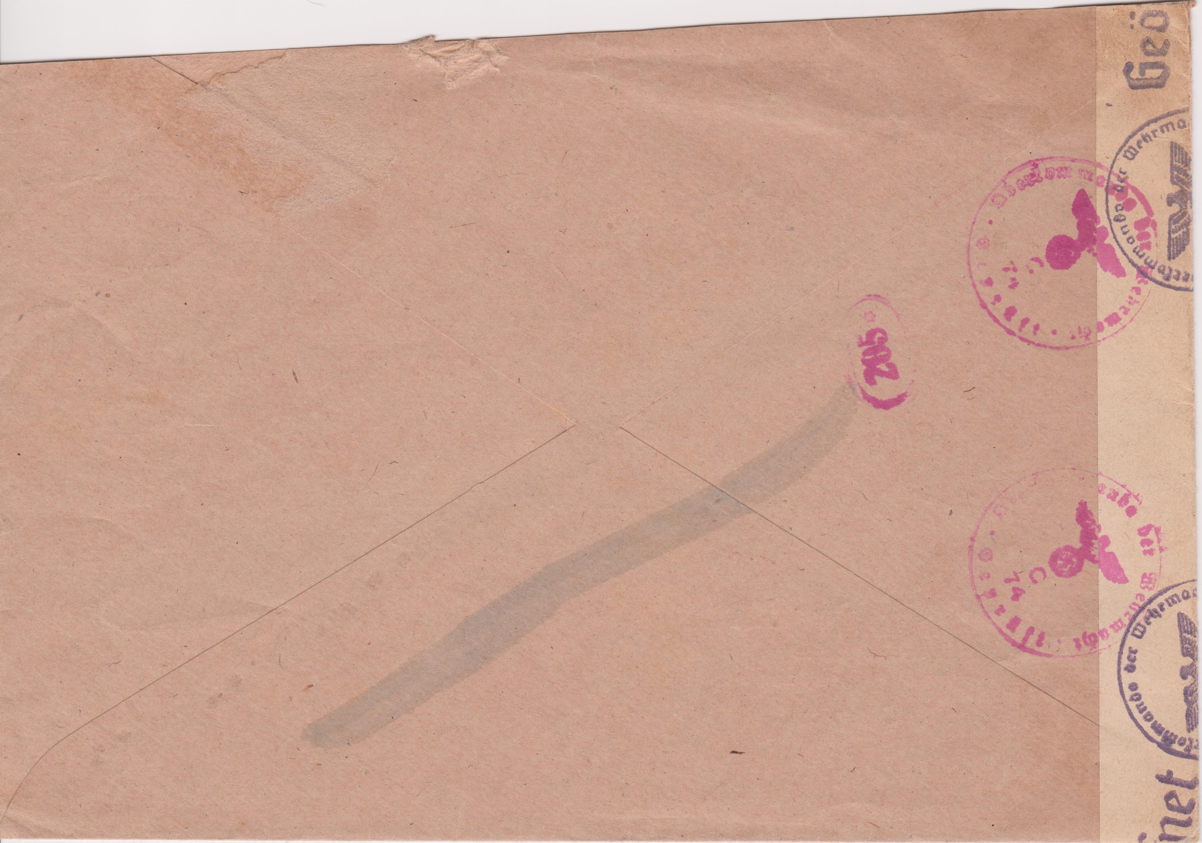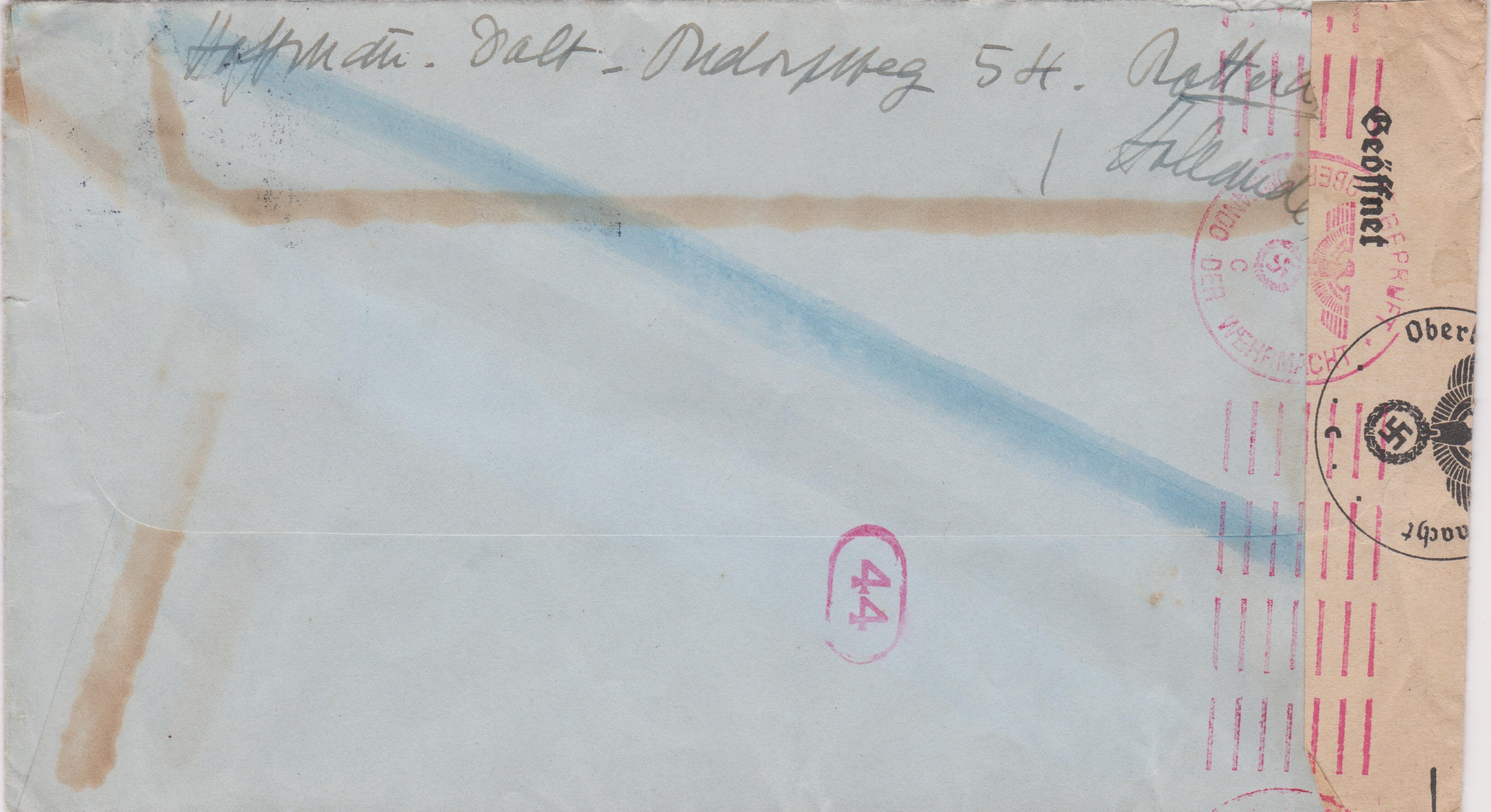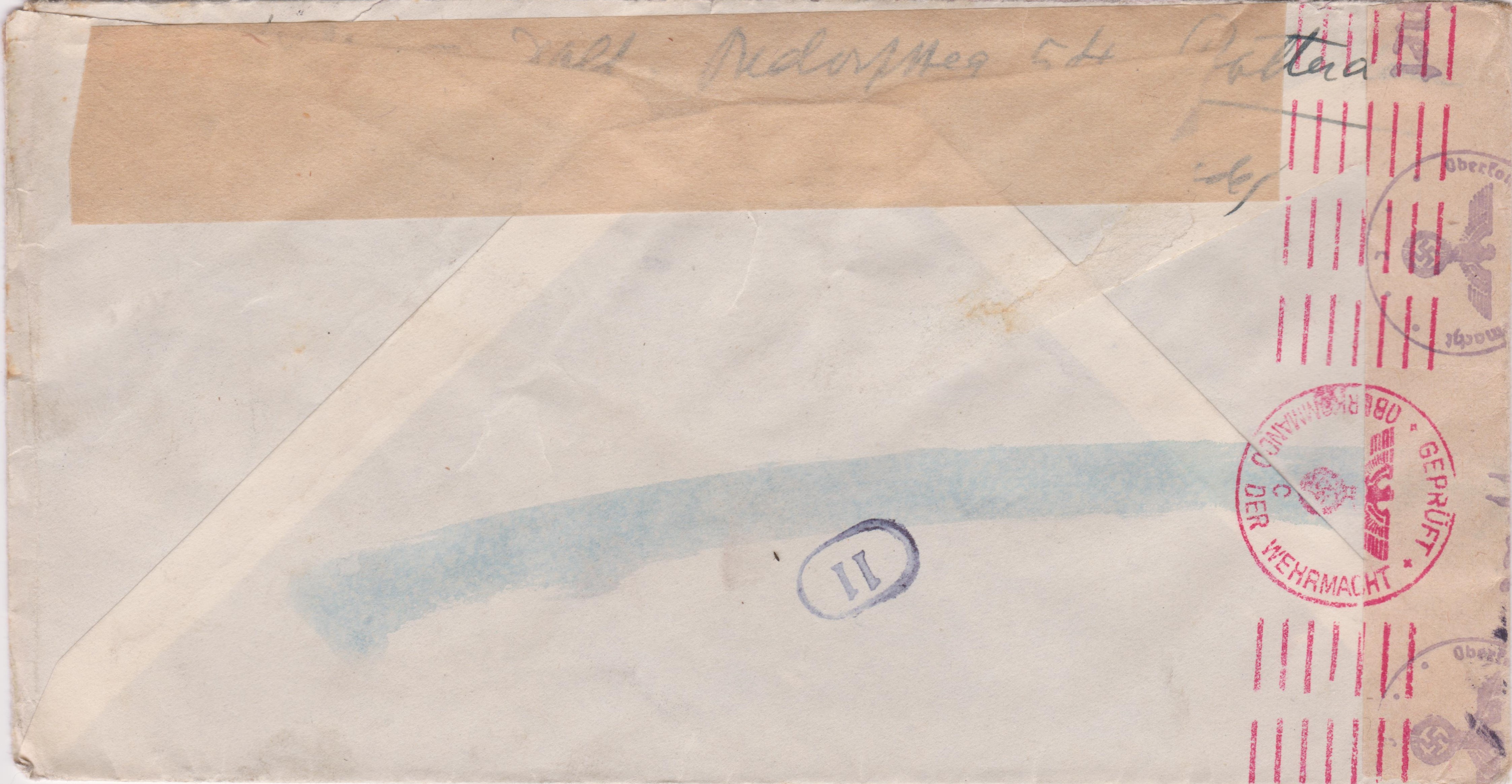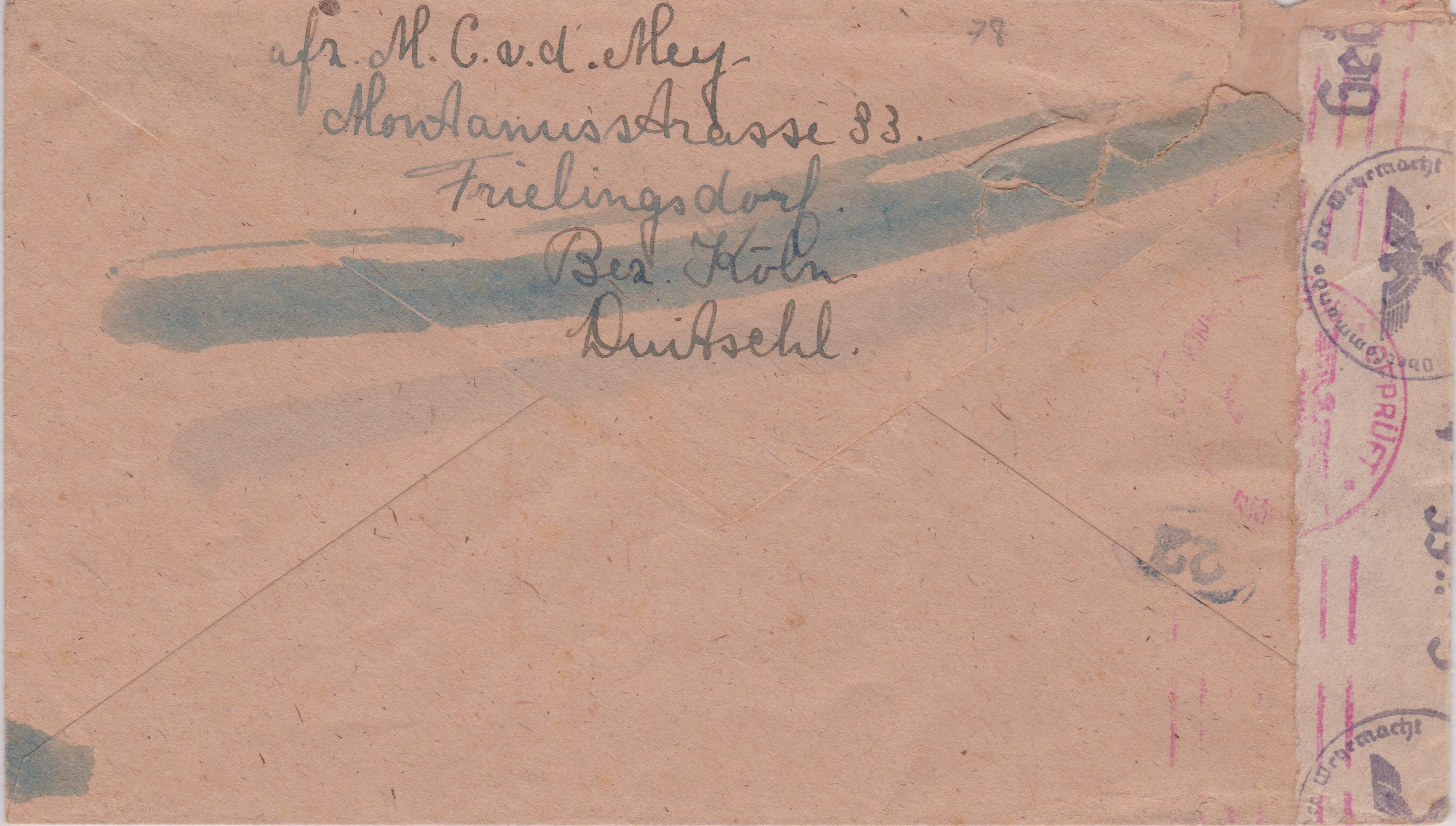 Der Brief lief durch die ABP Köln, wo er linksseitig geöffnet und nach erfolgter Prüfung mit einem Verschlußstreifen, Landsmann CV3.2, wiederverschlossen wurde, was rückseitig ein Maschinenstemelabschlag, Landsmann CPM1.1, in Rot dokumentiert.