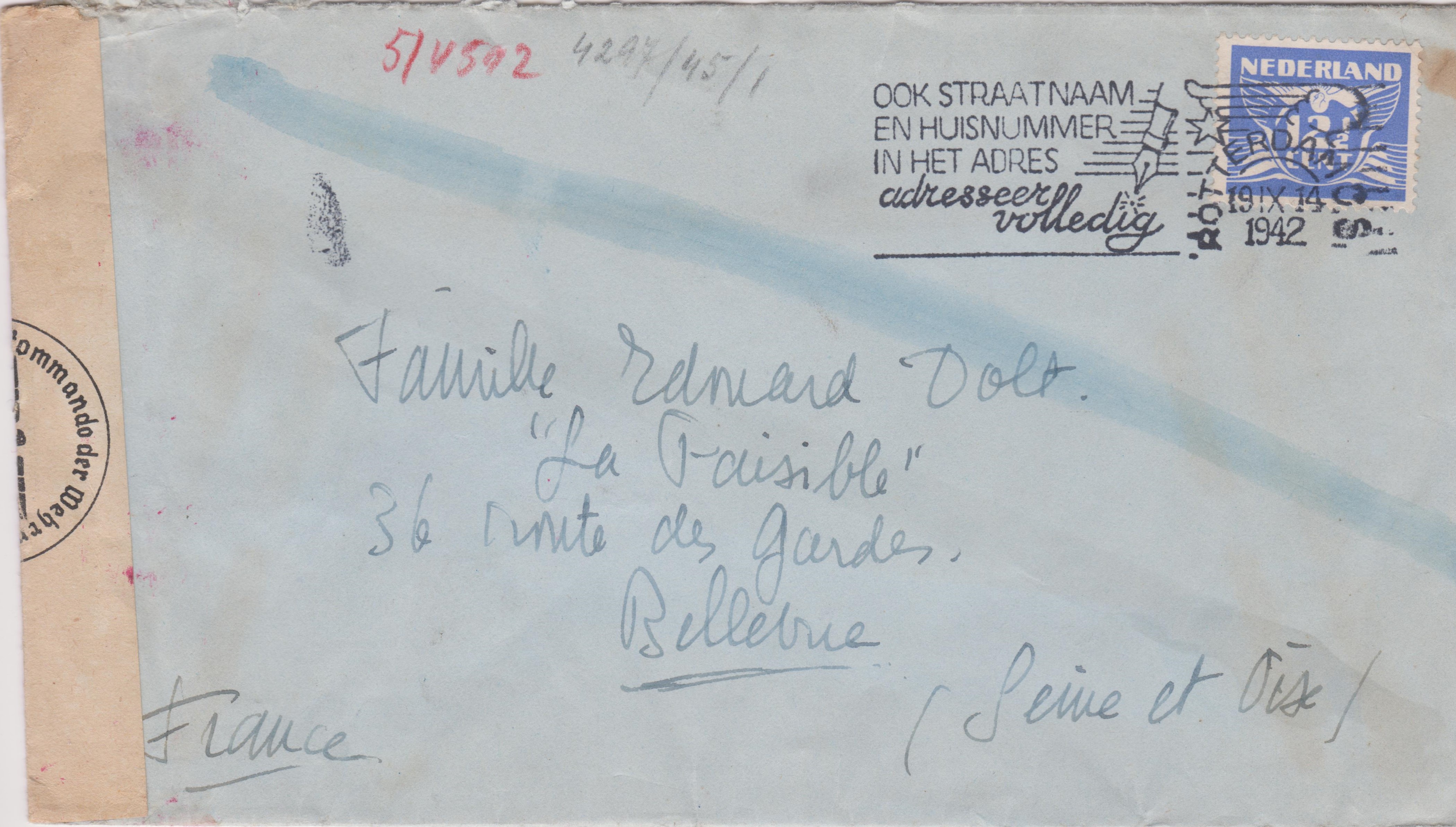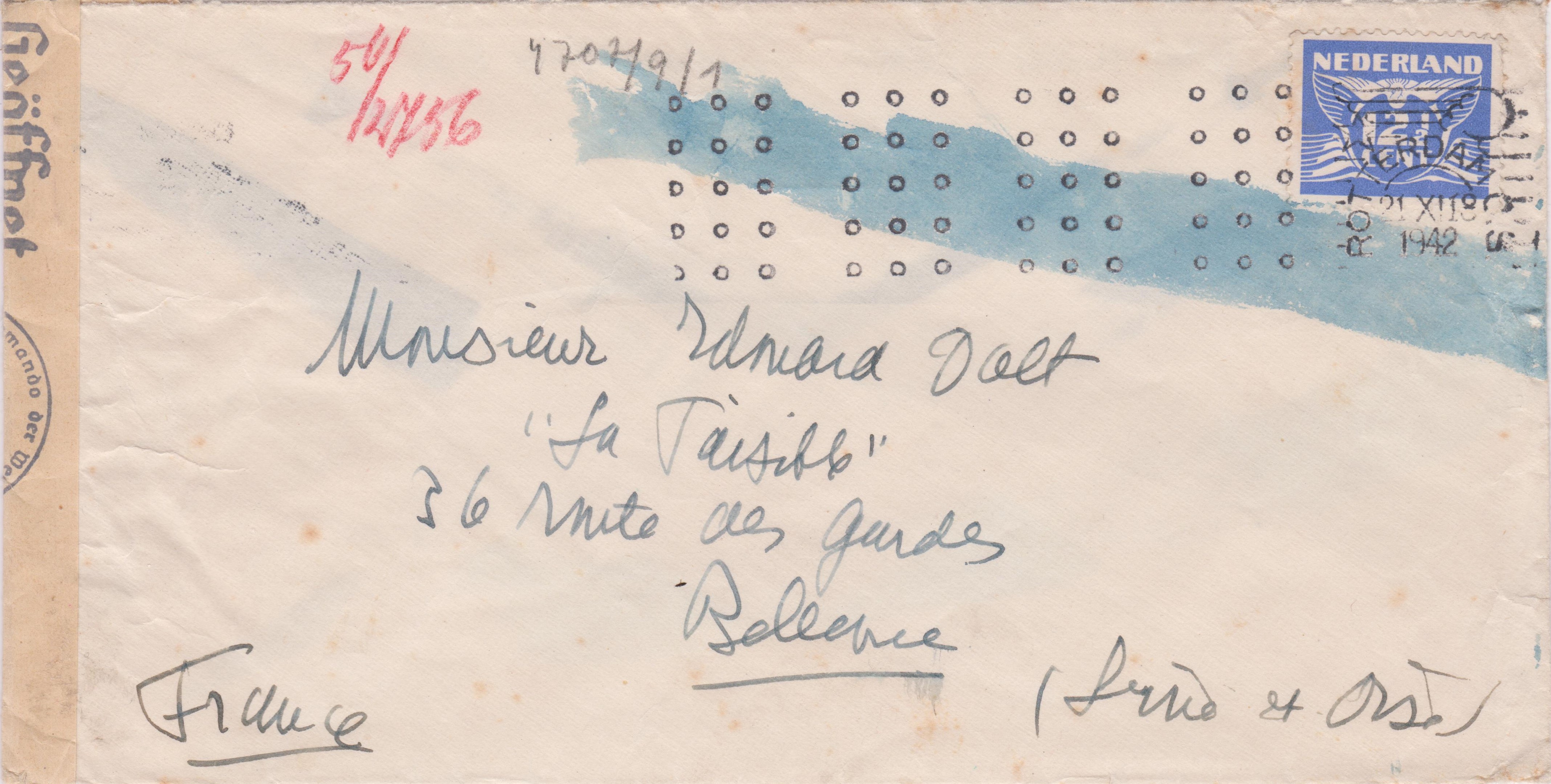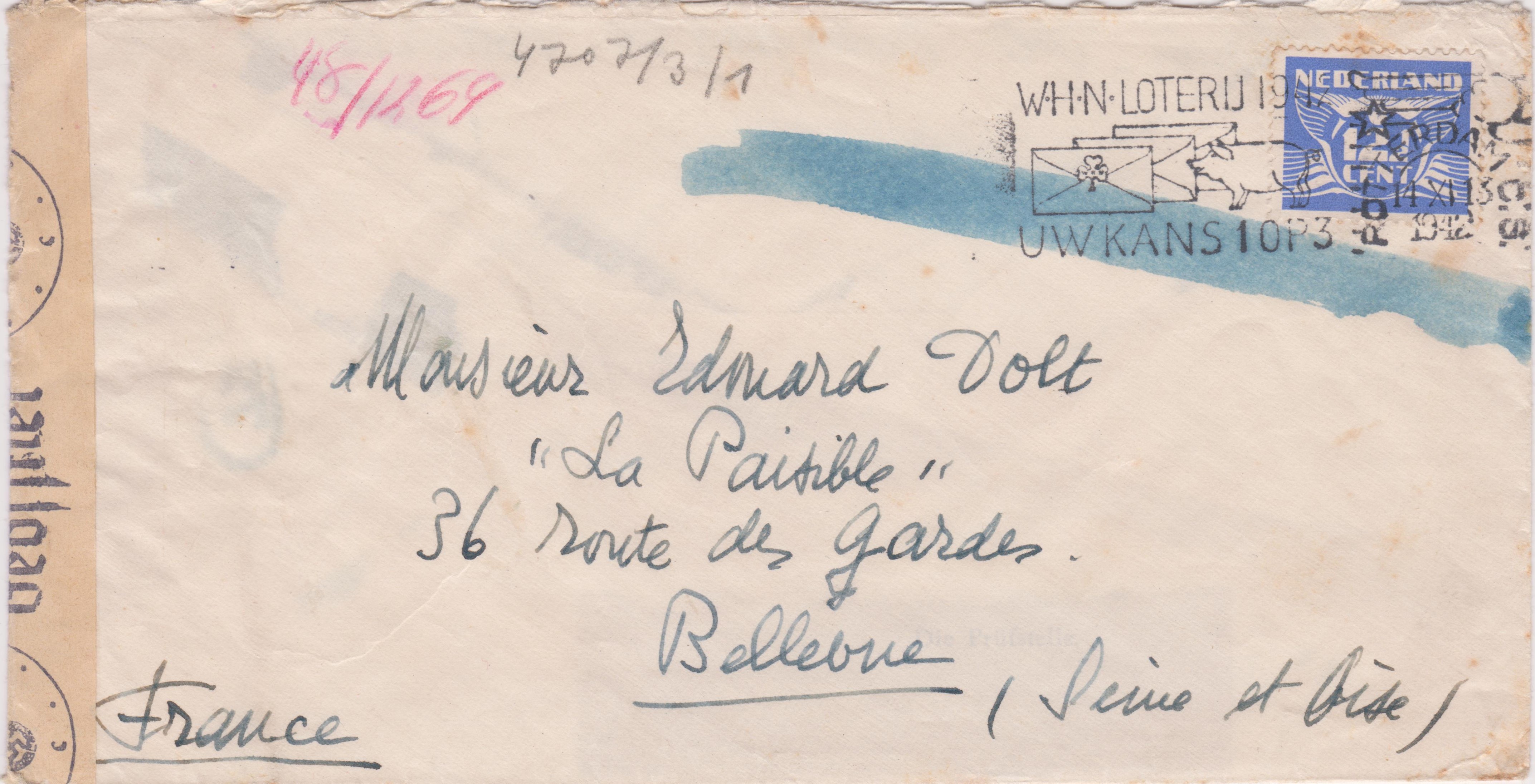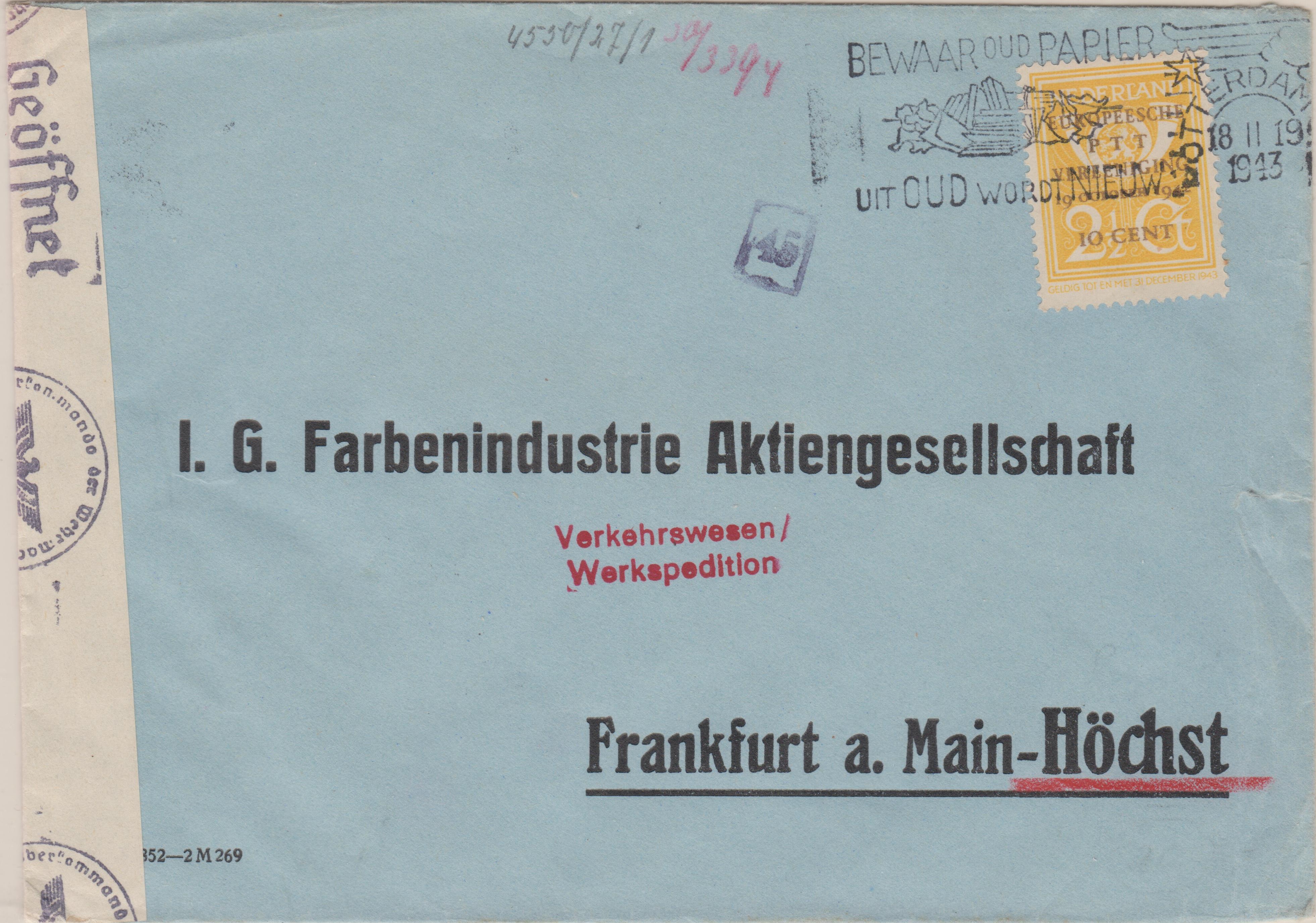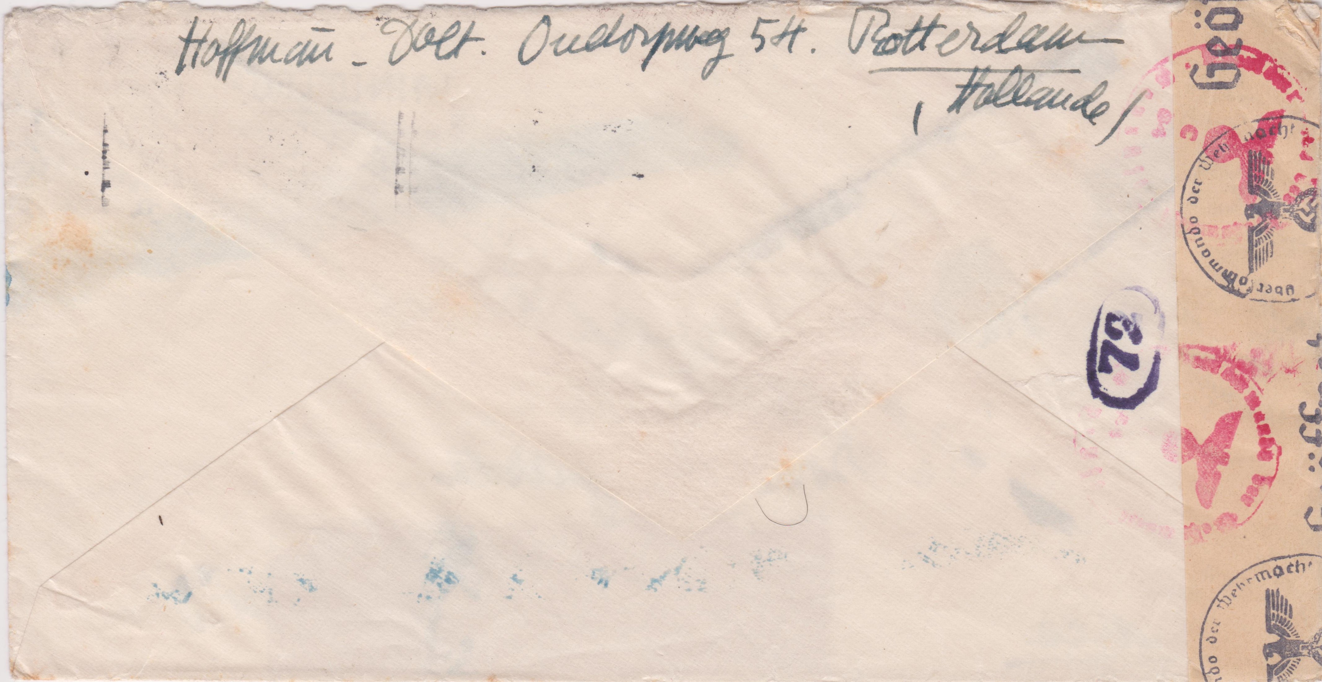 Der Brief lief durch die ABP Köln, wo er linksseitig geöffnet und nach erfolgter Prüfung mit einem Verschlußstreifen, Landsmann CV3.2, wiederverschlossen wurde, was rückseitig ein Maschinenstemelabschlag, Landsmann CPM1.1, in Rot dokumentiert.