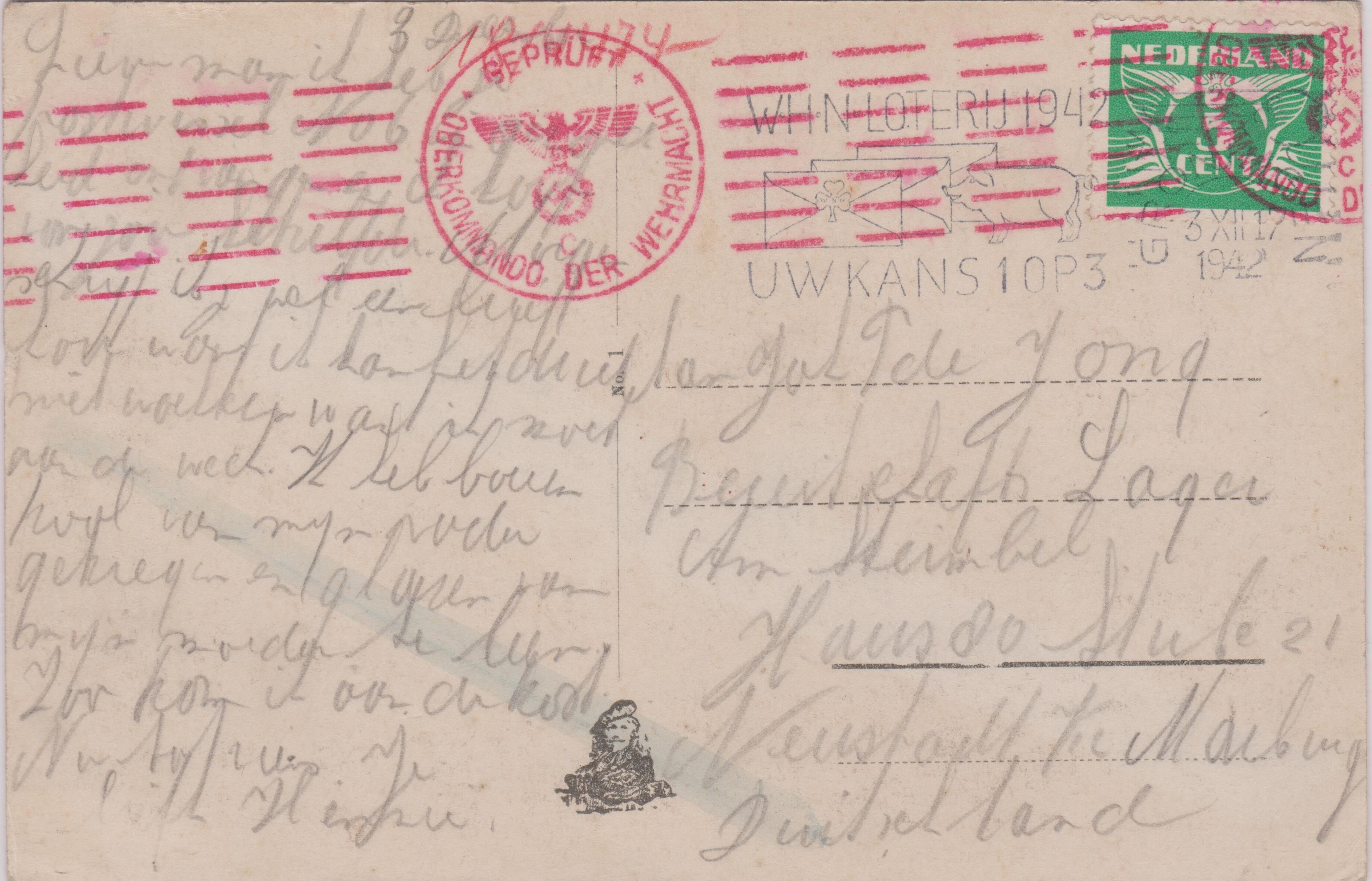 Vorderseitig sowie rückseitig erfolgte eine chemische Zensurdurch waagerechte Pinselstriche mit jeweils zwei Chemikalien.