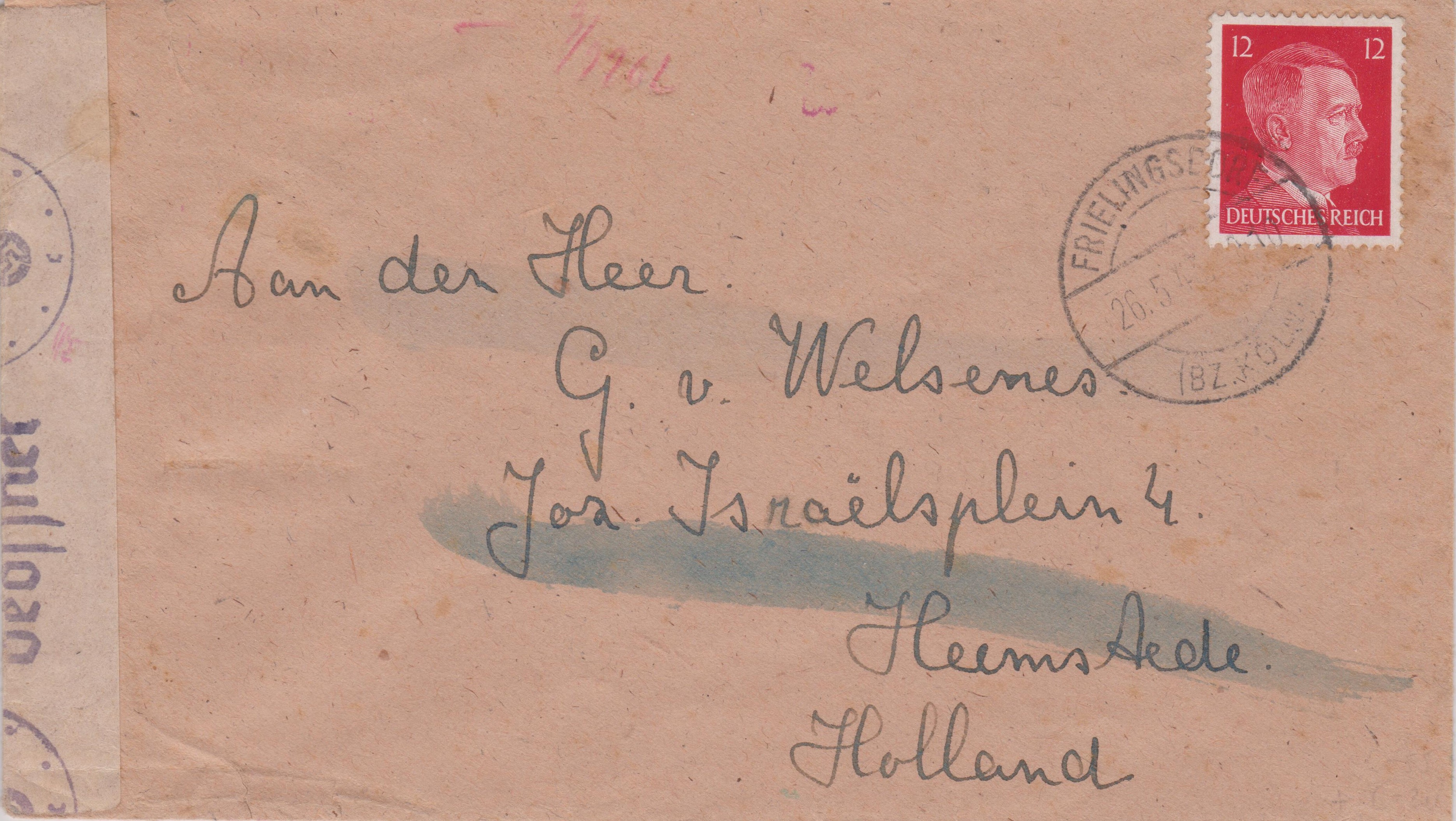 Brief, frankiert per EF 12 Pf Dauerserie Adolf Hitler, adressiert nach "Heems Aede Holland", aufgegeben am 26.05.1943 in FRIELINGSDORF: