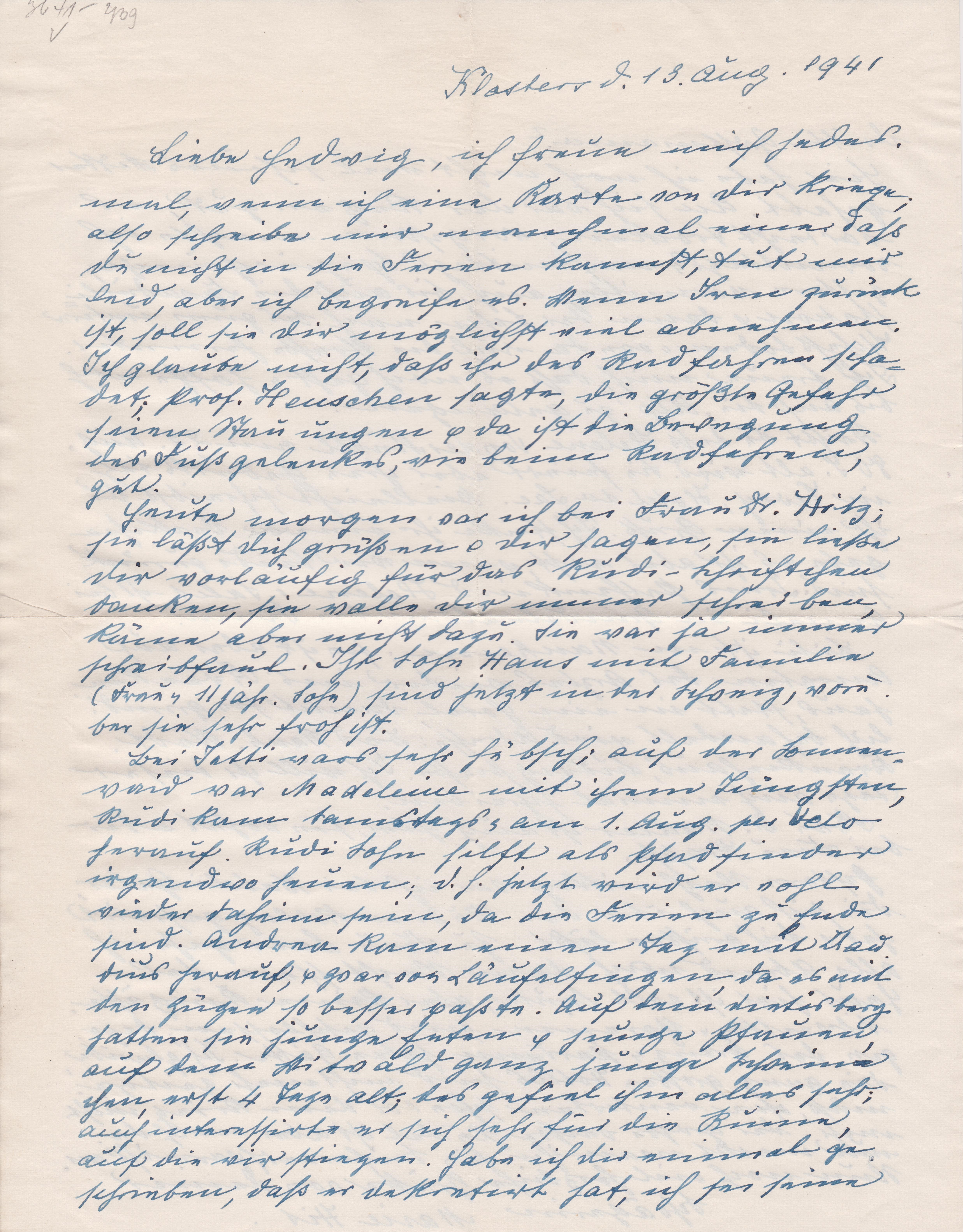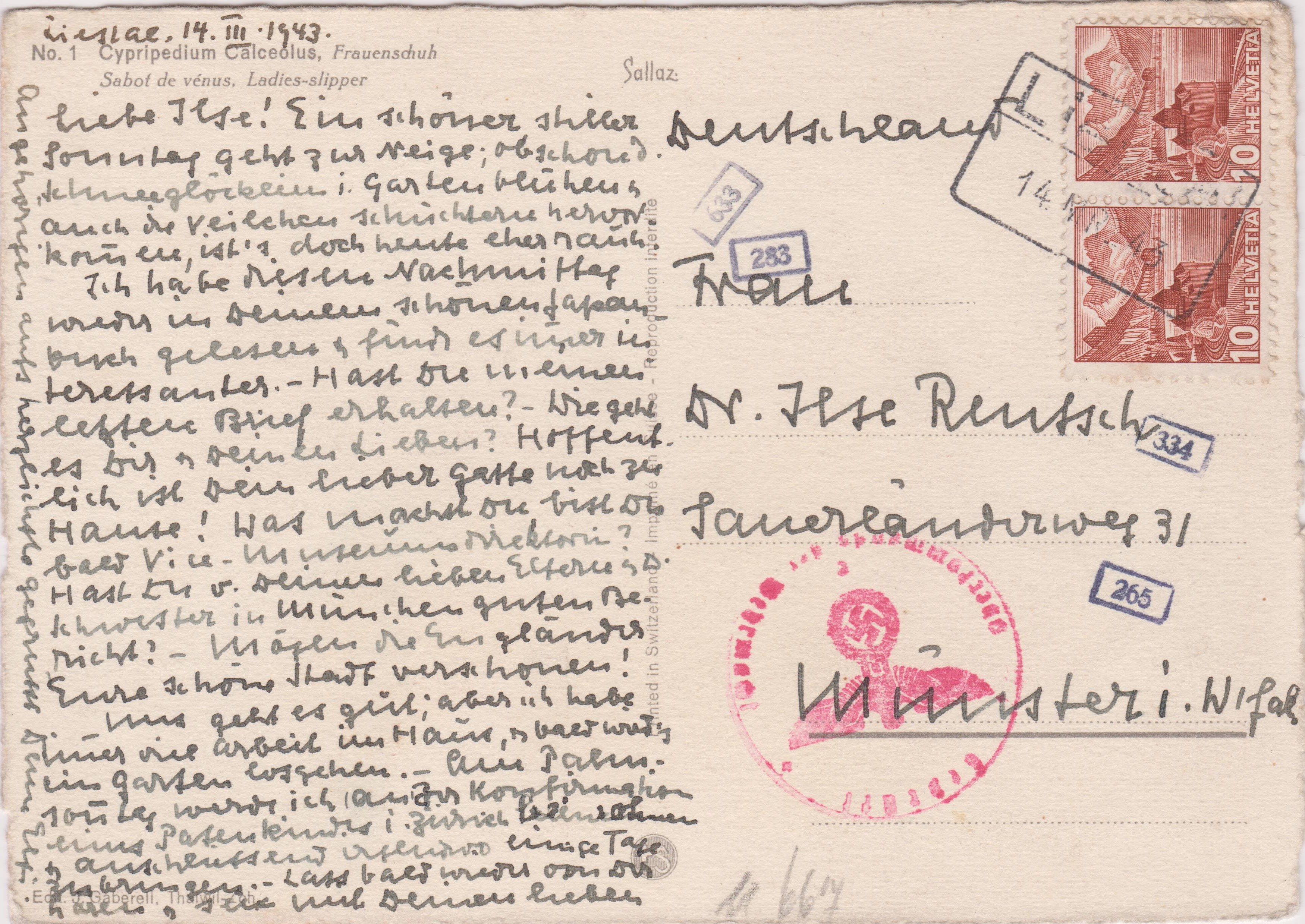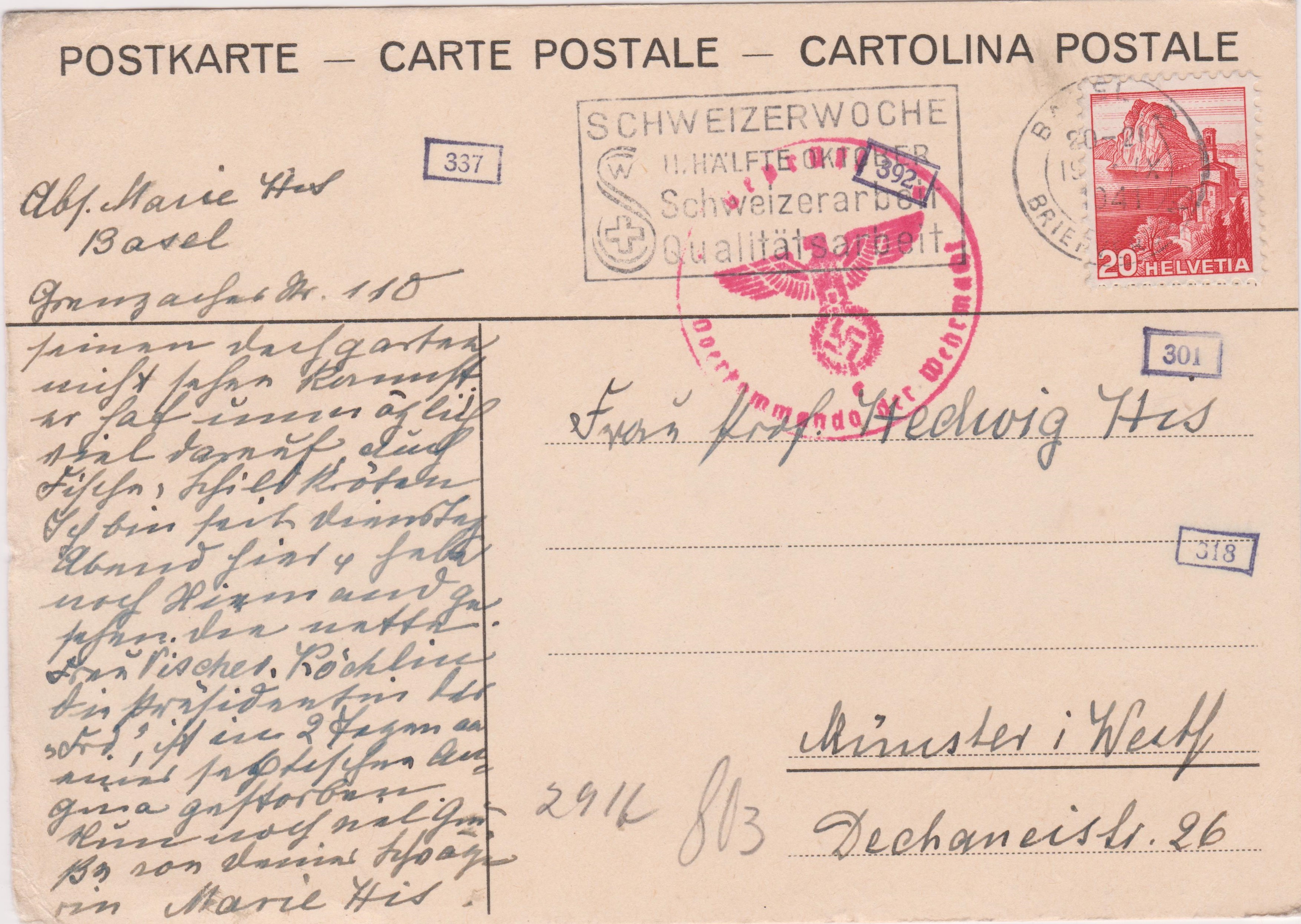 Postkarte aus der Schweiz, frankiert mit 20 Rappen, adressiert nach "Münster in Westfalen", aufgegeben am 31.07.1941 in "EPTINGEN":