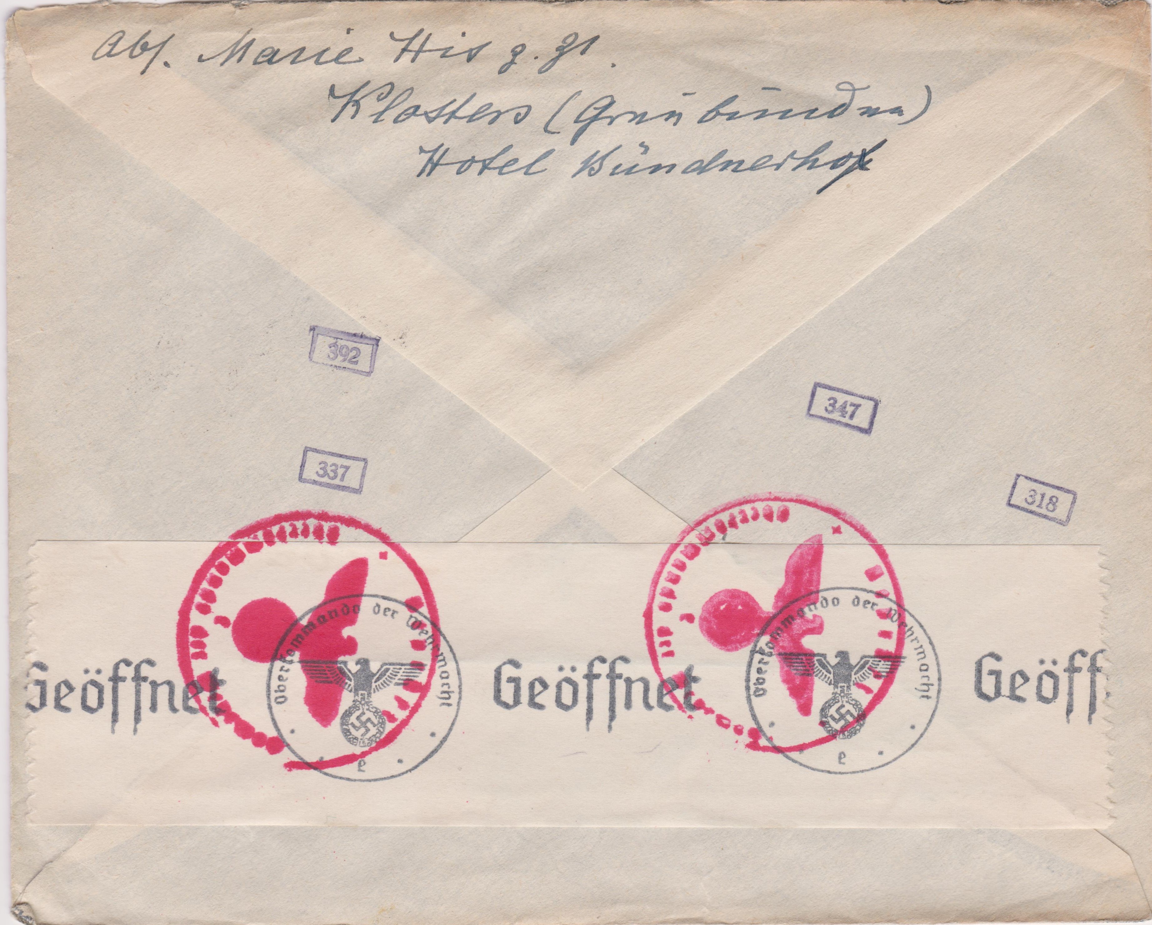 Diese Postkarte wurde der ABP Frankfurt zugeleitet, wo vier Prüferstempel in Blau abgeschlagen wurden.