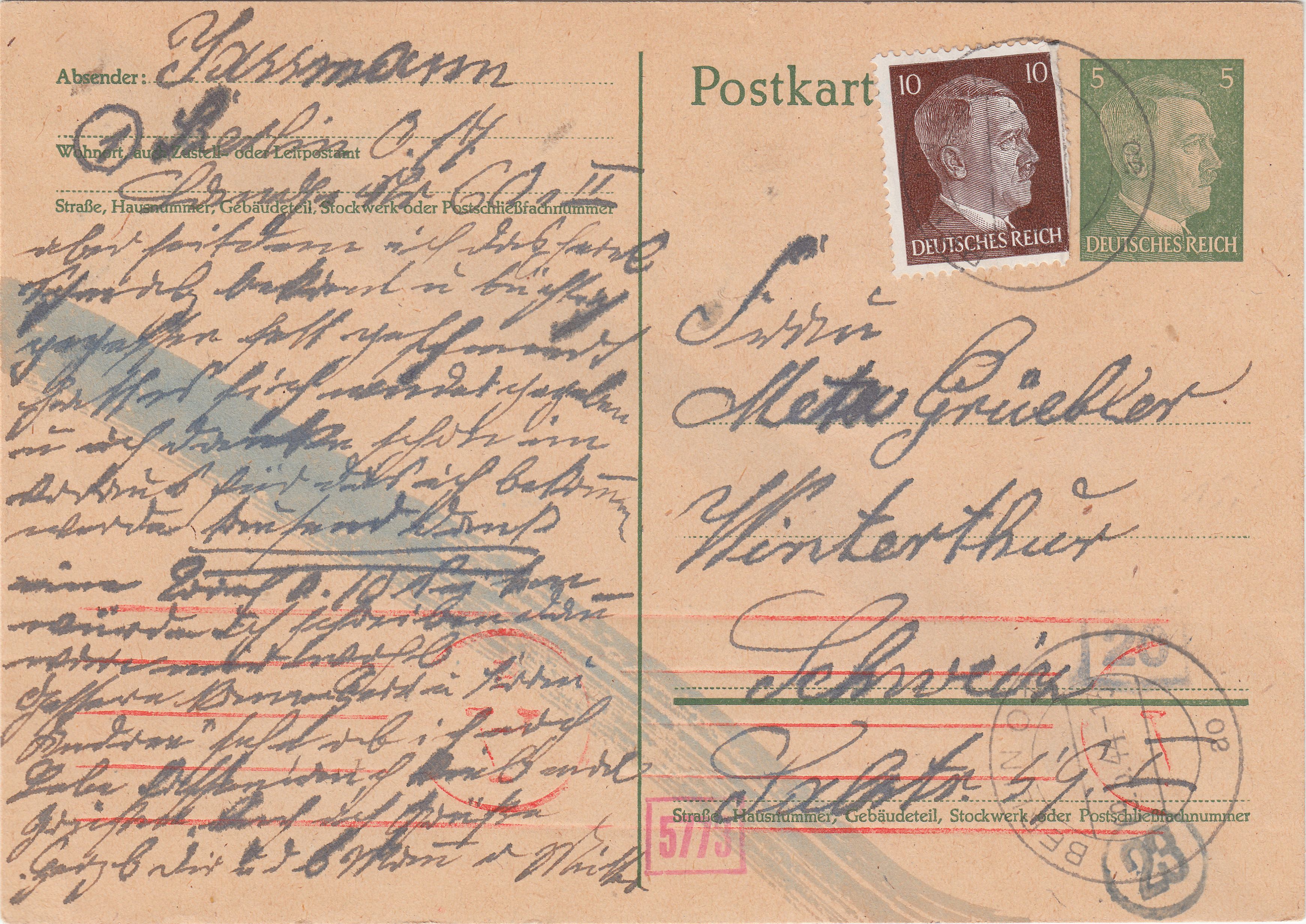 Diese nach Winterthur adressierte Postkarte wurde am 09.05.1944 in BERLIN O 17 am Postschalter aufgegeben, was der Blankoabschlag des Tagesstempels rechts unten dokumentiert: