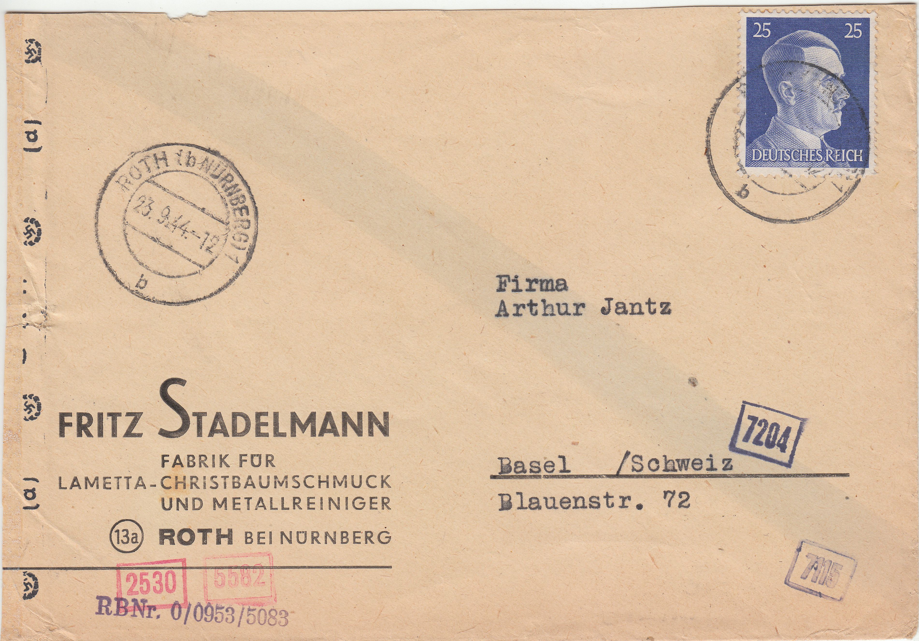 Dieser nach Basel adressierte Brief wurde am 23.09.1944 in "ROTH (b NÜRNBERG) 1" am Postschalter aufgegeben, was der Blankoabschlag des Tagesstempels dokumentiert: