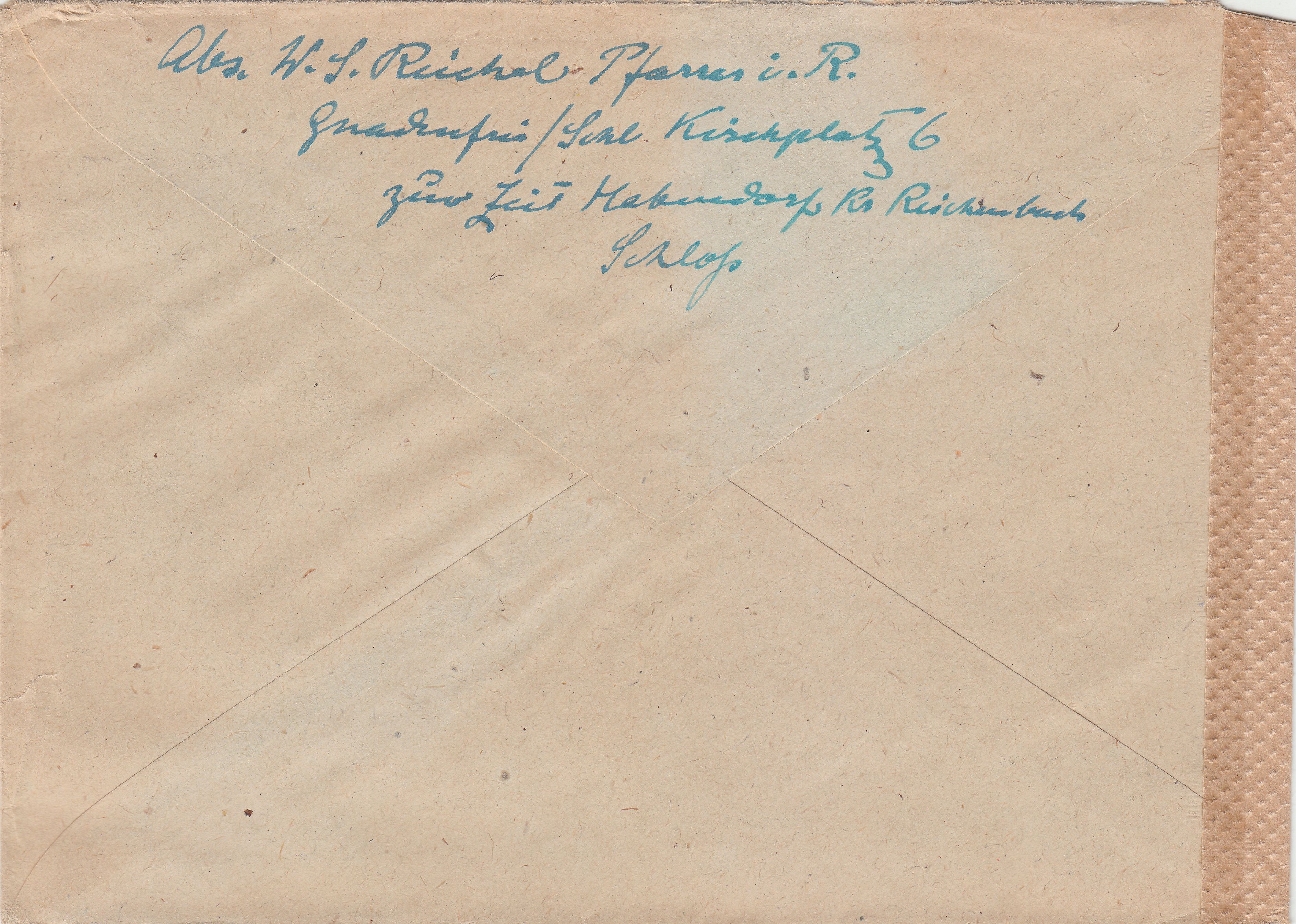 Dieser nach Bellinzona adressierte Brief wurde am 24.06.1943 in "HABENDORF über FRANKENSTEIN (SCHLES.)" aufgegeben, was der Blankoabschlag des Tagesstempels dokumentiert: