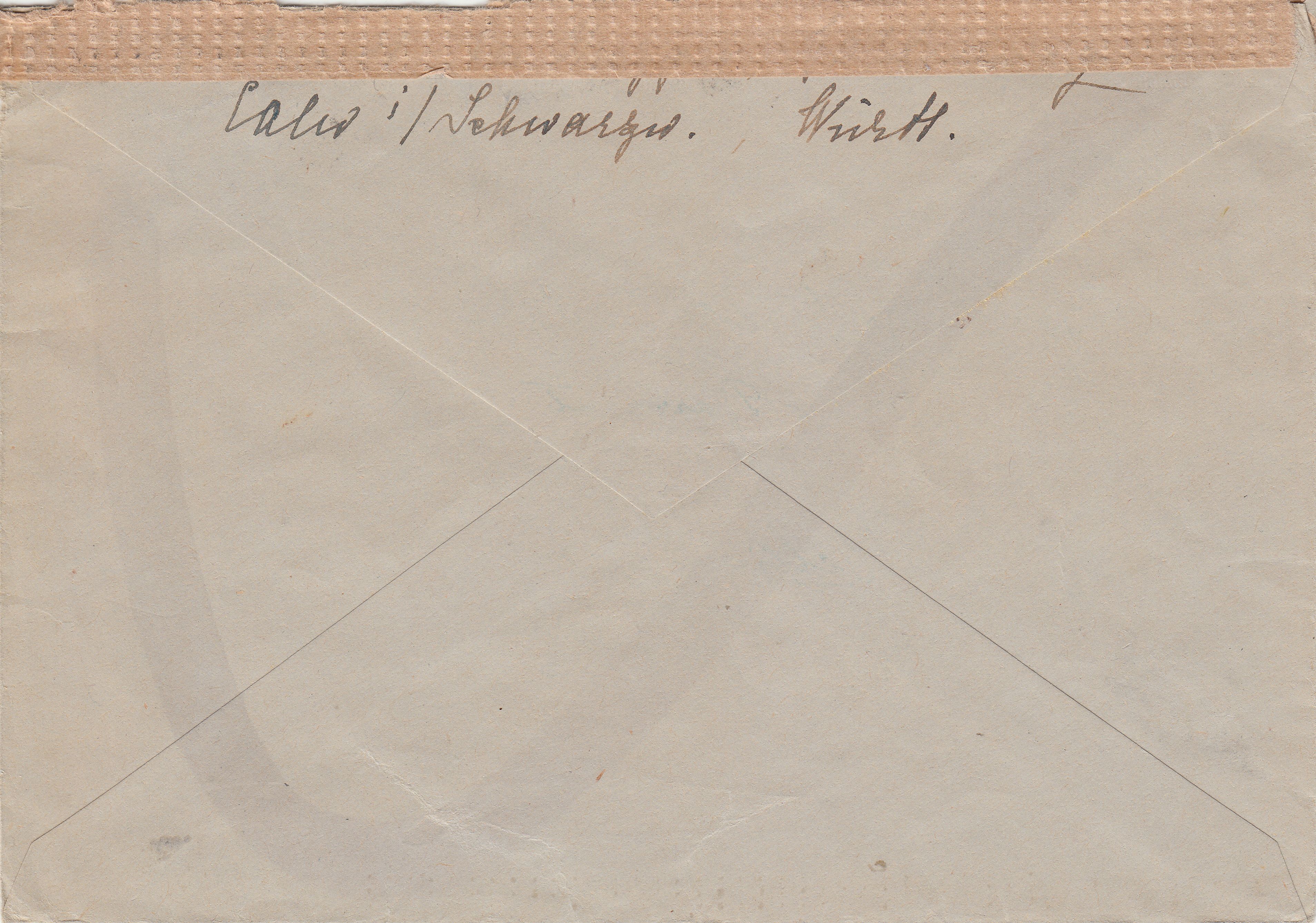 Dieser nach Bellinzona adressierte Brief wurde am 30.09.1943 in "CALW" aufgegeben, was der Blankoabschlag des Tagesstempels dokumentiert: