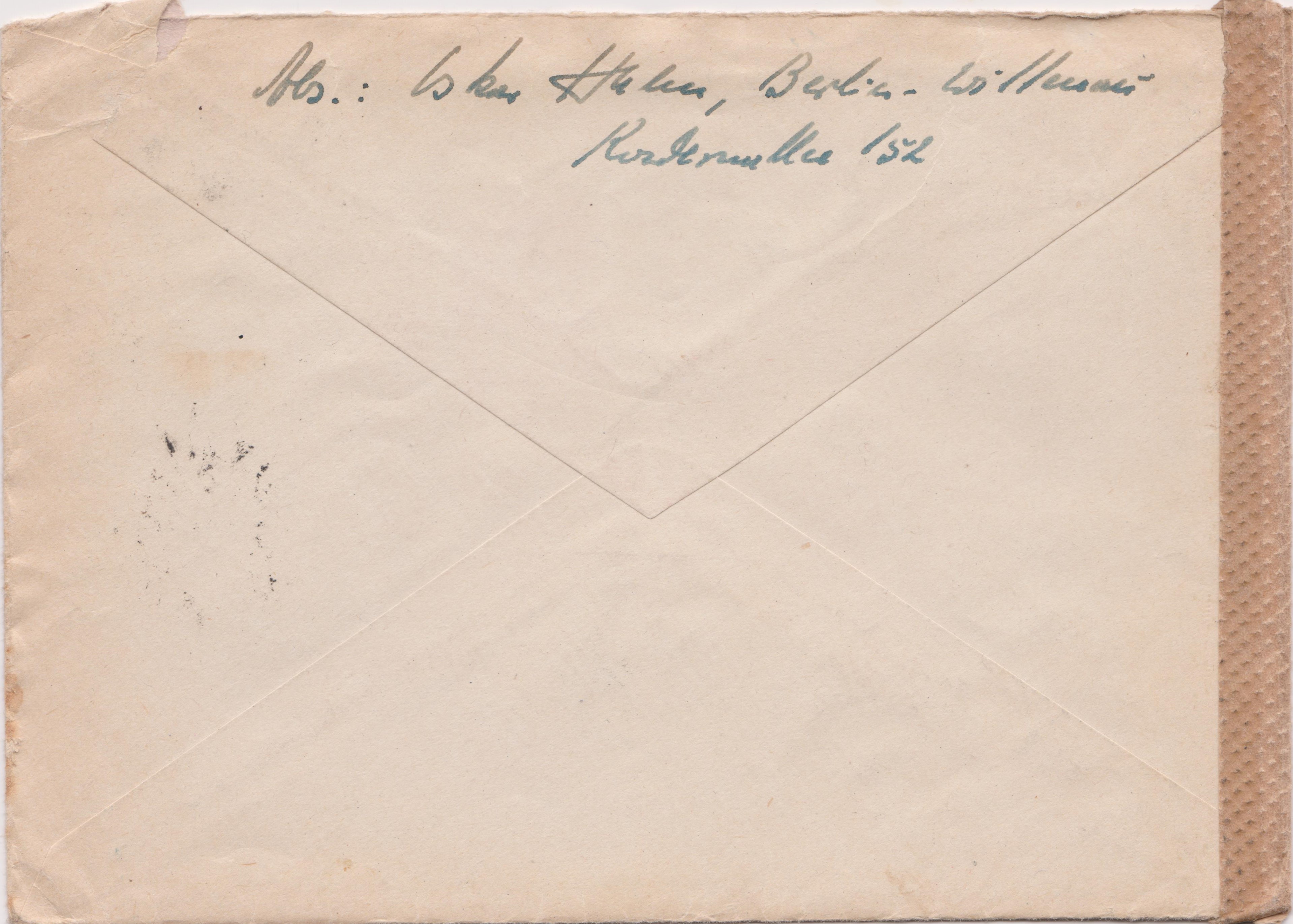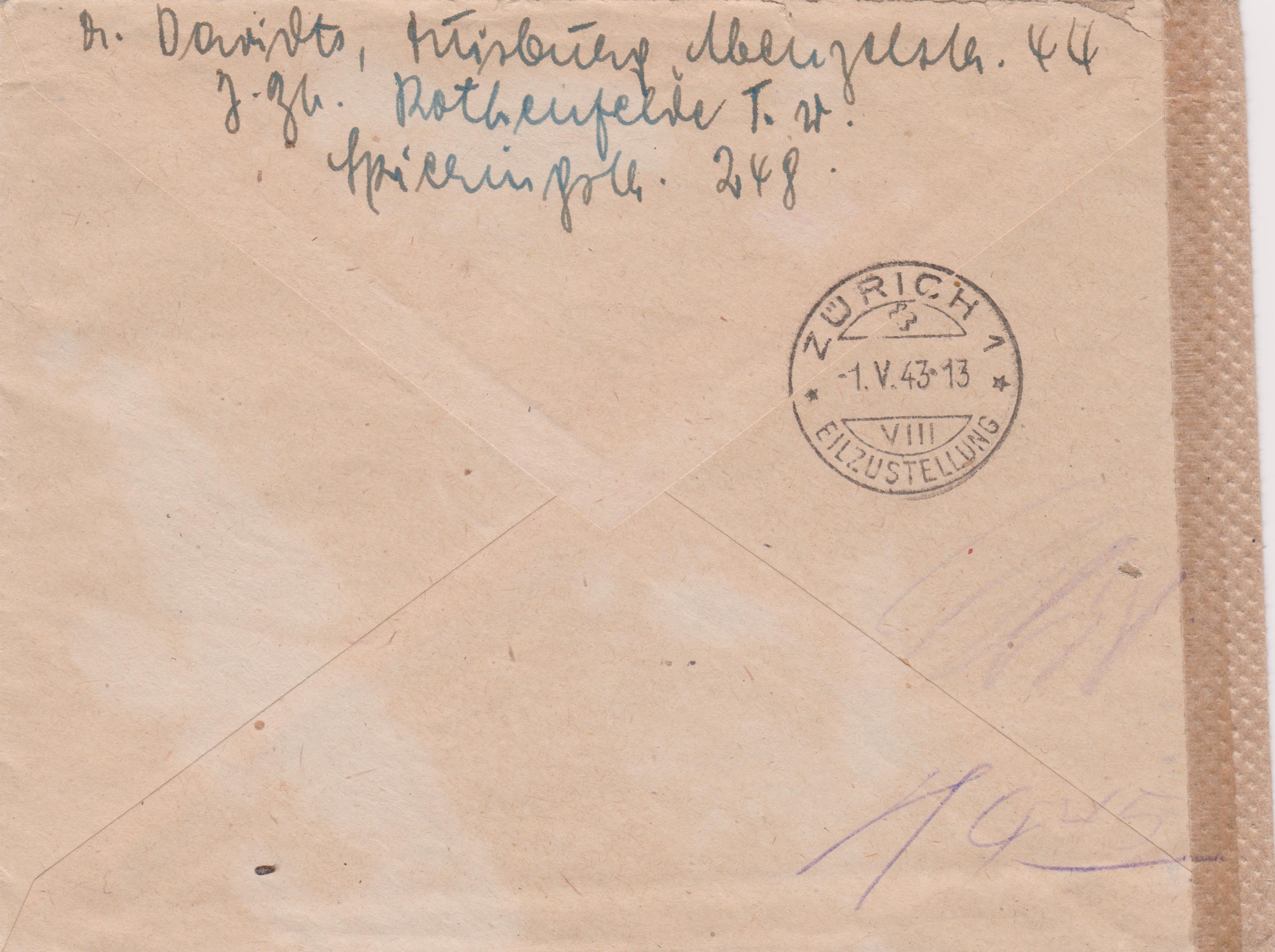 Der Brief kam dann laut rückseitig abgeschlagenem Tagesstempel am 01.05.1943 um 13 Uhr in Zürich an und wurde per "Eilzustellung" dem Empfänger zugestelt.