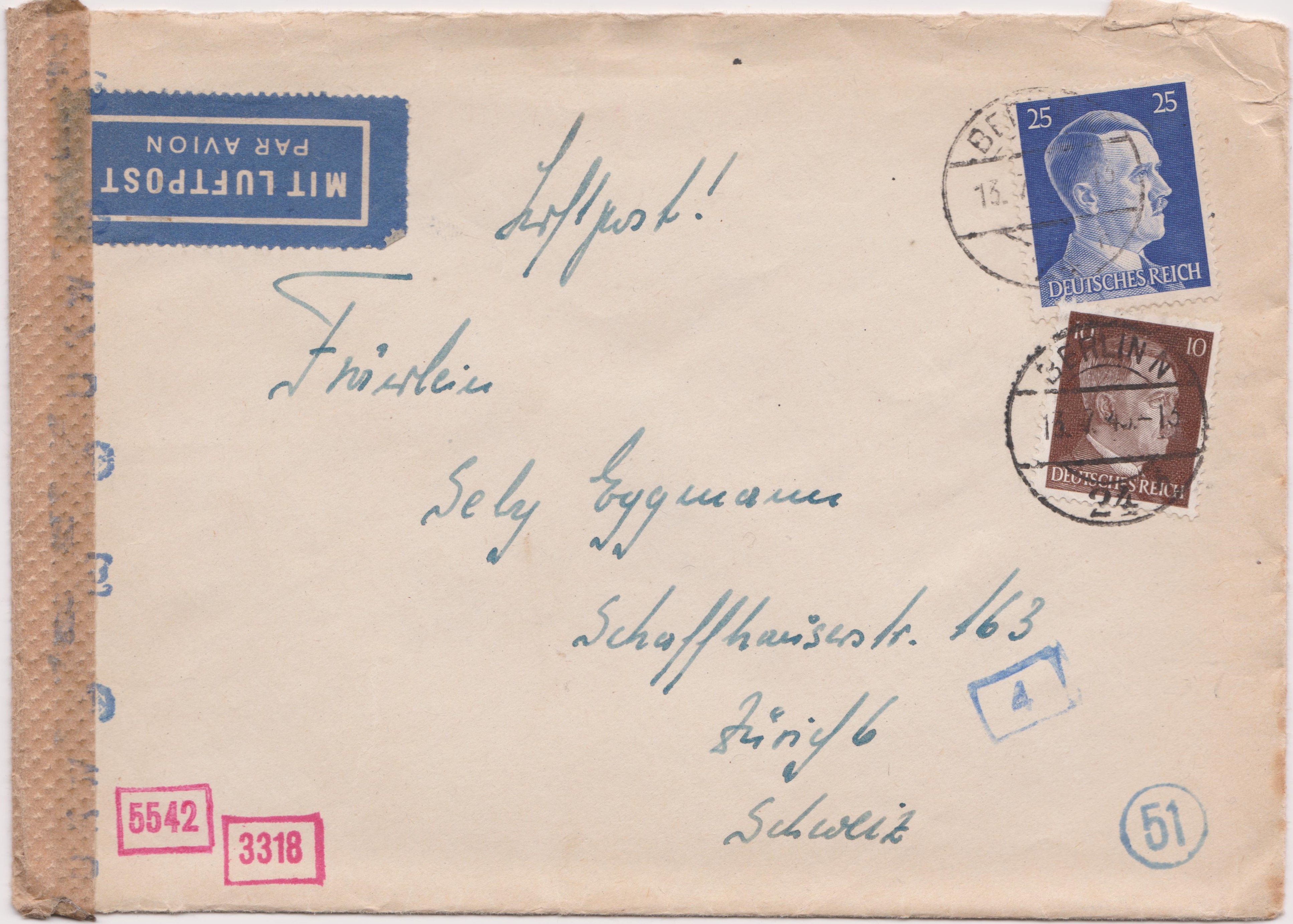Dieser nach Zürich adressierte Brief (25 Pfennig) per Luftpost (10 Pfennig) wurde am 13.07.1943 in BERLIN 24 aufgegeben: