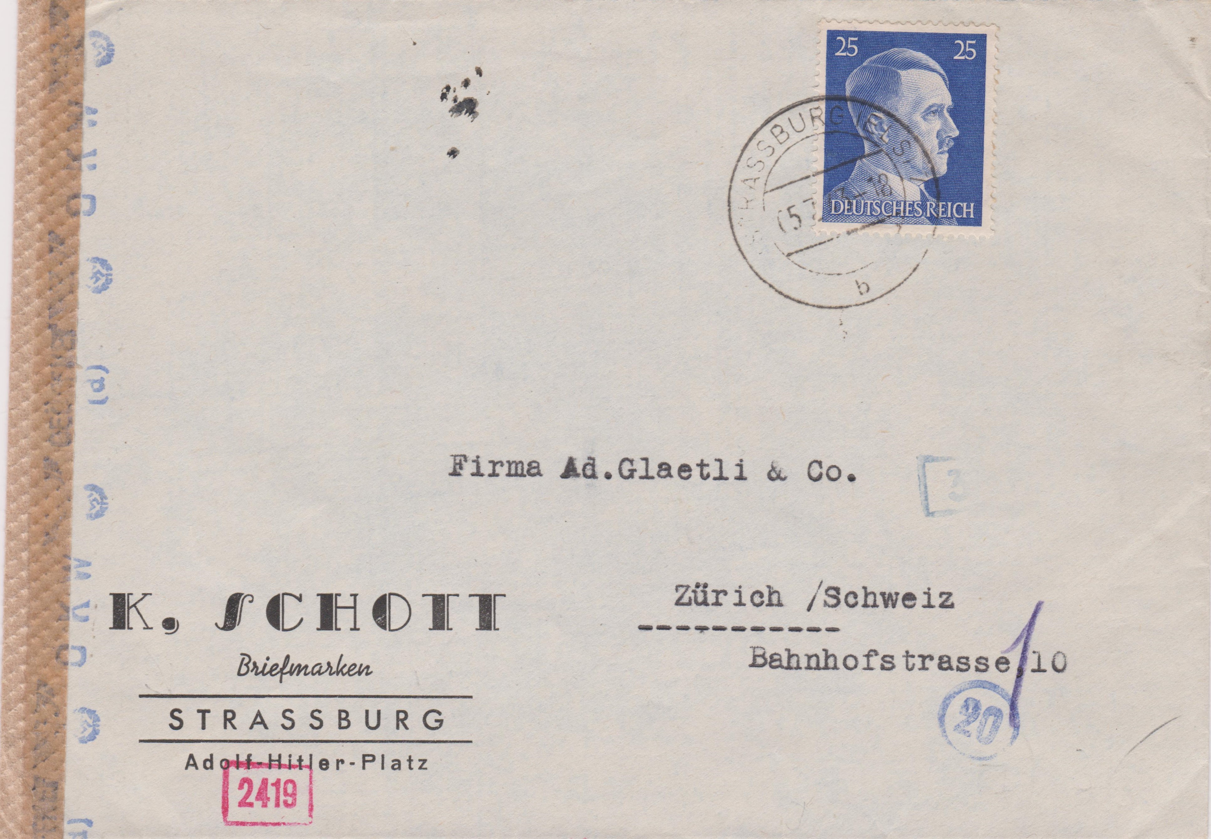 Dieser am 05.07.1943 in STRASSBURG aufgegebene Brief nach Zürich durchlief die ab April 1943 für Sendugen in die Schweiz zuständiger ABP München, wo dieser Brief linksseitig geöffnet und nach erfolgter Prüfung in der ABP München mit einem neutralen, 45° diagonal geriffelten Streifen der Briefverschlussvorrichtung, Landsmann DVB1.2, verschlossen, was ein Stempel der Briefverschlußvorrichtung Landsmann DPB1.2 dokumentiert: