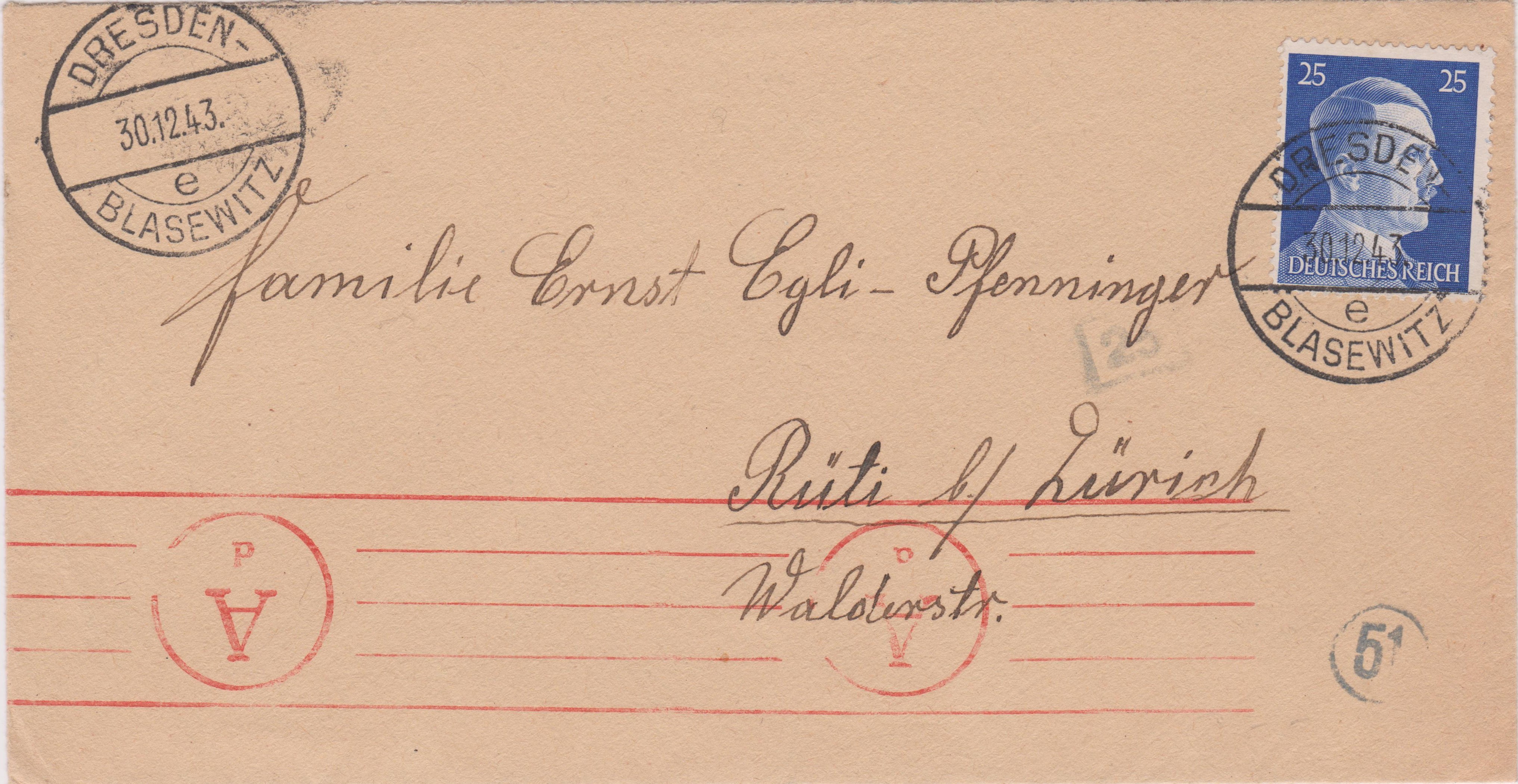 Dieser nach "Rüti bei Zürich" adressierte Brief wurde am 30.12.1943 in DRESDEN-BLASEWITZ an Postschalter aufgegeben, was der Blankoabschlag des Tagesstempels dokumentiert:
