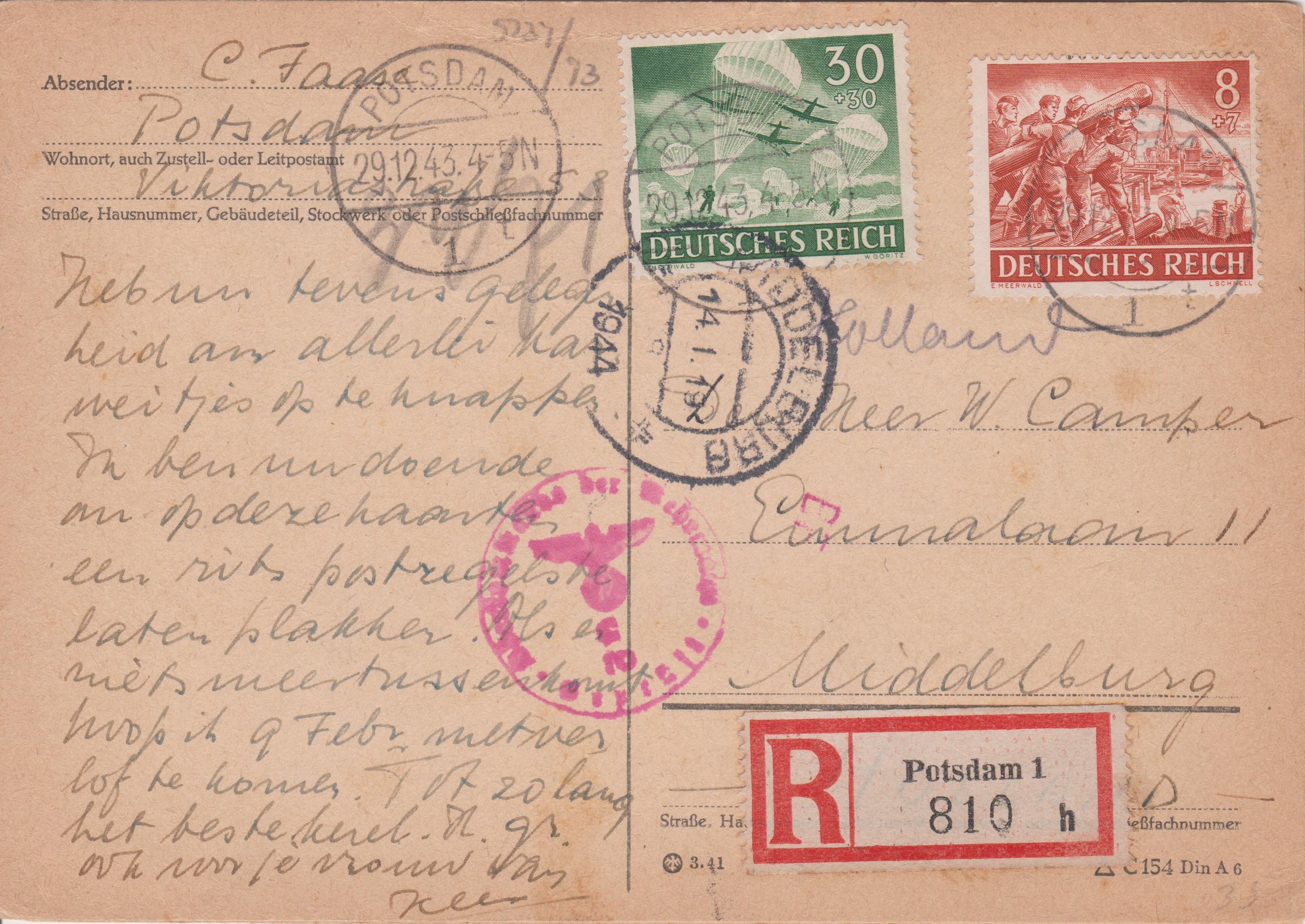 Postkarte per Einschreiben nach "Middelburg" in Holland, frankiert mit 38 Pf, aufgegeben am 29.12.1943 in POTSDAM 1:
