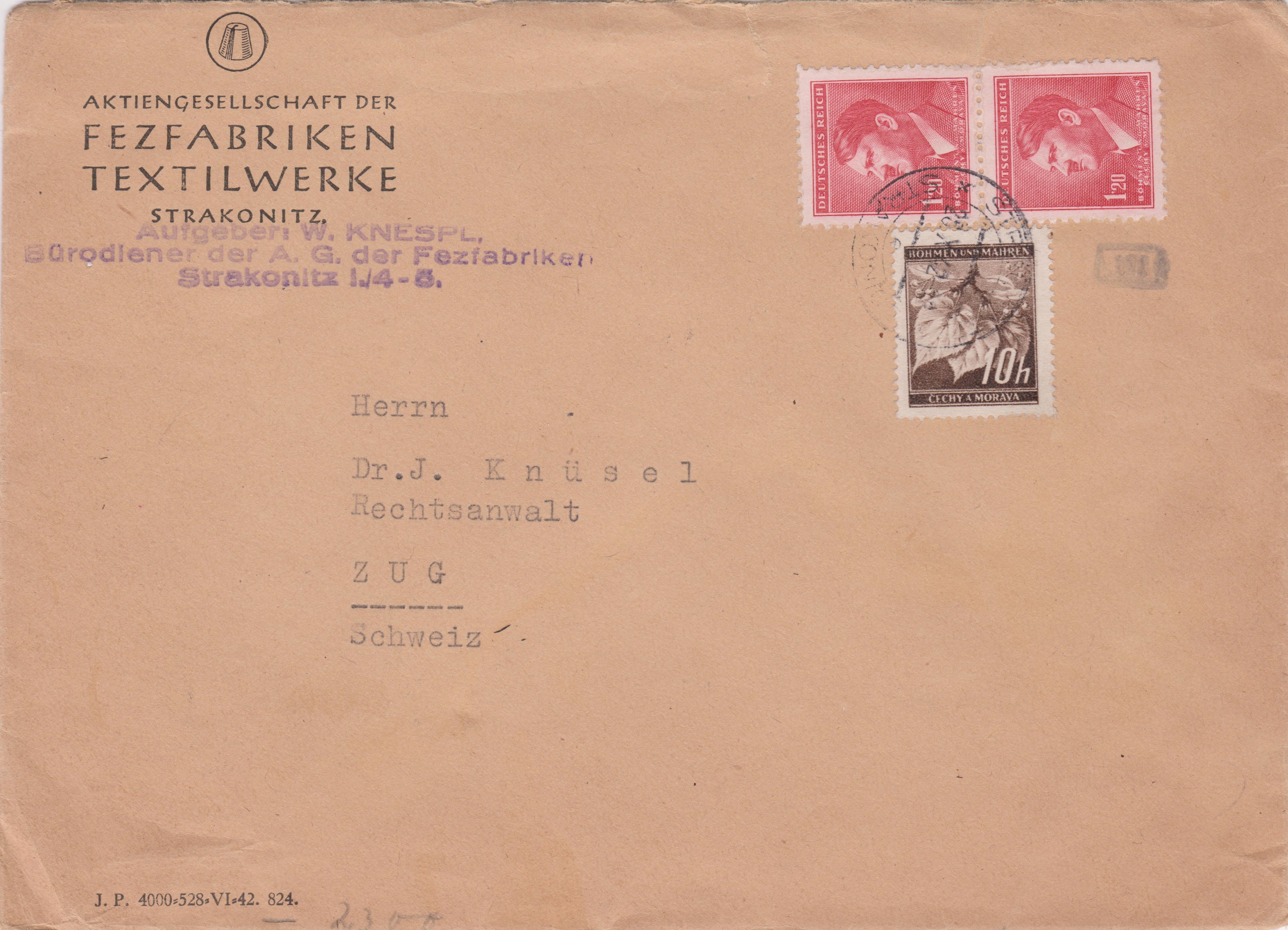 Brief, adressiert nach "ZUG" in der Schweiz, aufgegeben an 28.10.1942 in "STRAKONITZ" (BÖHMEN UND MÄREN):