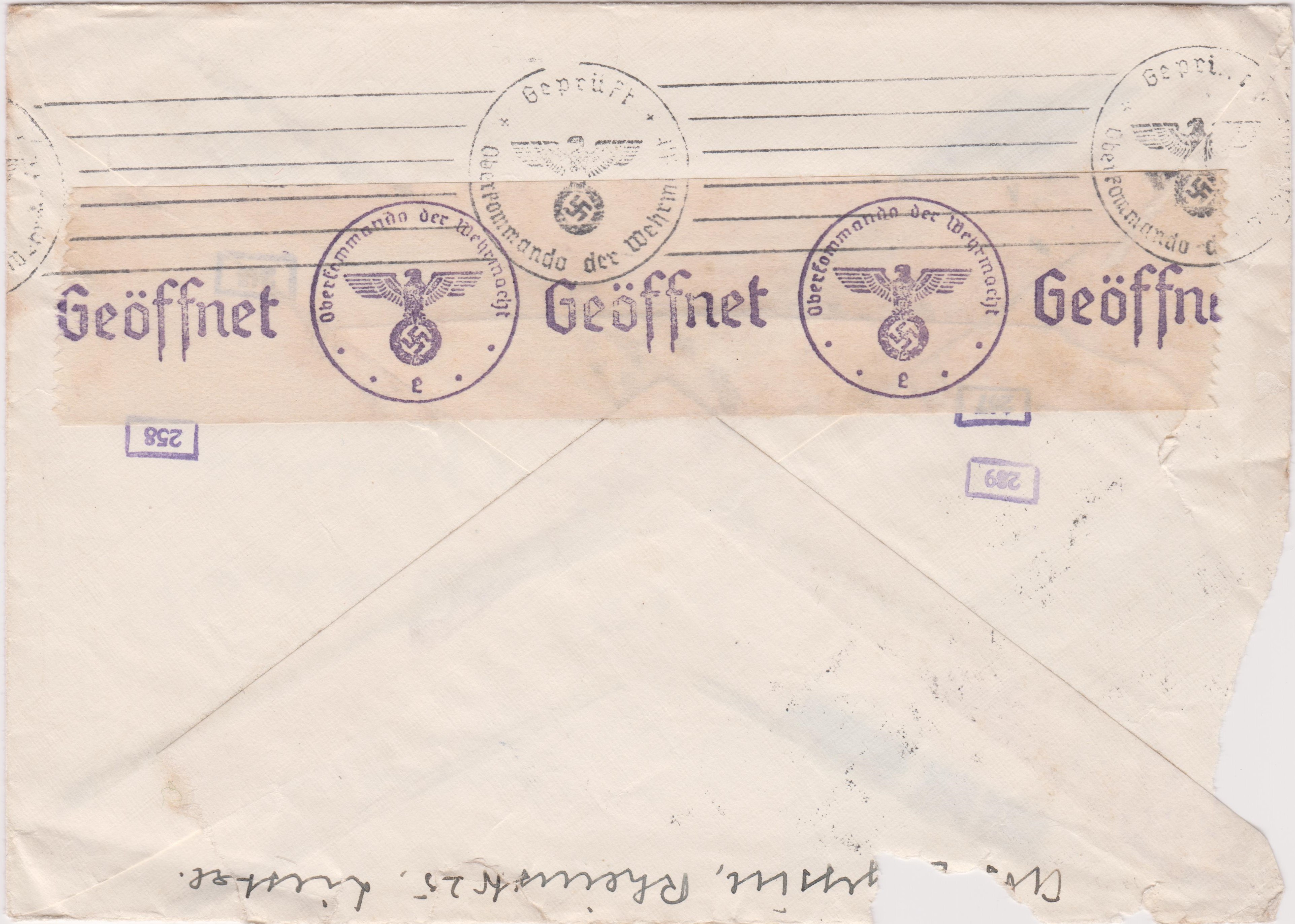 Der Brief wurde der für Post in die Schweiz zuständigen ABP Frankfurt zugeleitet, wo er rückseitig geöffnet und nach erfolgter Kontrolle mit einem Verschlußstreifen wieder verschlossen wurde, was zwei Abschläge eines Handprüfstempels in Rot dokumentieren.