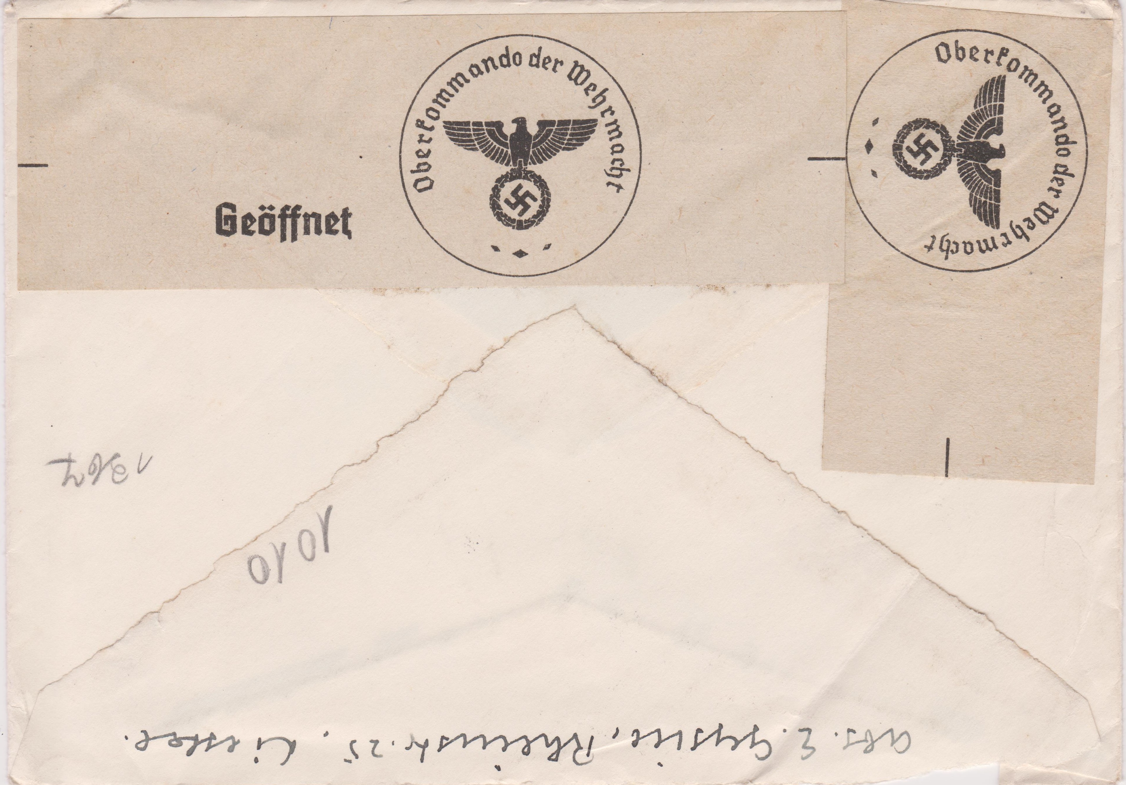 Der Brief wurde der ABP Frankfurt zugeleitet, wo er rückseitig geöffnet und nach erfolgter Prüfung mit einem Verschlußzettel, Landsmann EV2.3, wieder verschlossen wurde. Rückseitig zwei vierstellige Prüfervermerke in Bleistift "1209" sowie "1730".