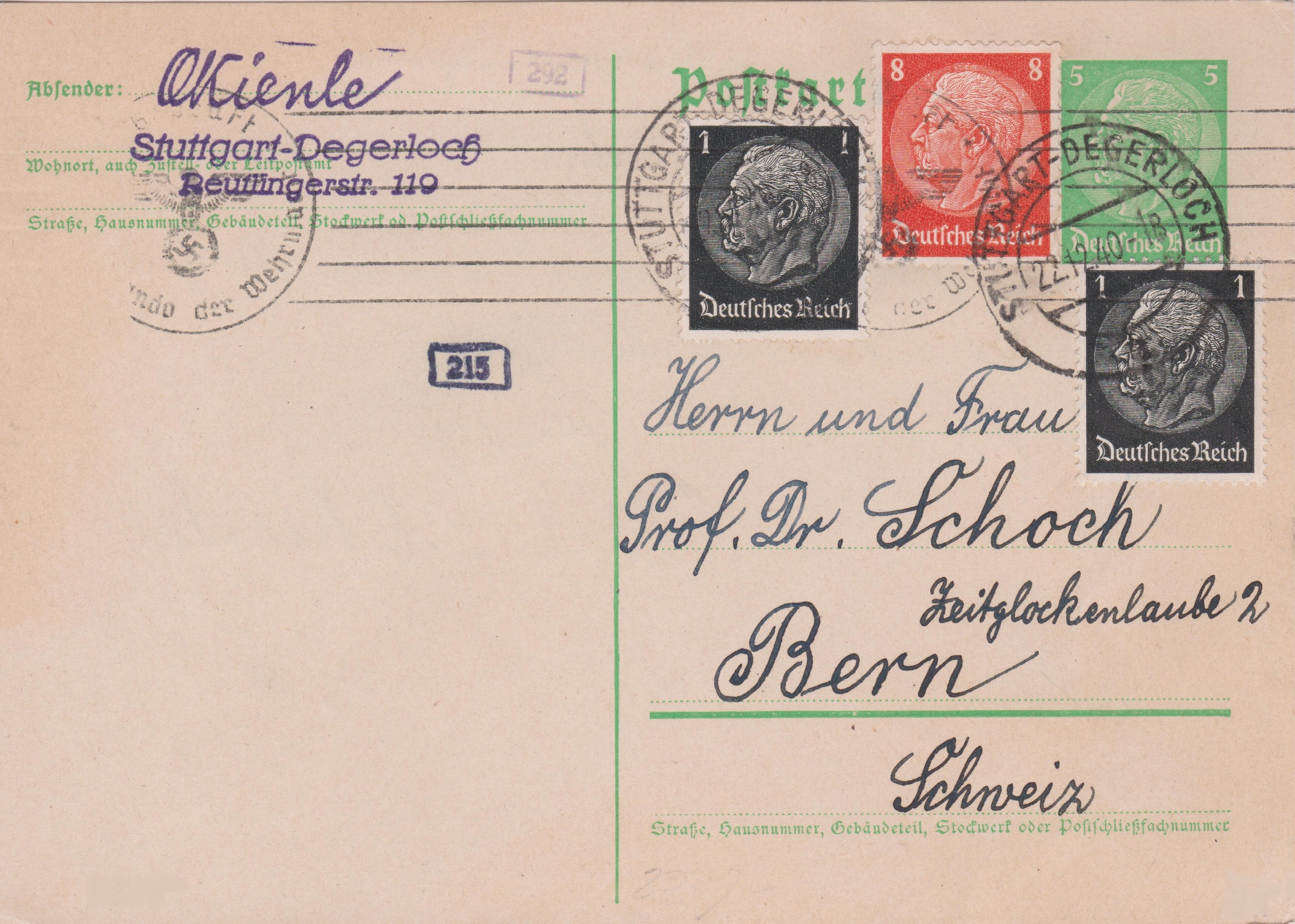 Postkarte mit Eindruck 5 PfDauerserie Hindenburg mit Zusatzfrankatur 10 Pf Hindenburg ergibt die Portostufe 15 Pf für eine Postkarte in die Schweiz, aufgegeben am 22.12.1940 in STUTTGART: