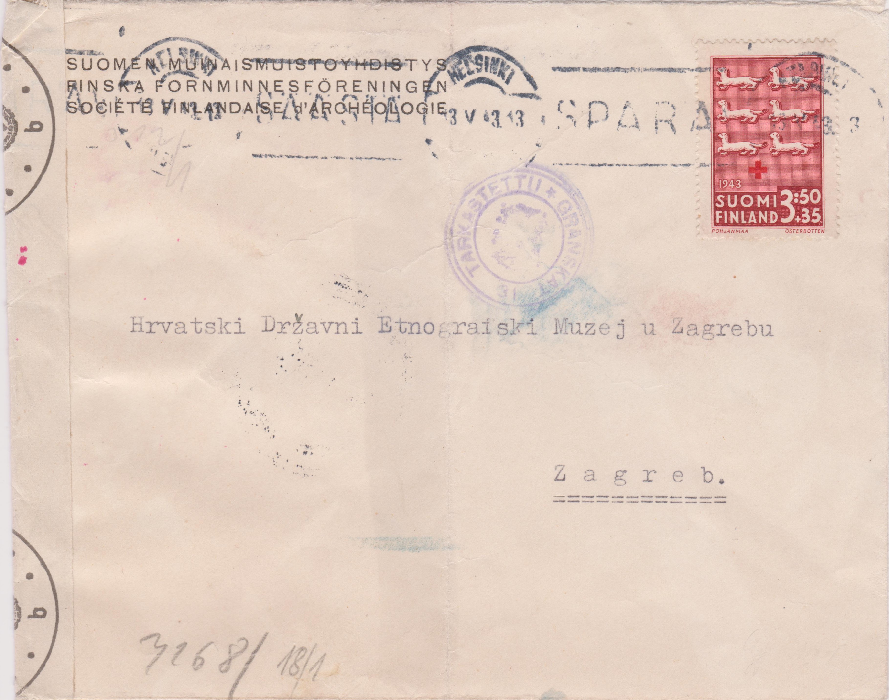Dieser nach Zagreb adressierte Brief wurde 1943 in Helsinki in Finnland aufgegeben: