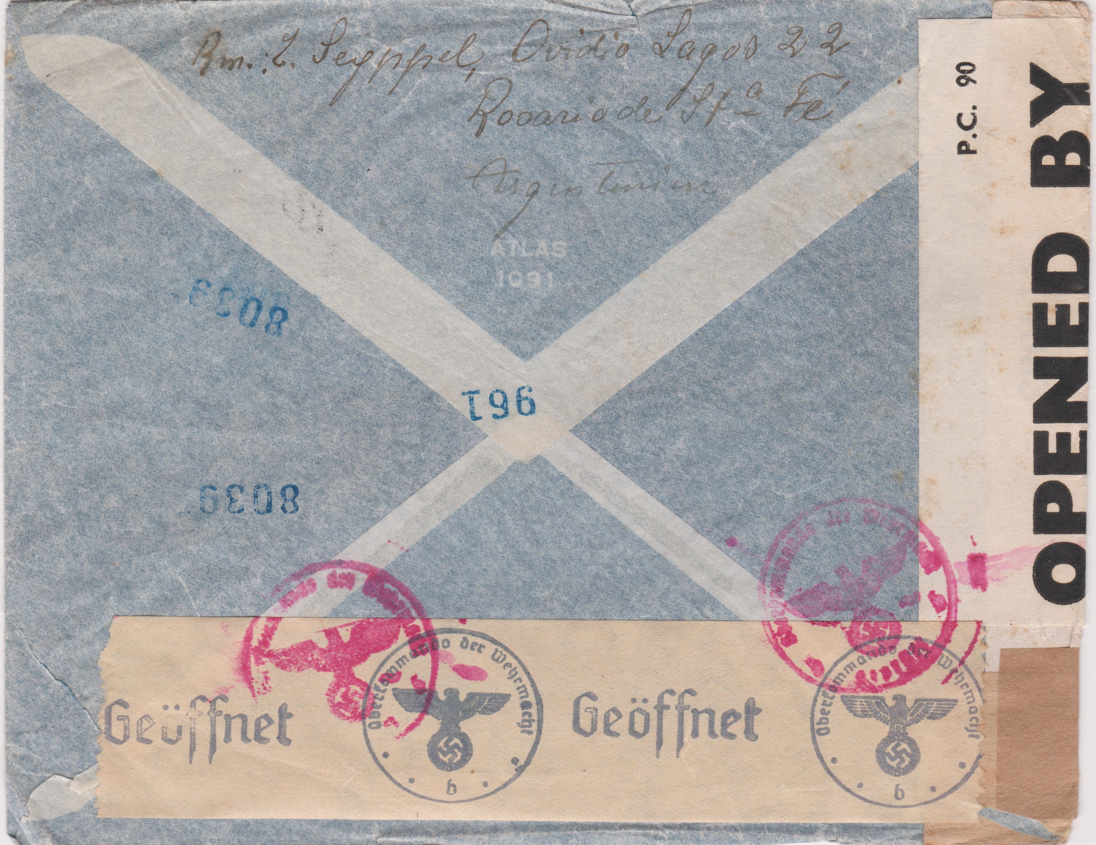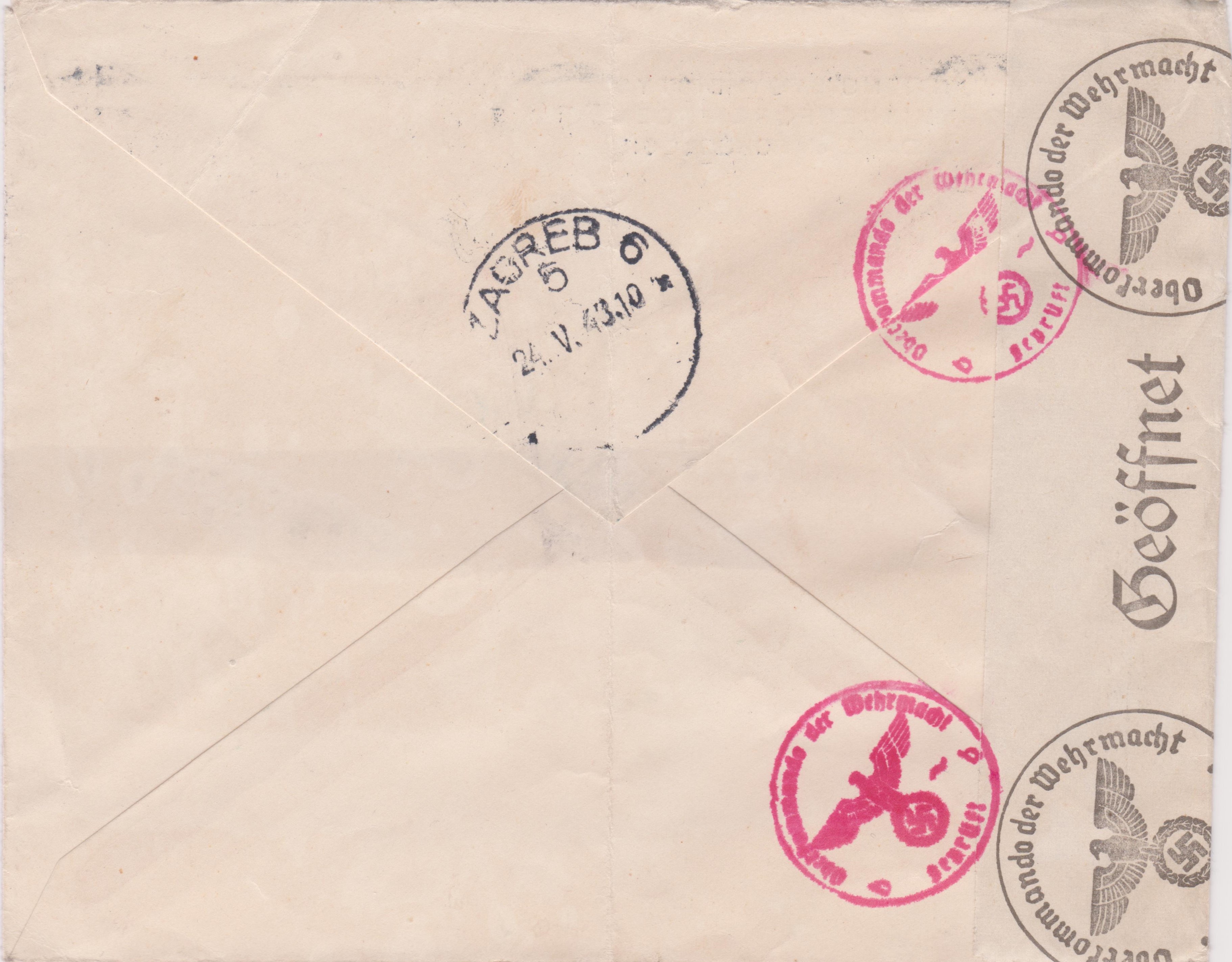 Im Deutschen Reich war für Tansitpost die ABP Berlin zuständig. Dort wurde der Beleg rechtsseitig geöffnet und nach erfolgter Zensur mit einem Klebestreifen wieder verschlossen, was ein Prüfstempel in Rot "Oberkommando der Wehrmacht geprüft b" dokumentiert.