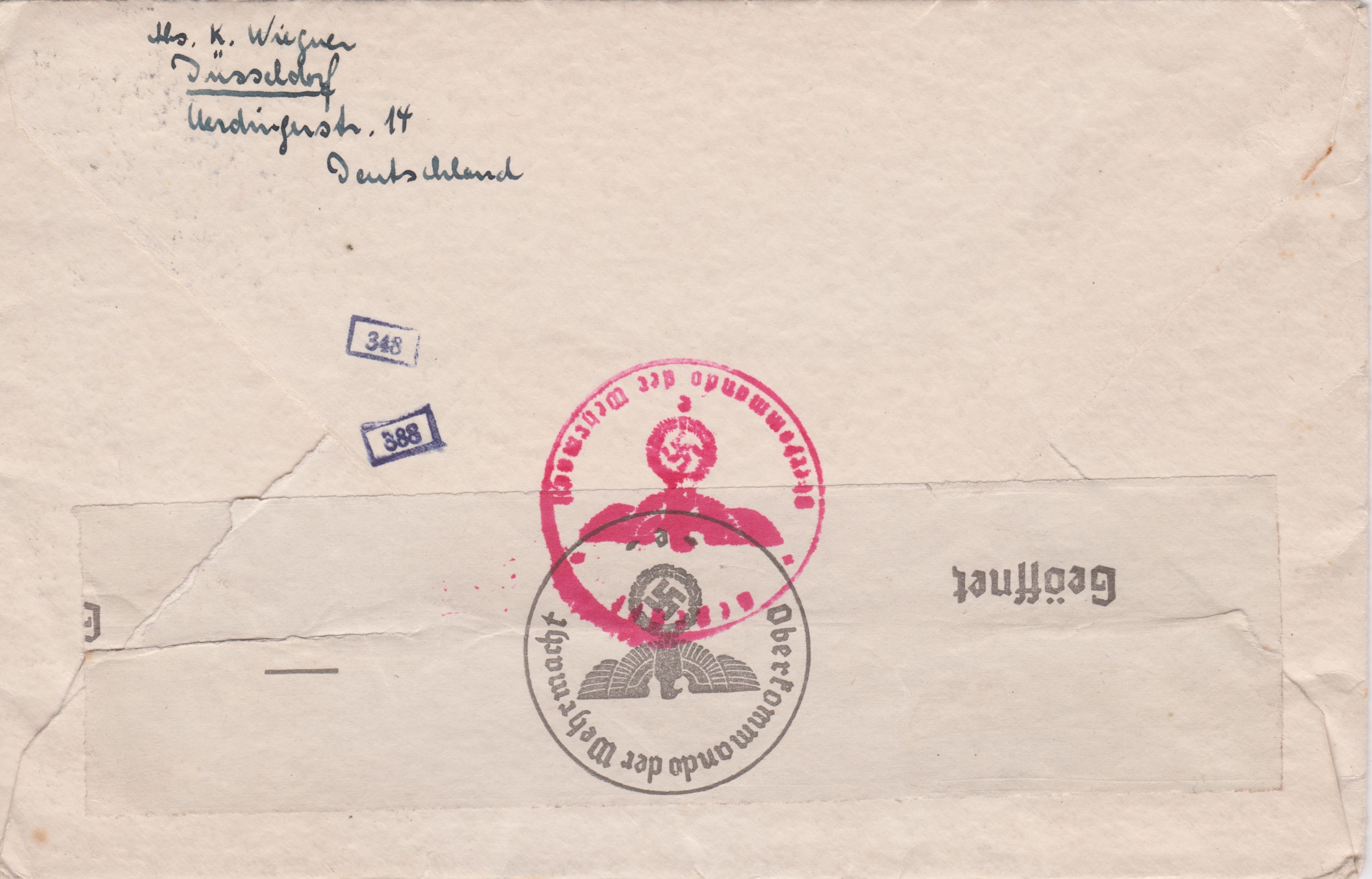 Der Brief wurde der ABP Frankfurt zugeleitet, wo er rückseitig geöffnet und nach erfolgter Prüfung mit einem Verschlußstreifen, Landsmann EV3.2, wieder verschlossen wurde, was ein Prüfstempel in Rot, Landsmann EP3.1, dokumentiert.