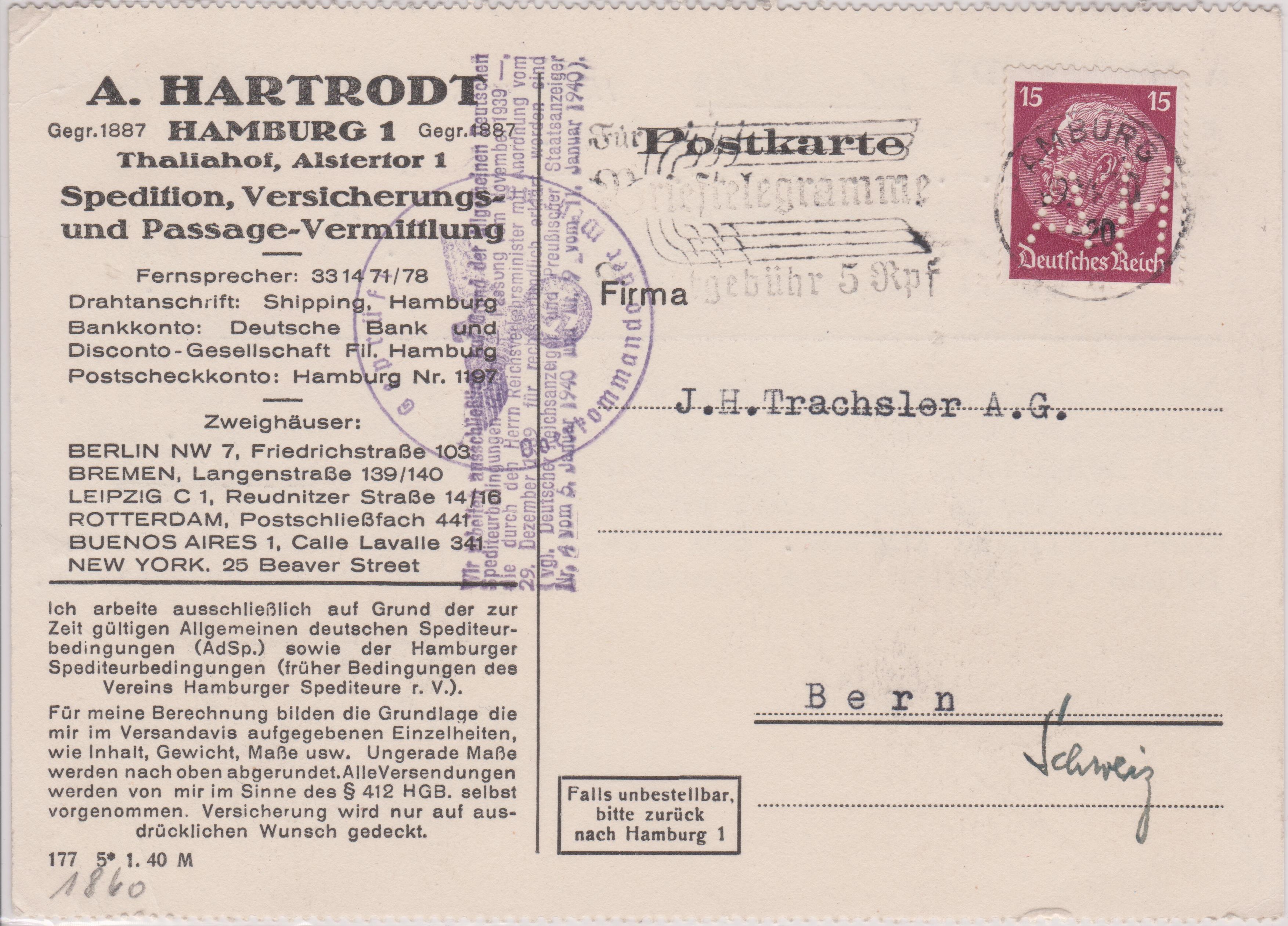Postkarte nach Bern in der Schweiz, Portostufe 15 Pf, freigemacht per Einzelfrankatur mit 15 Pf der Dauerserie Hindenburg mit Firmenlochung "AH" = A. HARTRODT am 19.04.1940: