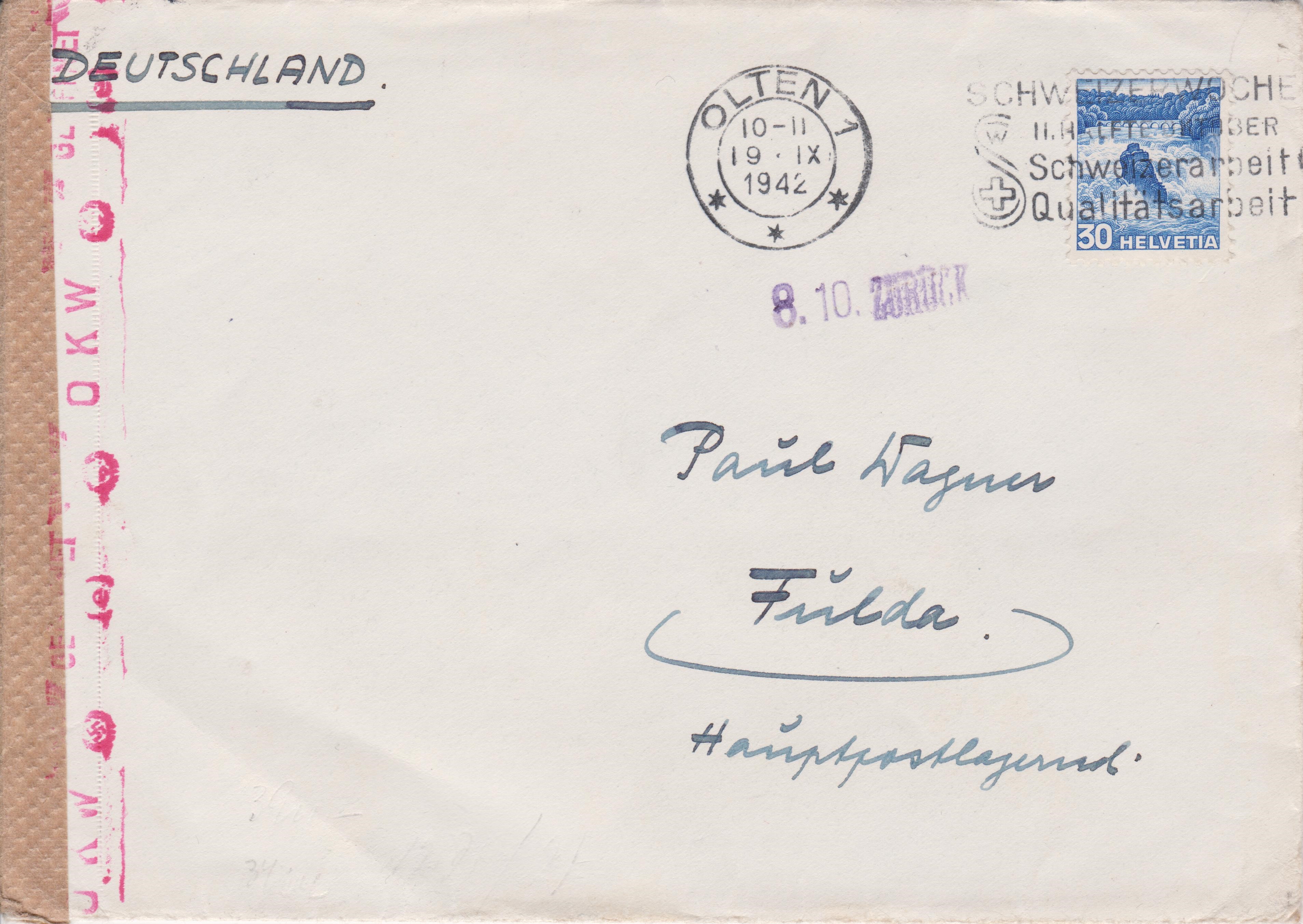 Brief, adressiert nach "Fulda Hauptpostlagernd", aufgegeben in OLTEN 1 am 19.09.1942: