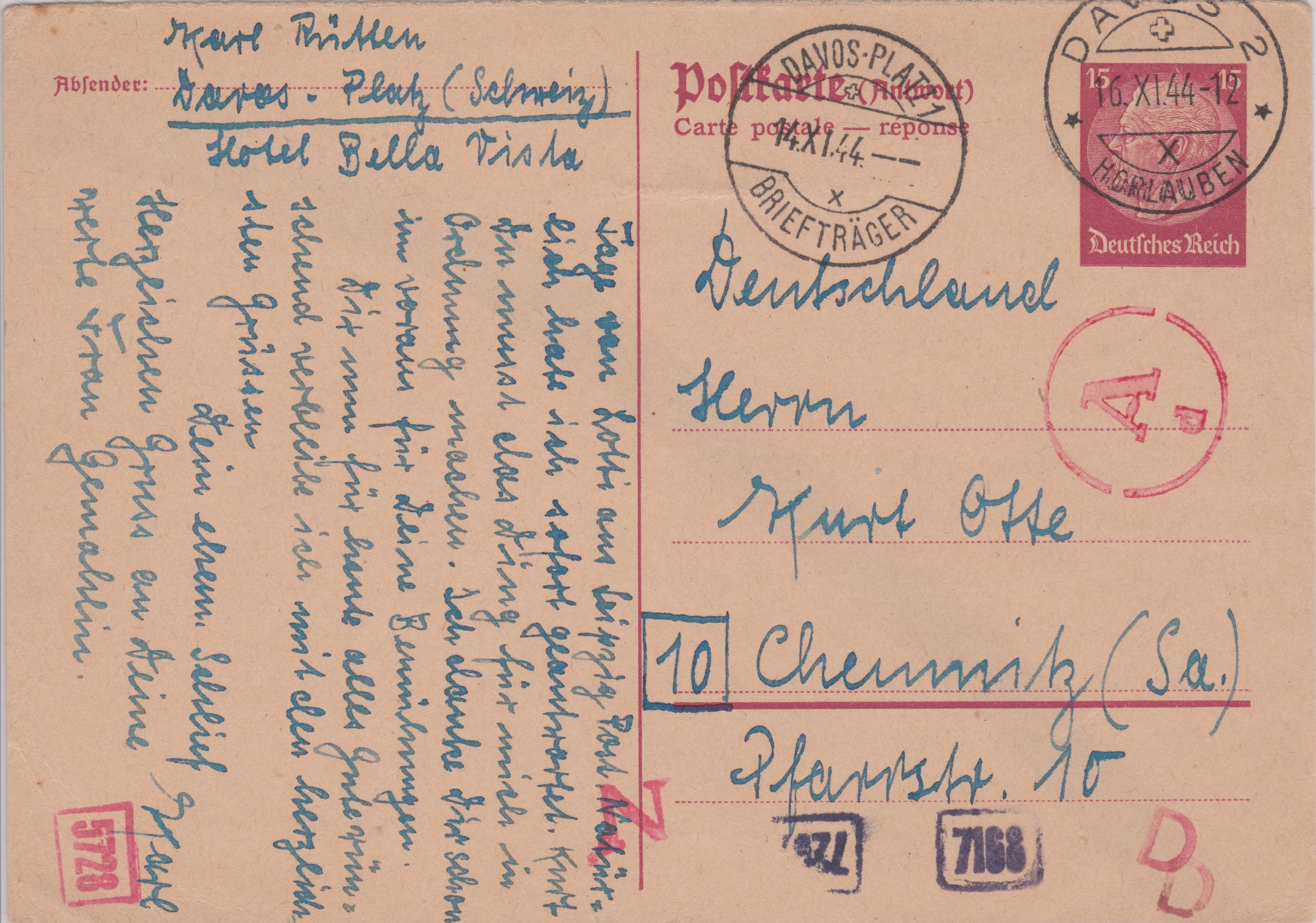 Antwortkarte aus dem Deutschen Reich mit Postwertzeicheneindruck 15 Pfennig Hindenburg, MiNr. P 230 I A, adressiert nach Chemnitz, gebraucht am 16.11.1944 ab "DAVOS":