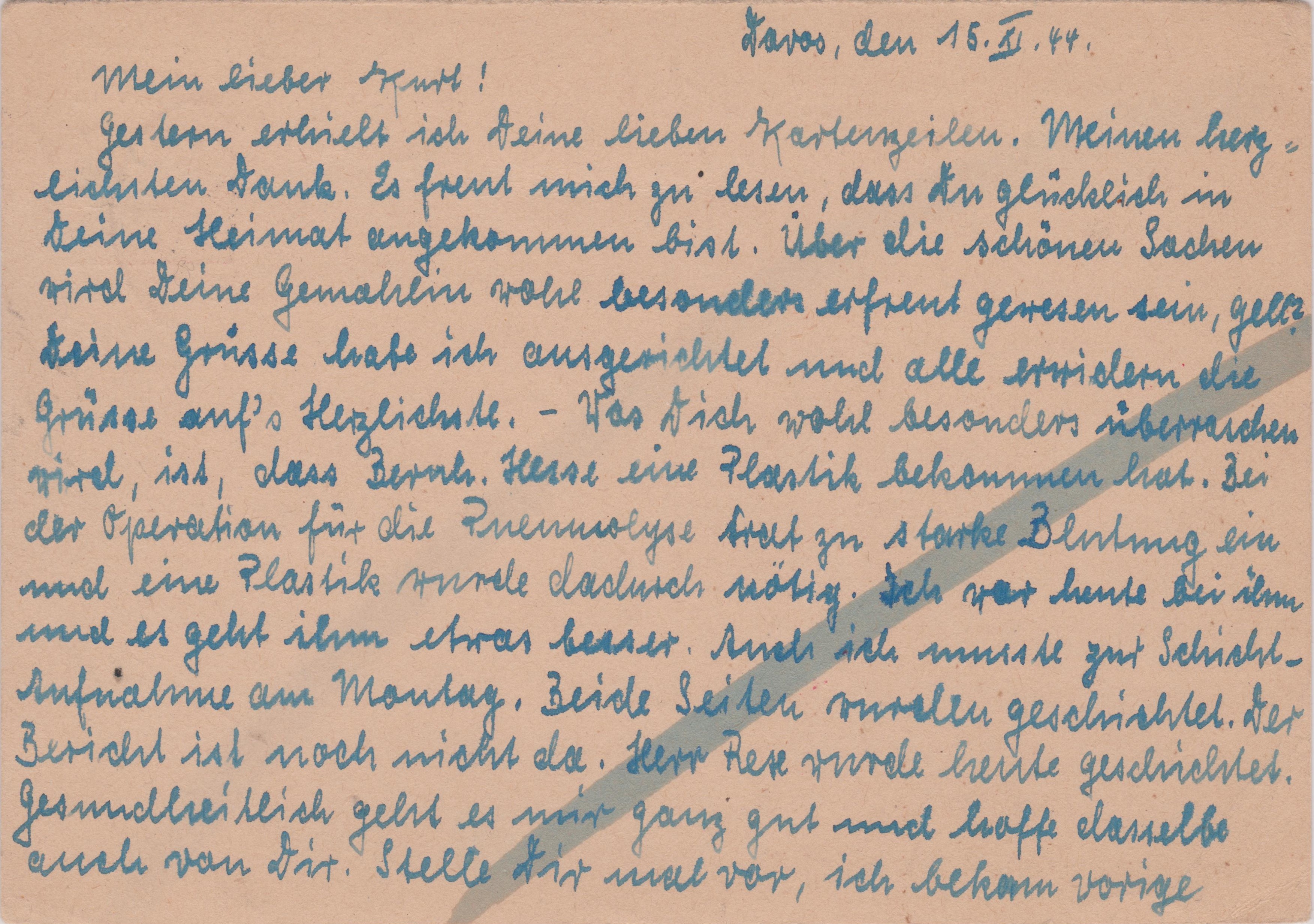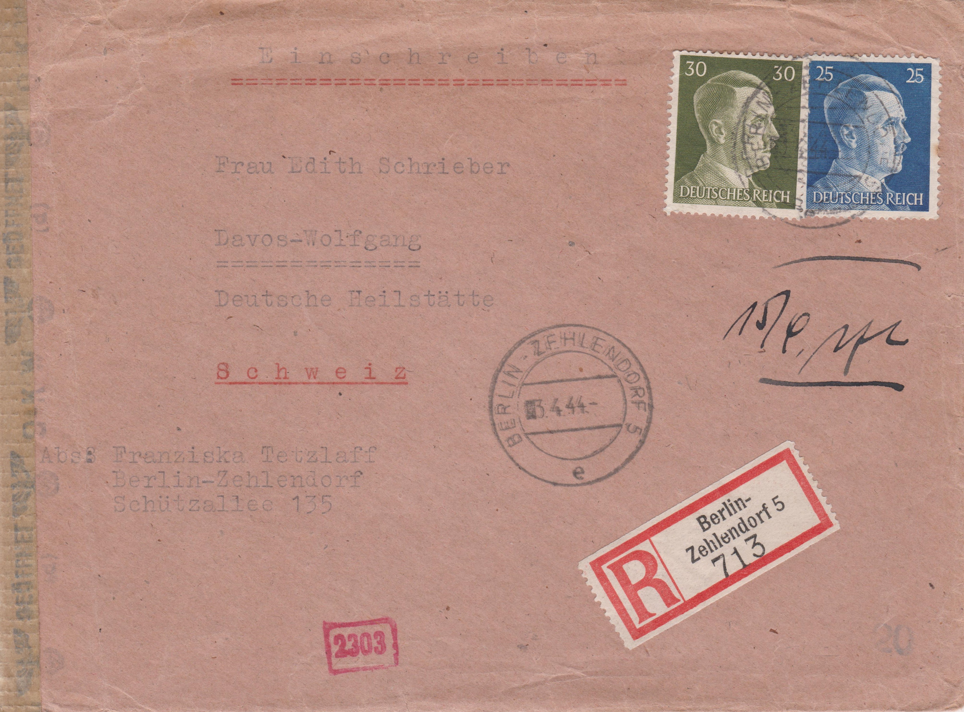 Dieser nach "Davos-Wolfgang" adressierte Brief wurde per Einschreiben am 03.04.1944 in BERLIN-ZEHLENDORF eingeliefert: