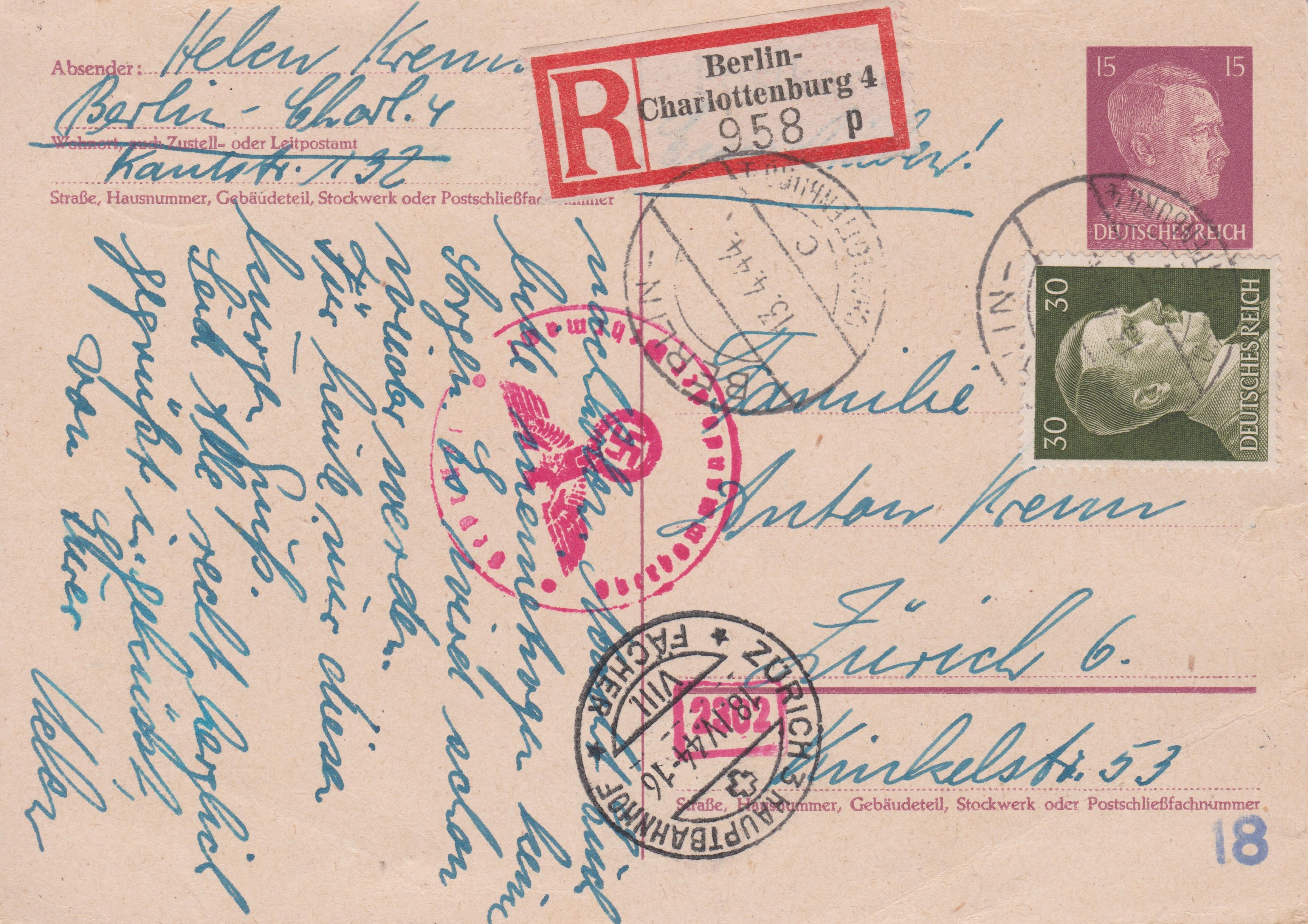 Postkarte, adressiert nach Zürich in der Schweiz, Porto 15 Pf, per Einschreiben, Porto 30 Pf, als Ganzsache mit Zusatzfrankatur am 13.04.1944 aufgegeben in BERLIN-CHARLOTTENBURG: