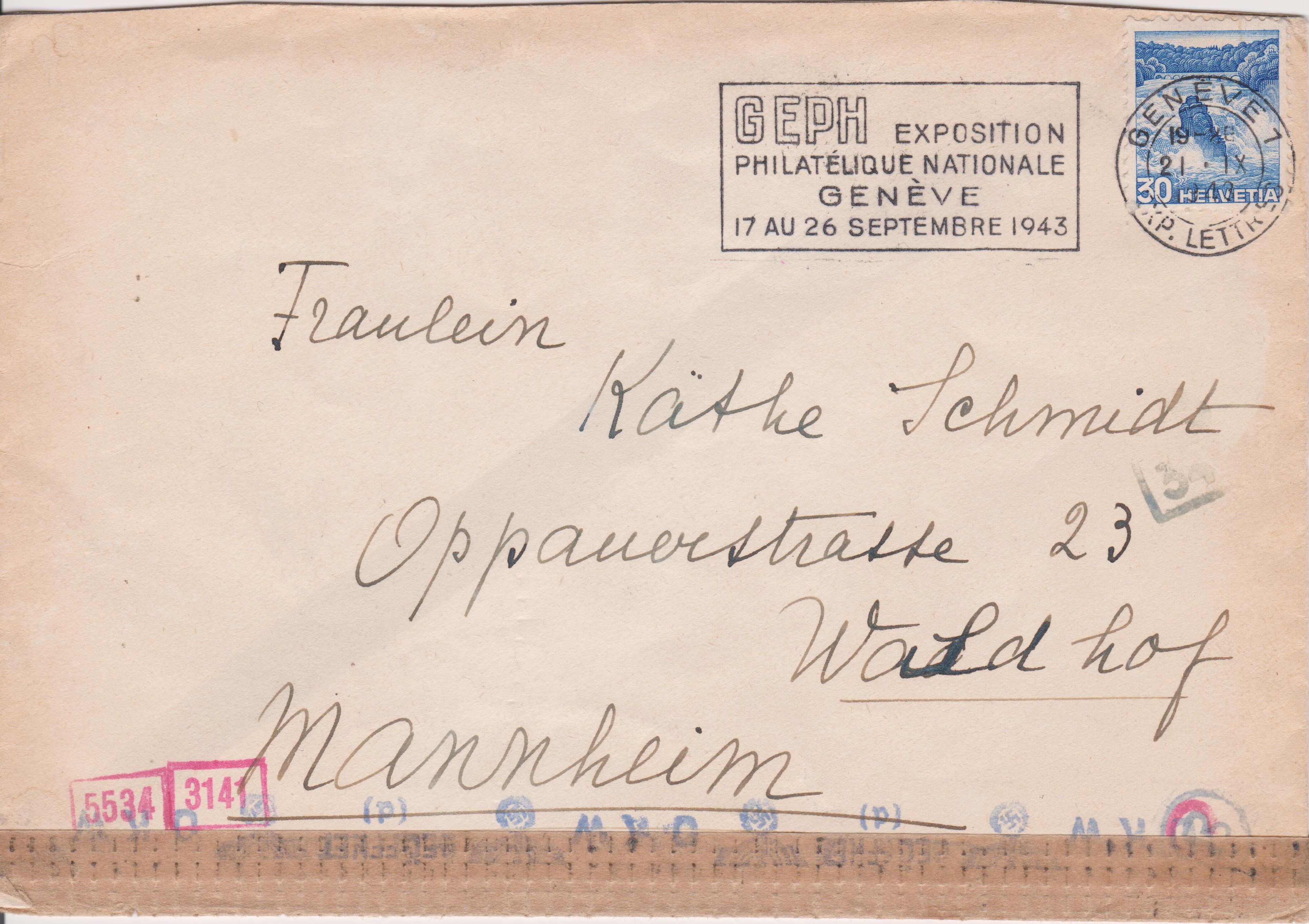 Dieser Brief nach Mannheim wurde am 21.09.1940 in GENEVE (= Genf) in der Schweiz aufgegeben: