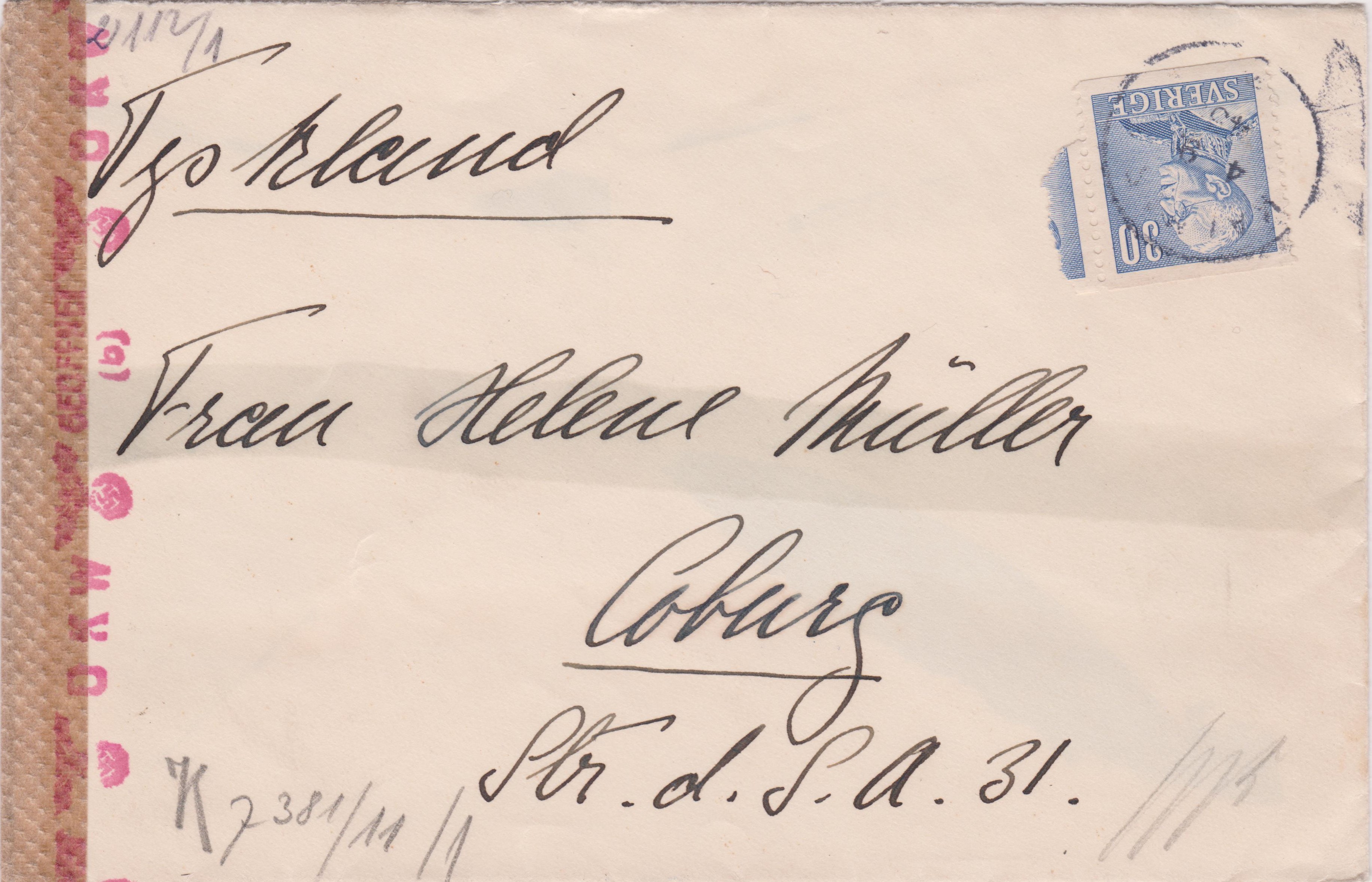 Dieser am 04.09.1943 in Schweden aufgegebene Brief wurde adressiert nach "Coburg Str. d. S. A." (1934 war in Coburg aus der "Mohrenstraße" die "Straße der SA“ geworden!):