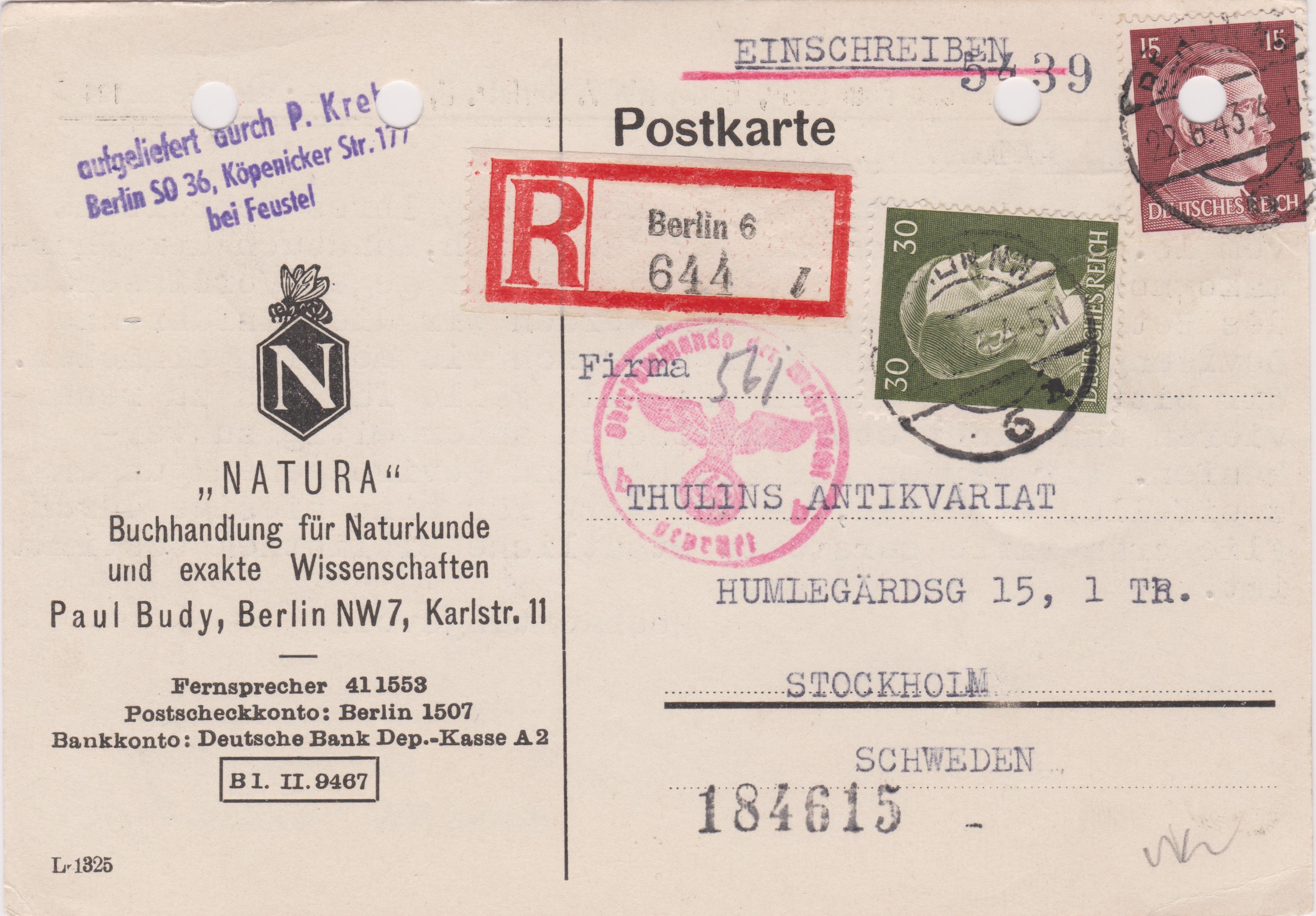 Postkarte per Einschreiben, aufgegeben am 22.06.1943 in BERLIN NW 6, adressiert nach "STOCKHOLM SCHWEDEN":
