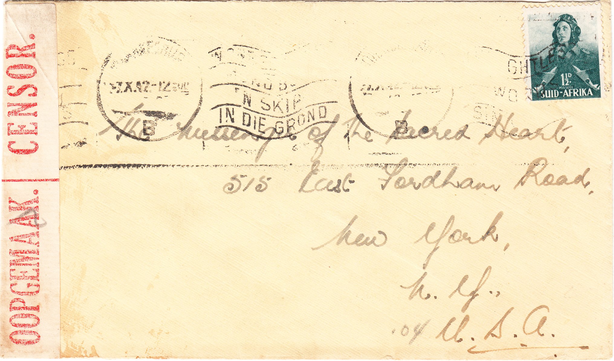 Dieser am 27.10.1942 in Johannesburg in Südafrika aufgegebene Beleg wurde linksseitig geöffnet und nach erfolgter Zensurierung mit einem zweisprachigen Verschlußzettel in Afrikaans/Englisch, "U.C. 8. (Klein.) U.C.8. (Small.) DEUR SENSOR OOPGEMAAK. OPENED BY CENSOR" wieder verschlossen: