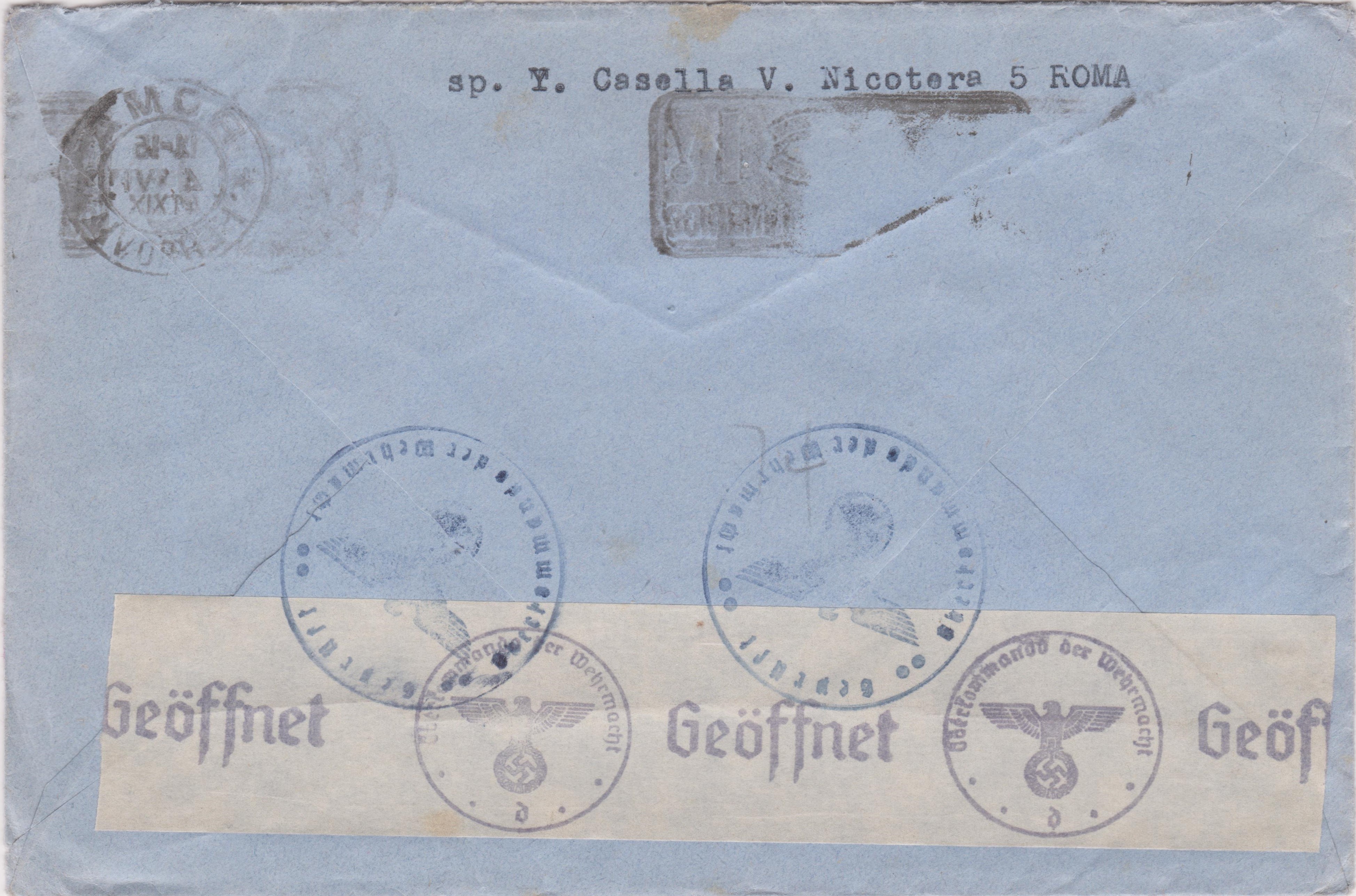 Der Brief durchlief die italienische Zensur, wo er dreiseitig geöffnet und nach erfolgter Prüfung mit Klebestreifen wieder verschlossen wurde.