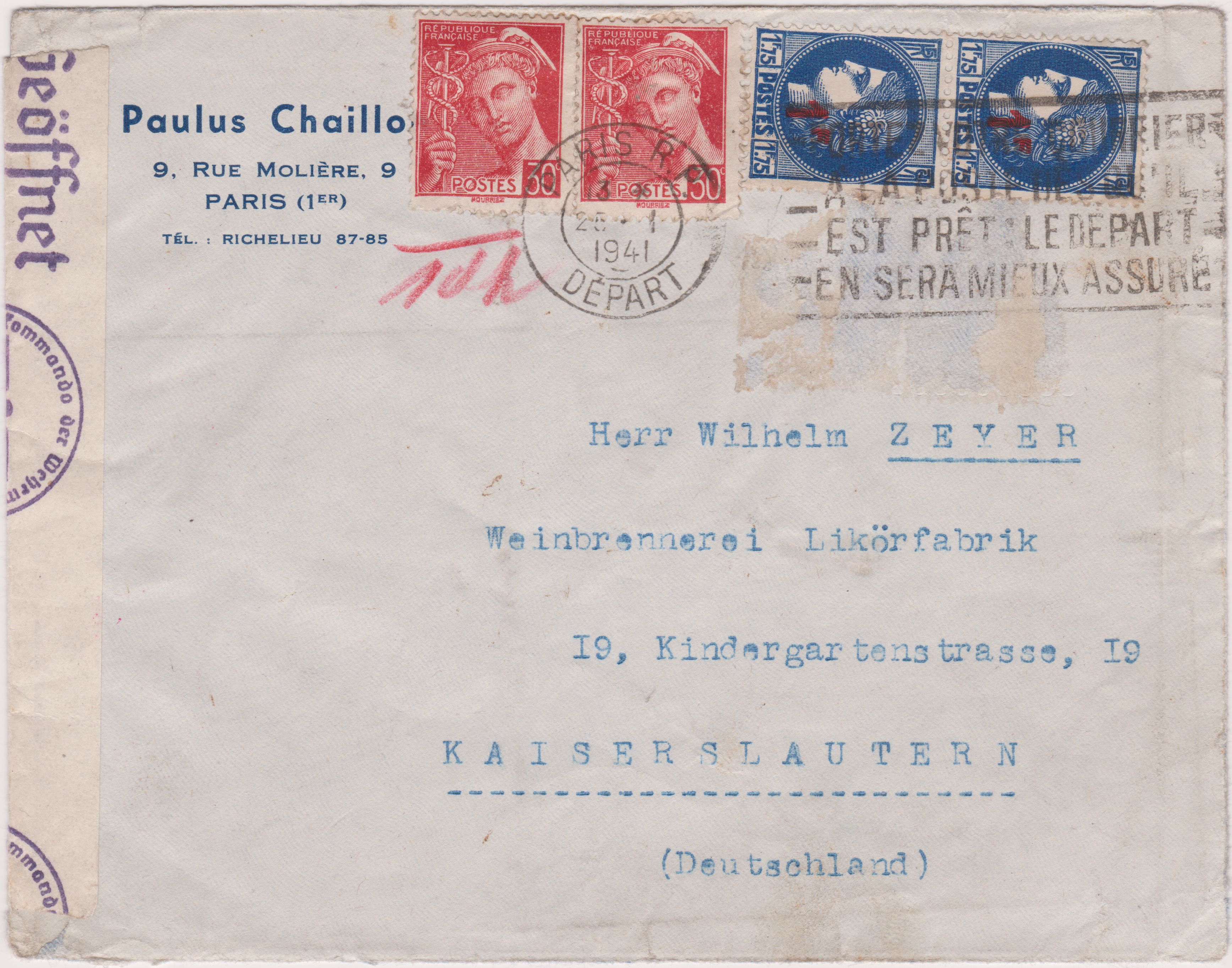 Hier ein am 25.01.1941 in Paris aufgegebener Brief, adressiert nach Kaiserslautern: