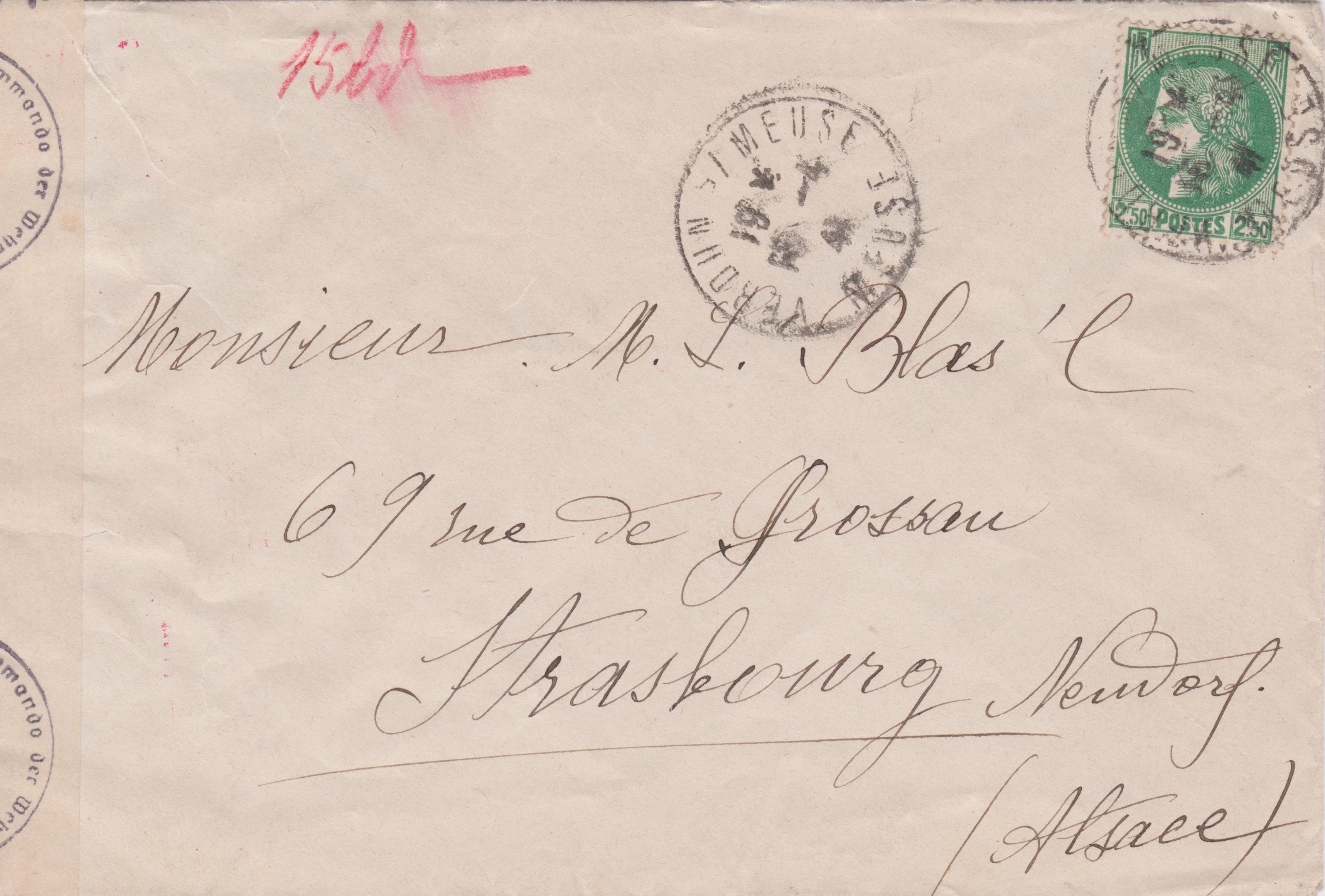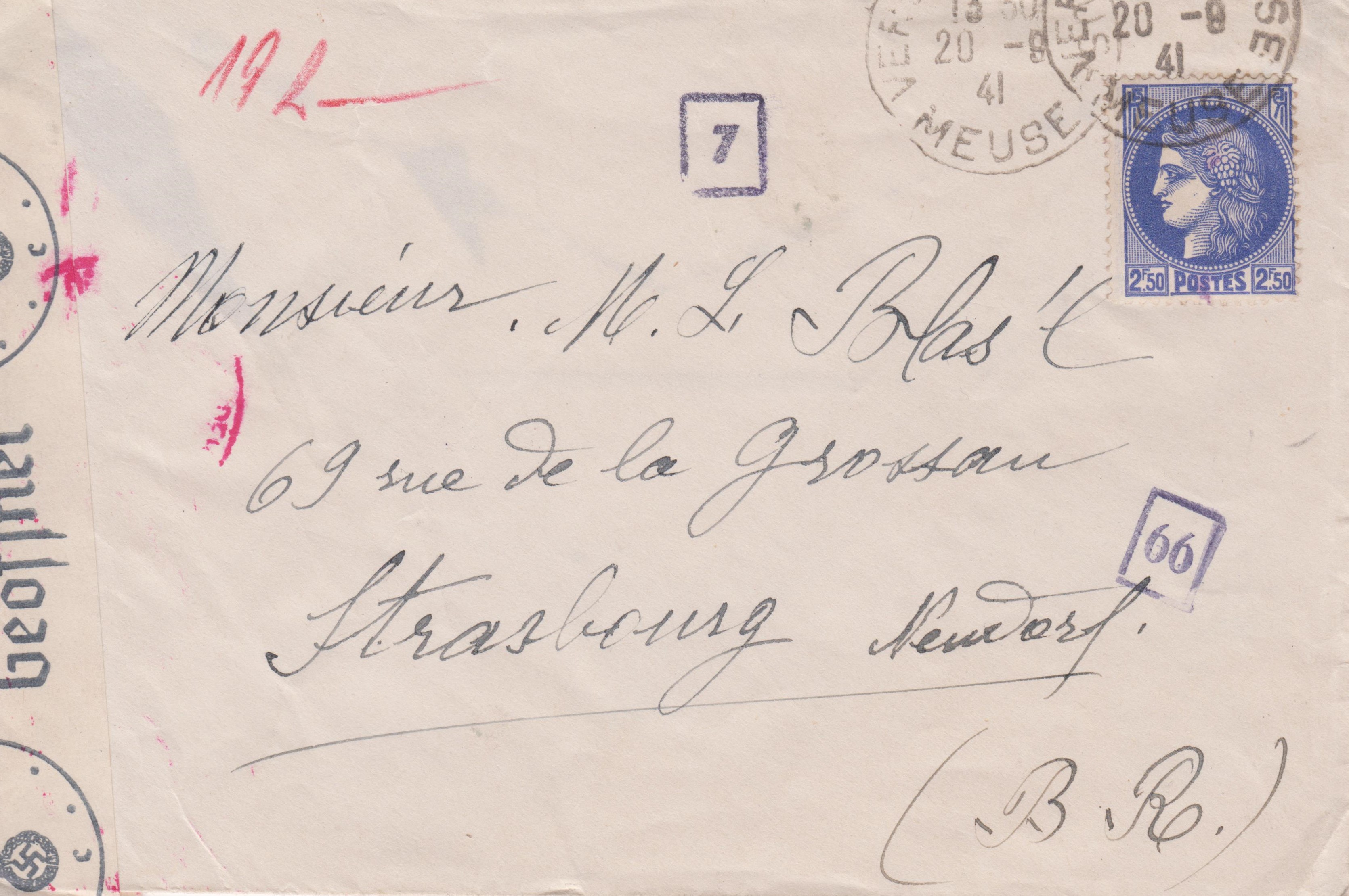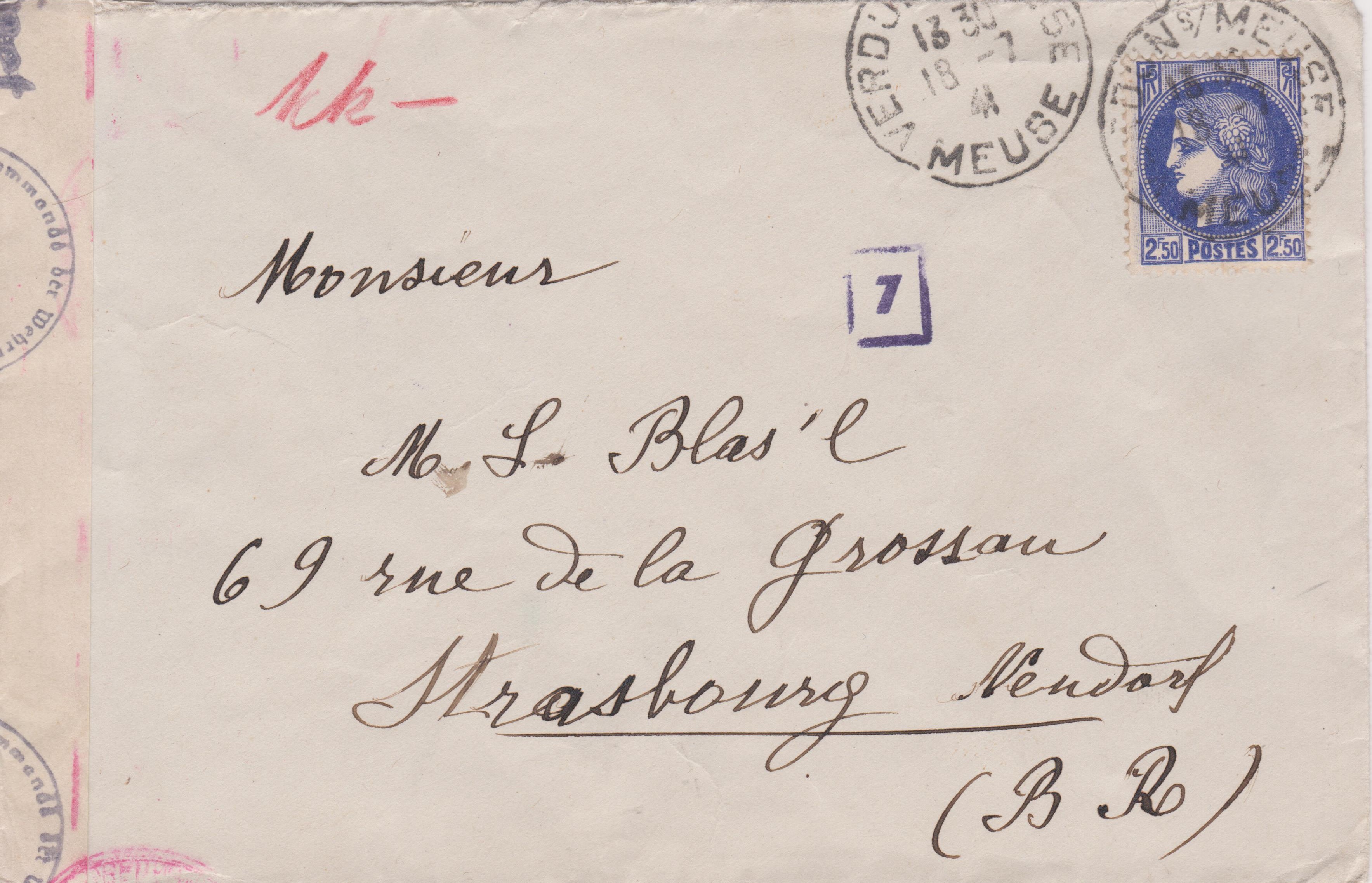 Dieser nach "Strasbourg" (= Strassburg) adressierte Brief wurde am 16.04.1941 in "VERDUN s/MEUSE" aufgegeben: