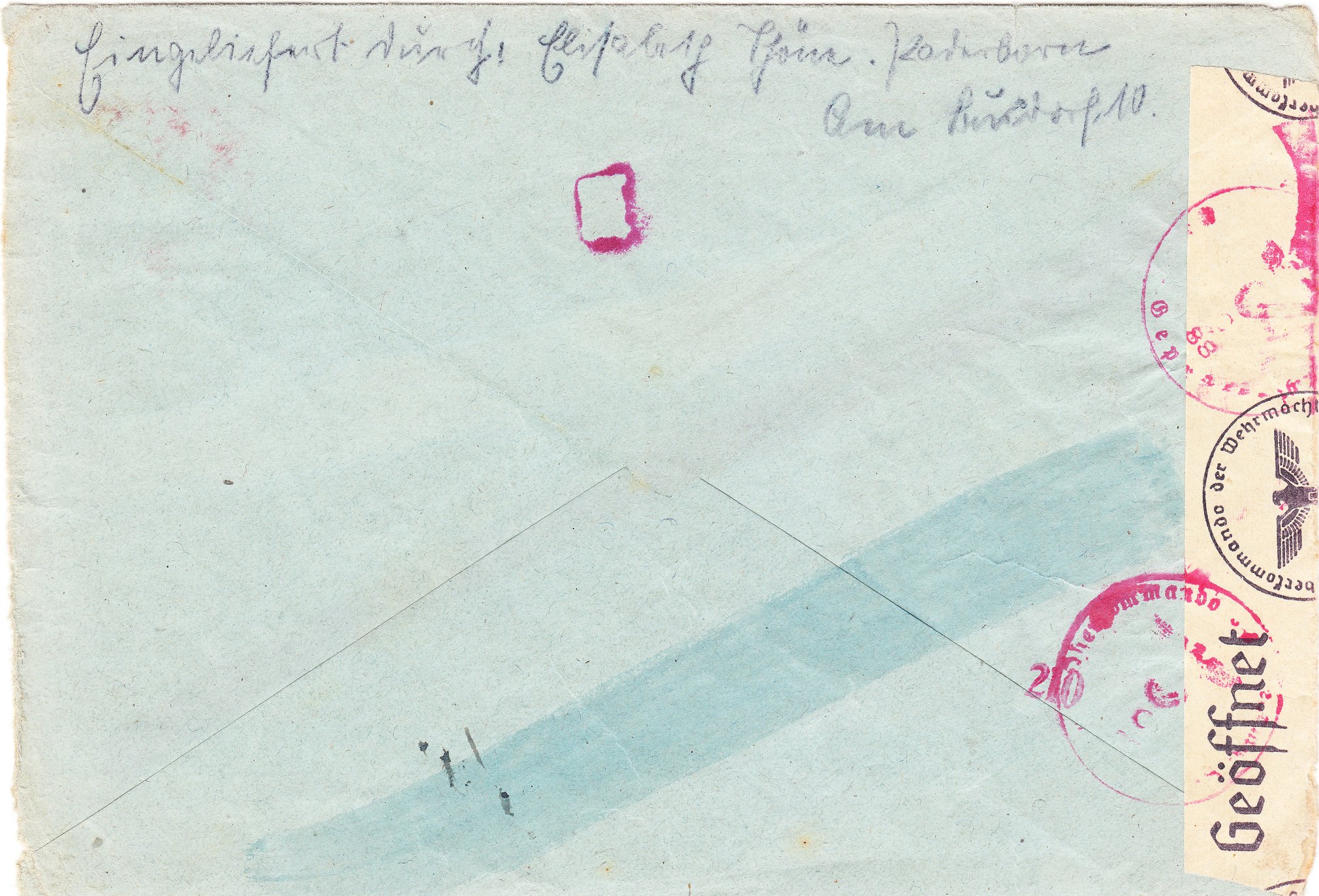 Rückseitig erfolgte eine chemische Zensur durch Pinselstriche, die mit 3 verschiedenen Chemikalien durchgeführt wurde: