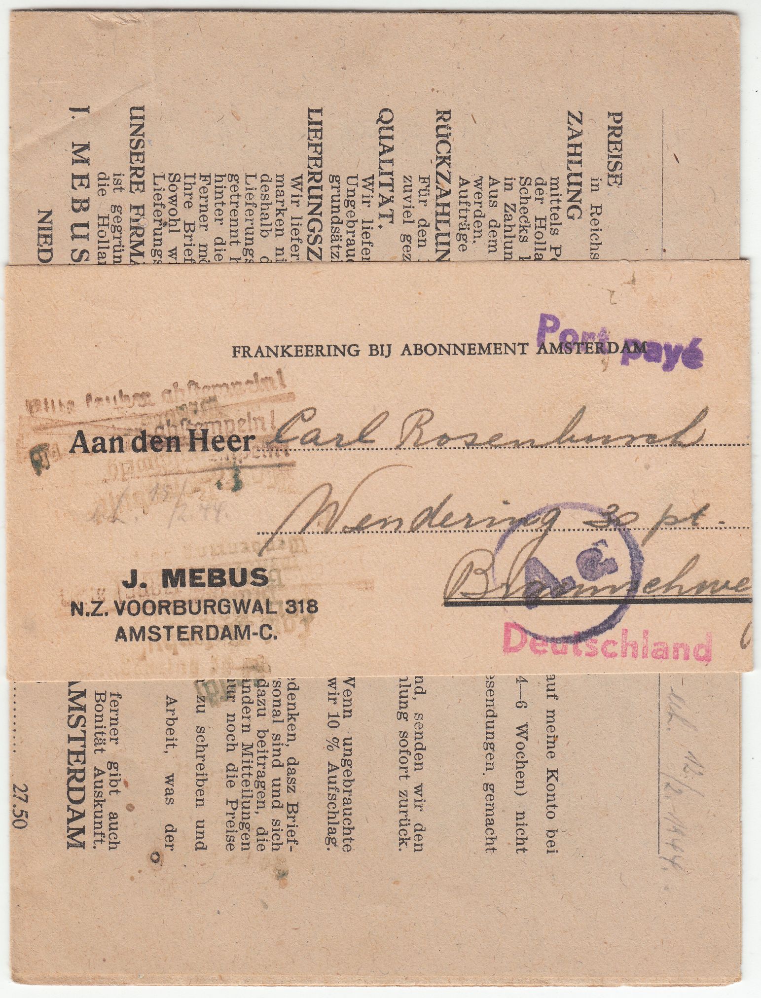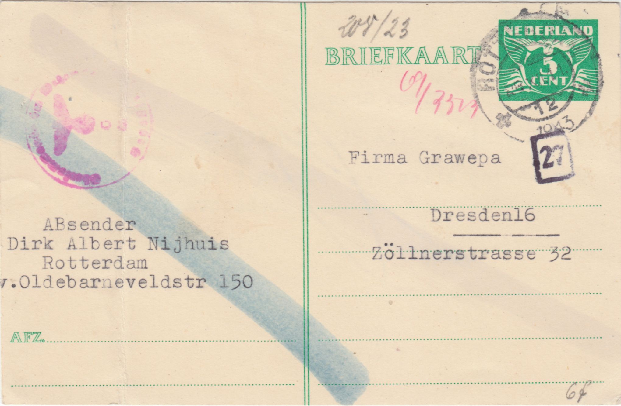 Diese nach Dresden adressierte Postkarte wurde am 28.12.1943 in Rotterdam aufgegeben.