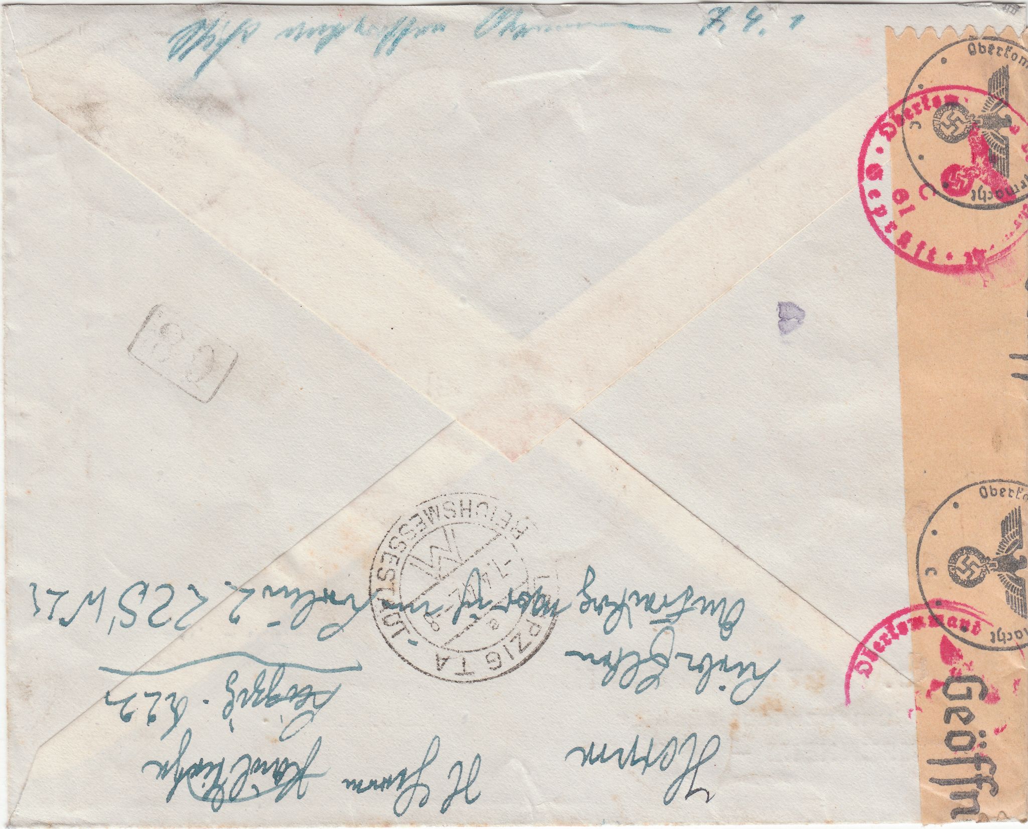 Der Brief wurde in der ABP Köln linksseitig geöffnet und nach erfolgter Prüfung mit einem Verschlußstreifen, Landsmann CV3.2, wieder verschlossen, was rückseitig zwei Abschläge des Prüferstempels "C 61", Landsmann CP3.3.1, dokumentieren.