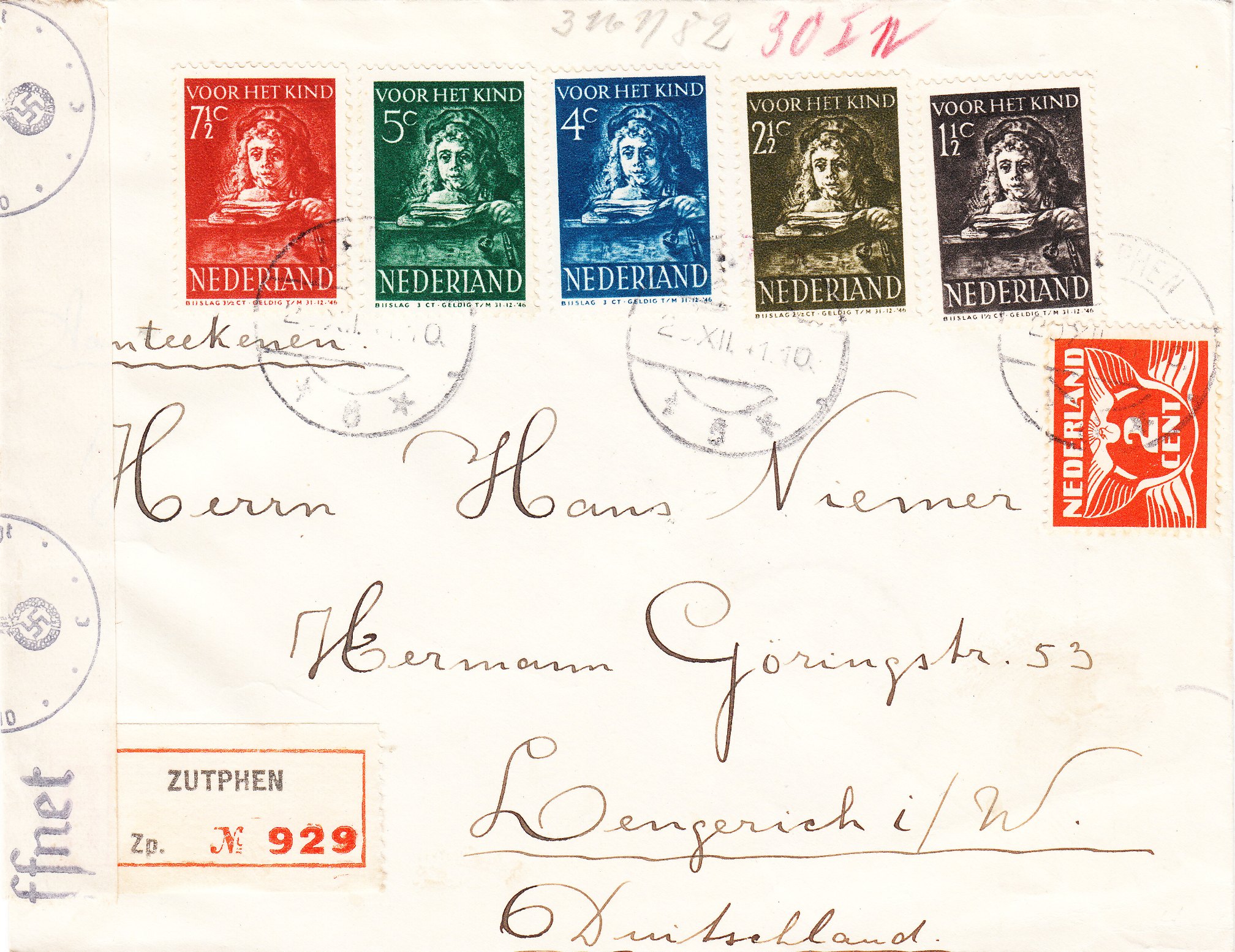 Dieser nach Holland adressierte Brief wurde zum Inlandstarif von 12 Pfennig frankiert am 05.05.1943 in Paderborn aufgegeben.