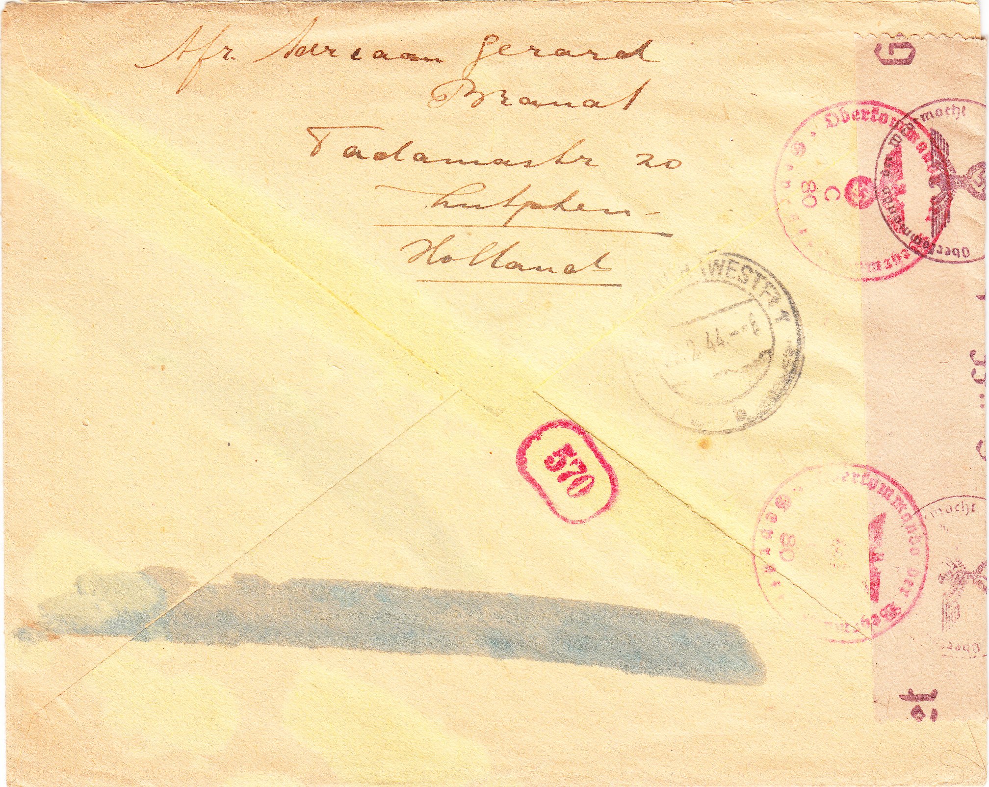 Dieser nach Lengerich in Deutschland adressierte Beleg wurde am 15.02.1944 in den Niederlanden aufgegeben: