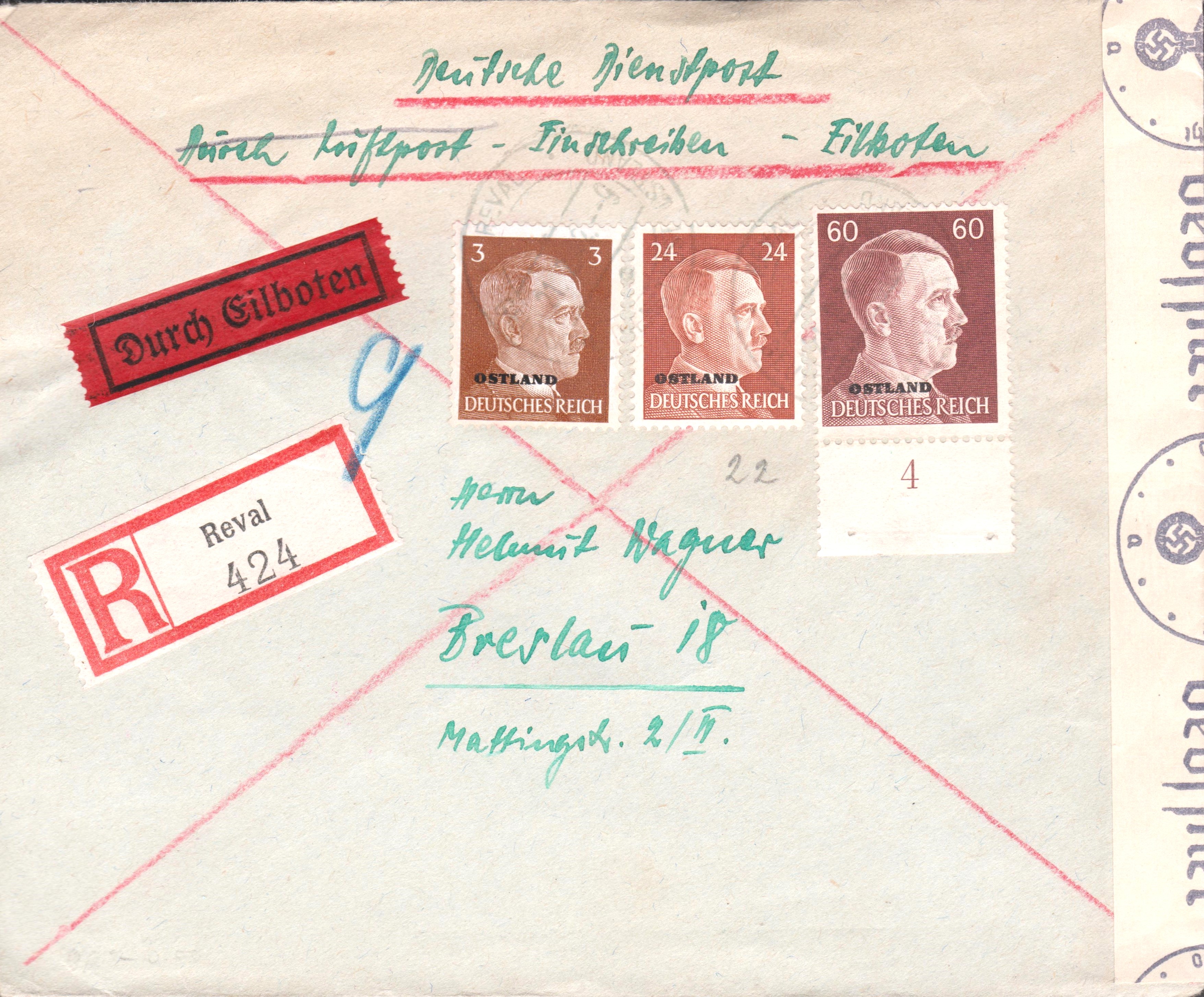 Dieser Brief im Fernverkehr nach "Bad Nauheim" (12 Pf) per Einschreiben (30 Pf), abgeschickt von einem "SA-Oberführer Heinrich Bachmann", wurde am 20.05.1944 in RIGA "DURCH DEUTSCHE DIENSTPOST OSTLAND" aufgegeben: