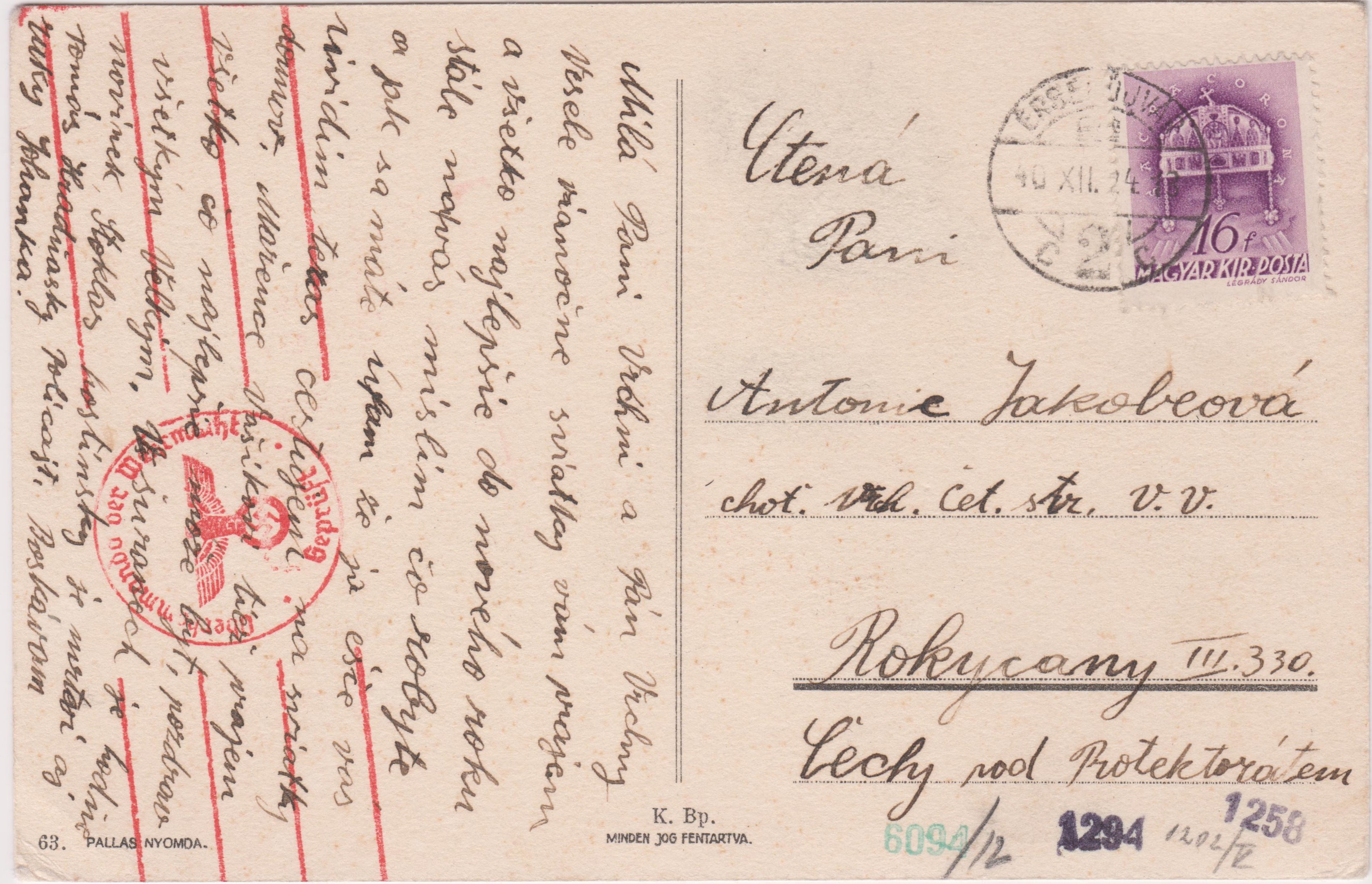 Diese Ansichtskarte wurde am 24.12.1940 um 13 Uhr in Ungarn aufgegen: