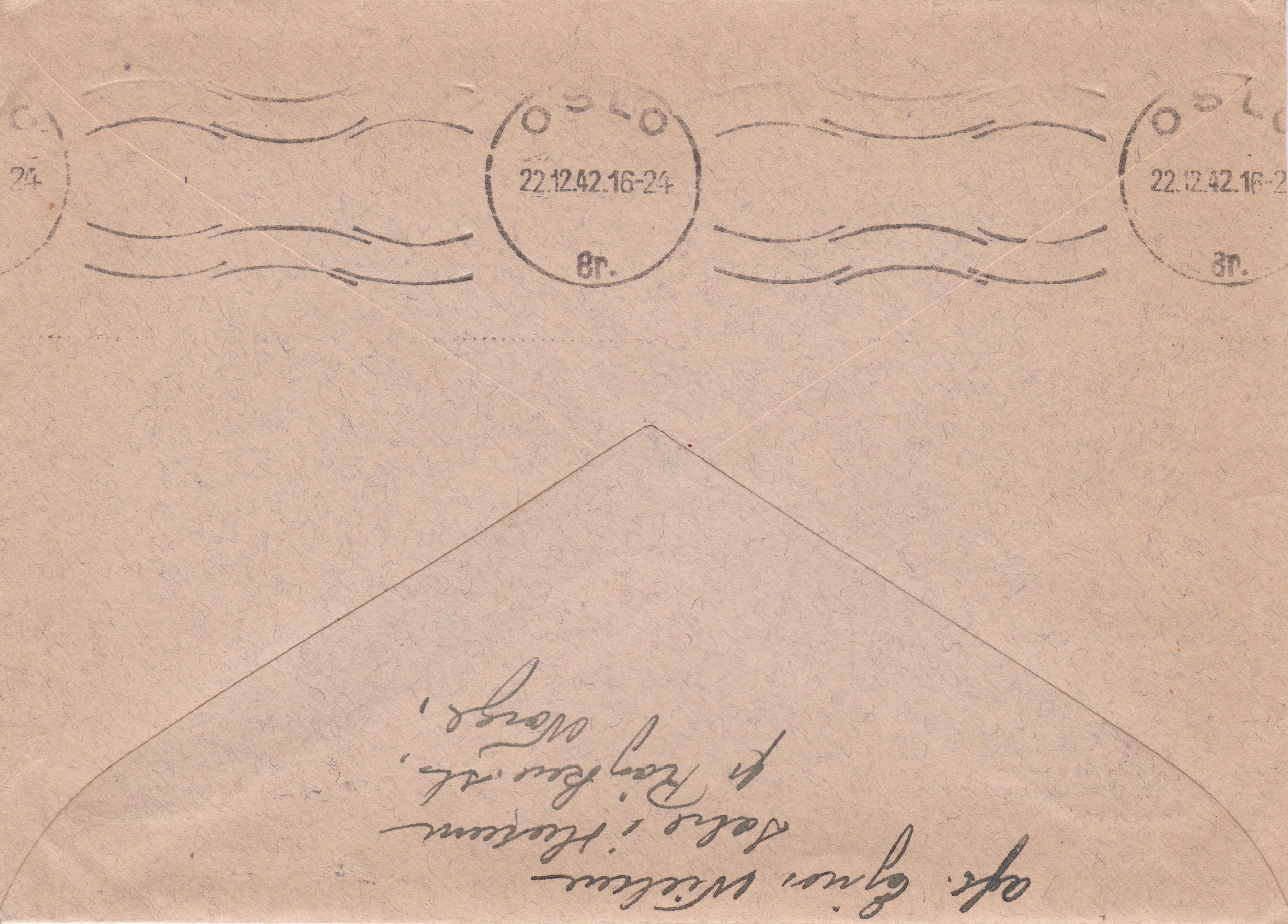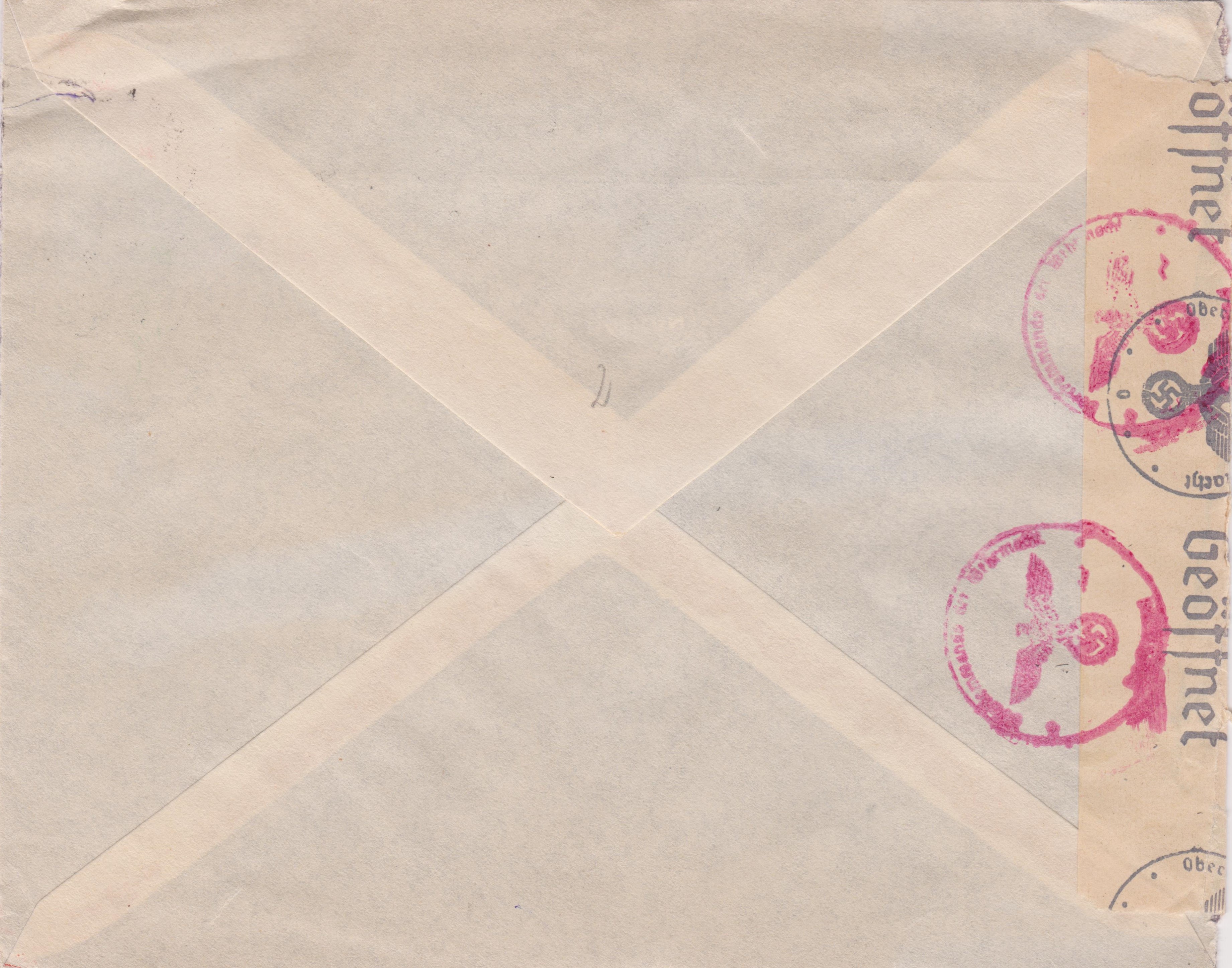 Der Brief wurde der ABP Oslo zugeleitet, wo er linksseitig geöffnet und nach erfolgter Prüfung mit einem Verschlussstreifen "Geöffnet Oberkommando der Wehrmacht O", Landsmann DV1.1, wieder verschlossen, was zwei Abschläge eines Prüfstempels, Landsmann OP1.1, dokumentieren.