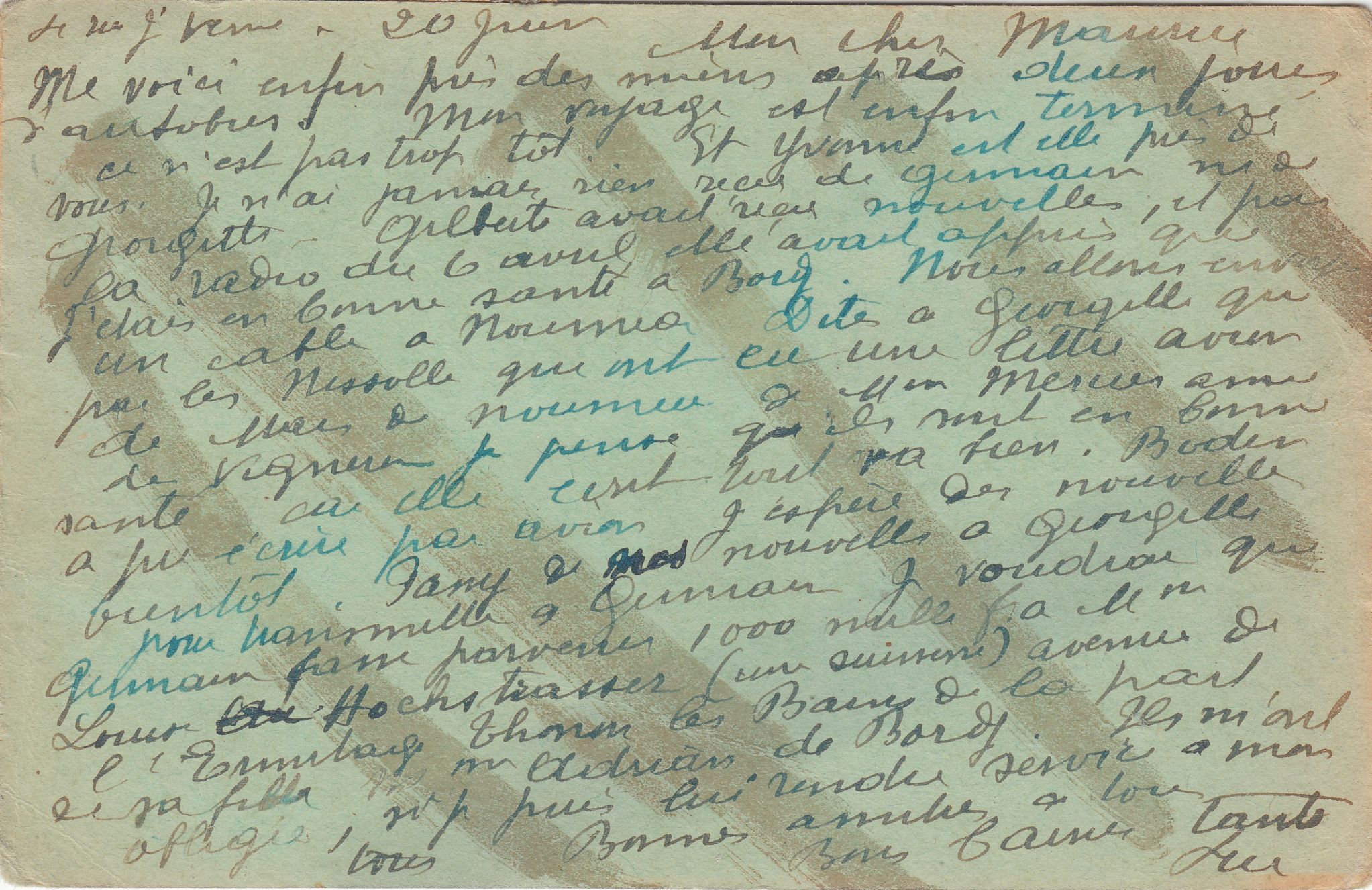 Rückseitig wurde diese Postkarte in der ABP Paris gleich 3 mit Hilfe von diagonal per Pinselstrich aufgebrachten verschiedenen Chemikalien chemisch zensiert, wovon eine bis auf die Vorderseite durchgeschlagen ist: