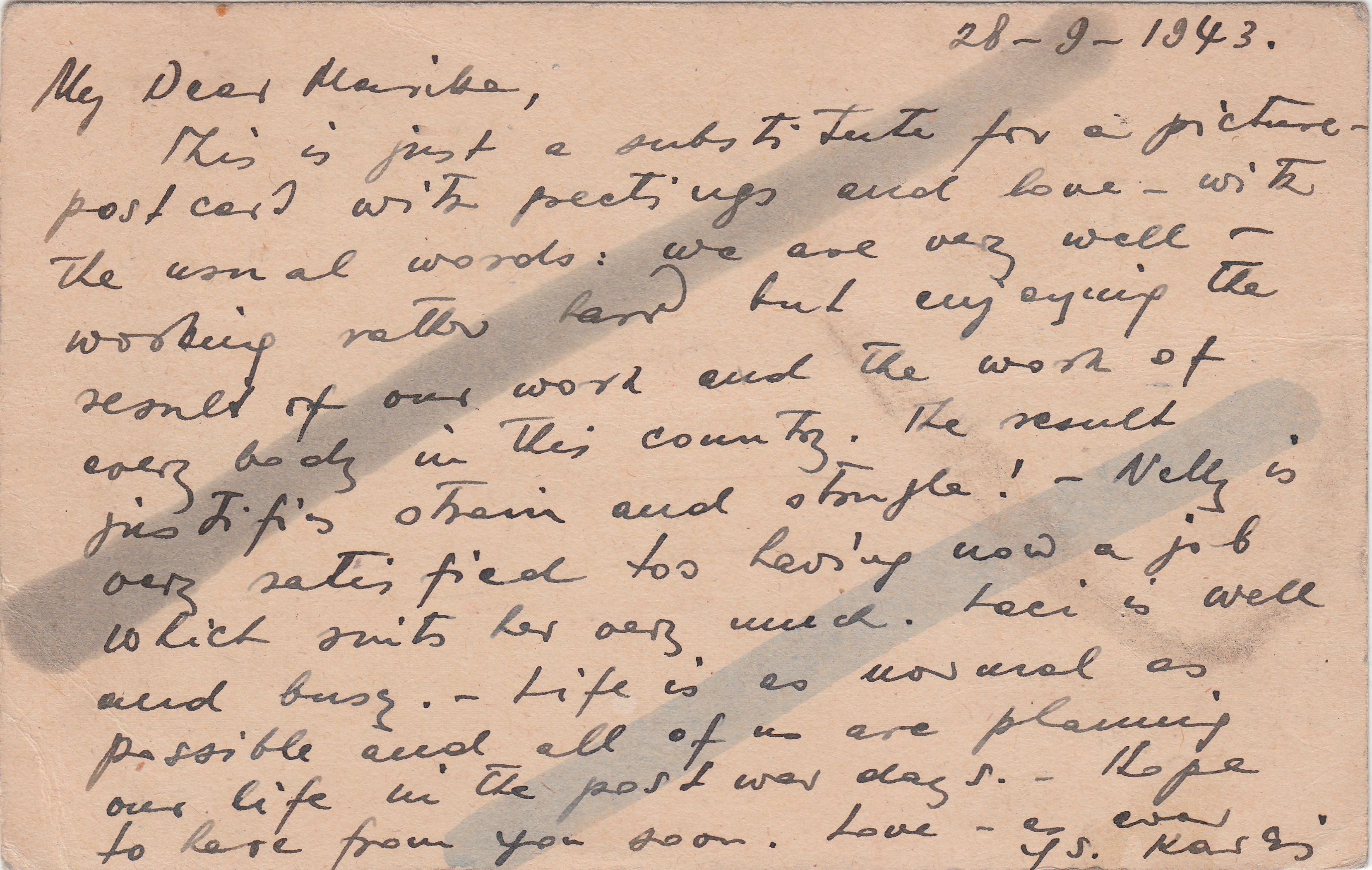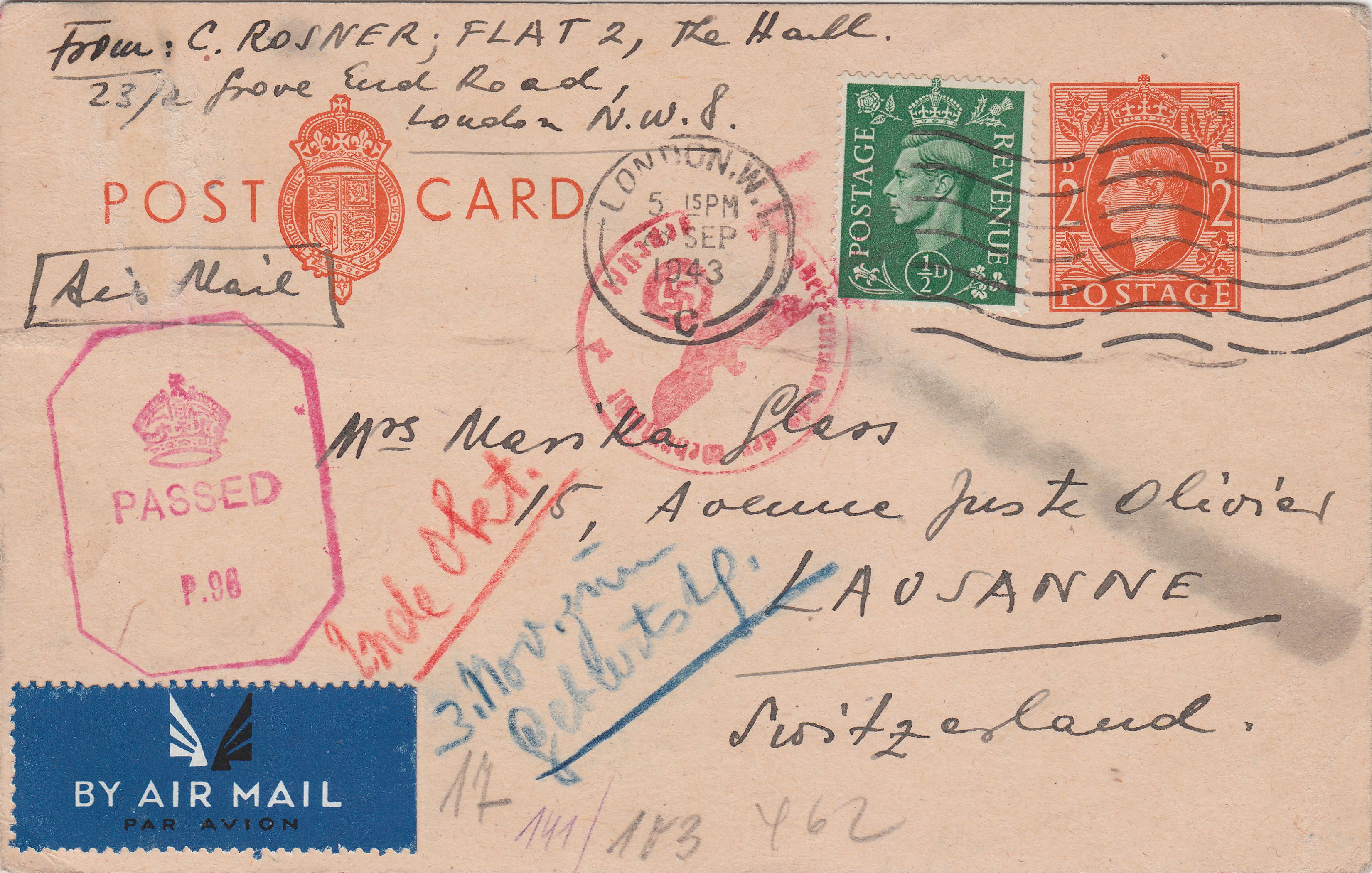 Diese nach Lausanne adressierte Postkarte wurde am 28.09.1943 in London aufgegeben: