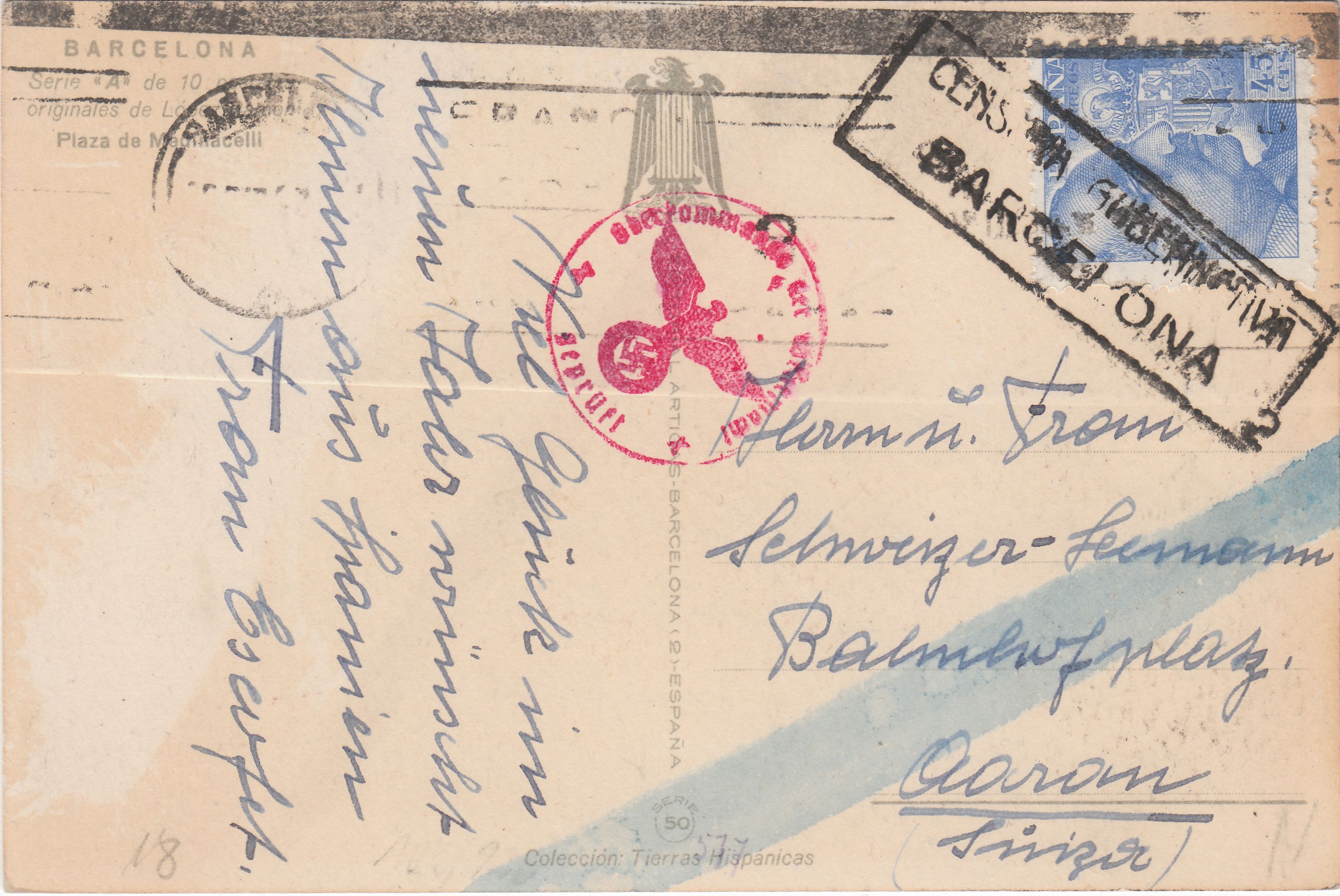 Der Beleg durchlief in Barcelona die spanische Zensur, wo ein zweizeiliger Rechteckstempel in Schwarz "CENSURA GUBERNATIVA BARCELONA" abgeschlagen wurde.