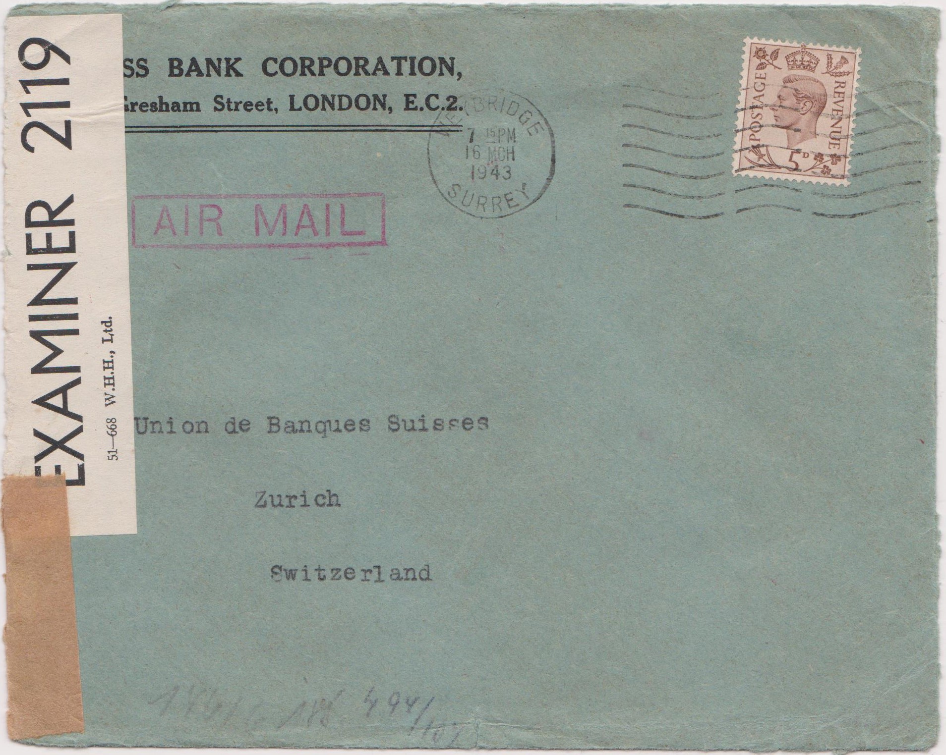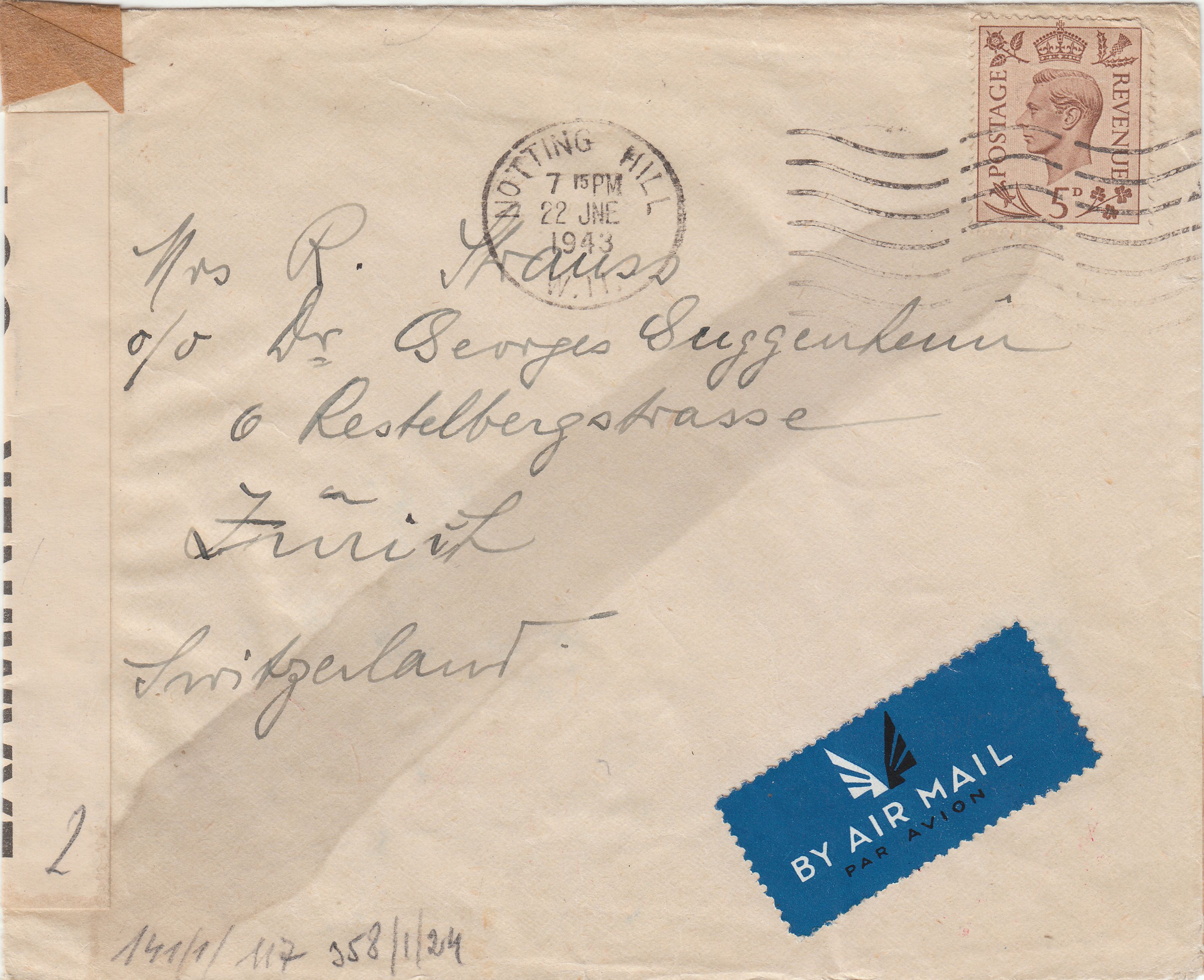 Dieser nach Zürich adressierte Brief wurde am 22.06.1943 in NOTTING HILL aufgegeben: