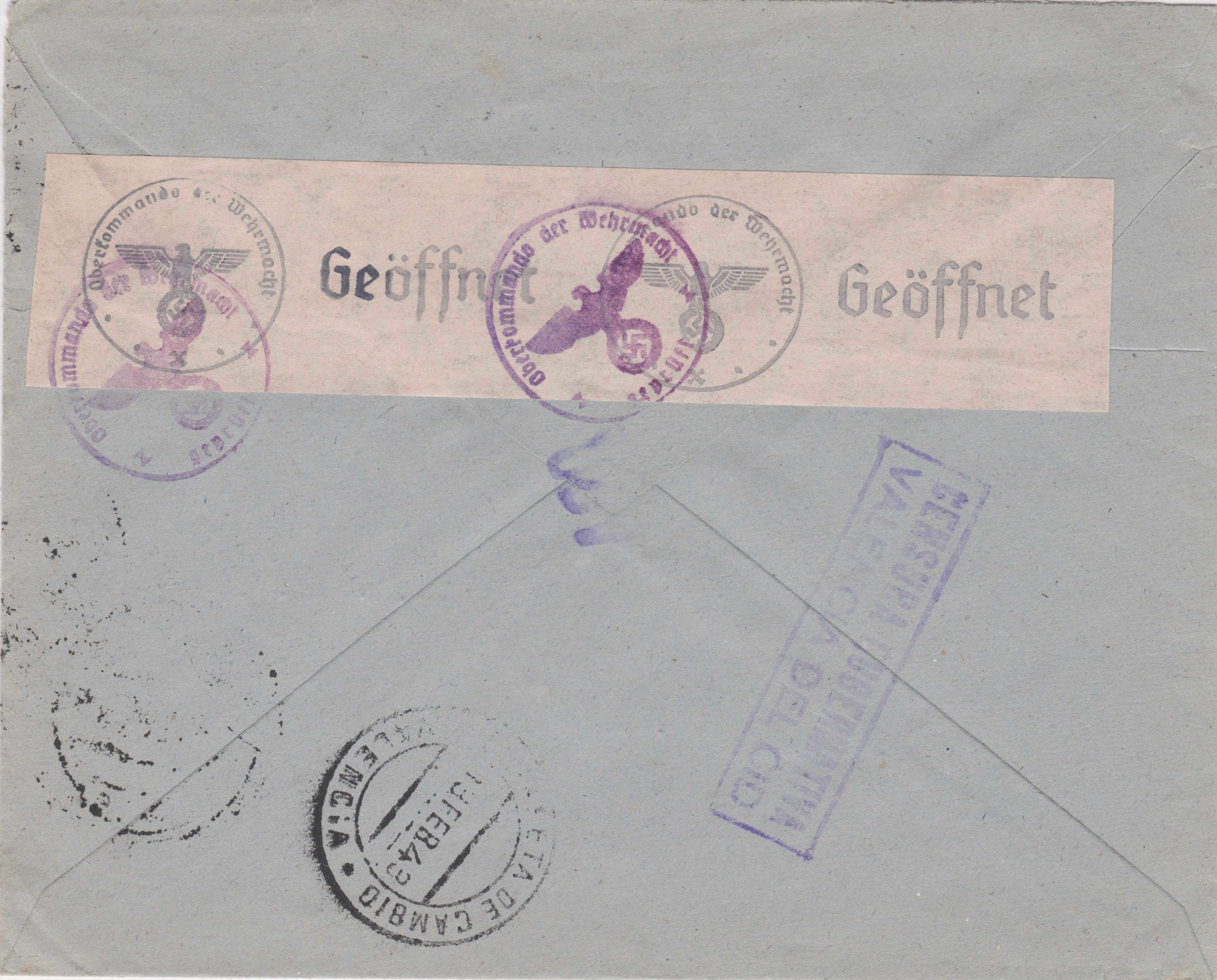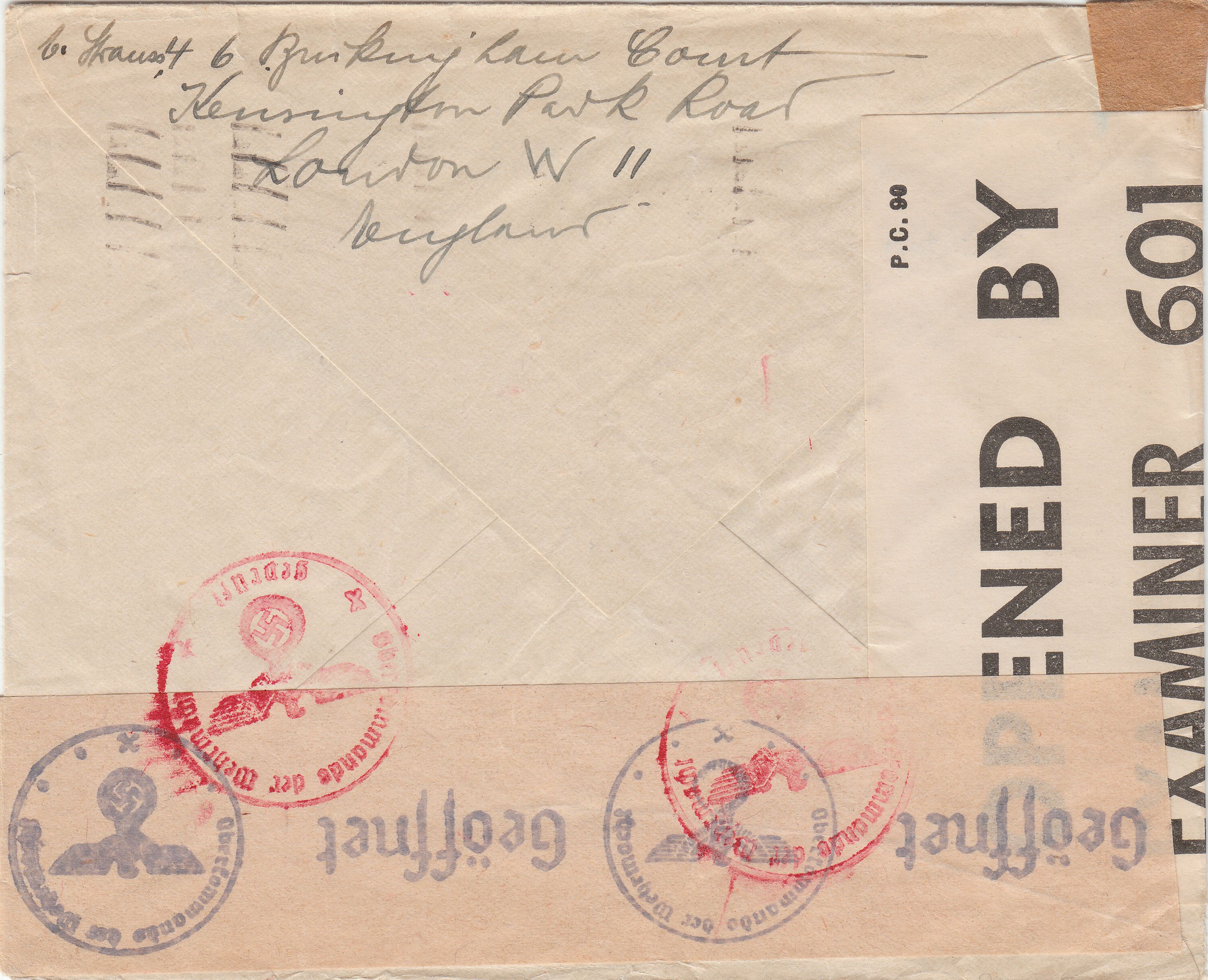 Dieser Brief wurde gleich dreimal zensiert, zuletzt als "Post zwischen dem feindlichen Ausland und der Schweiz" in Paris, wo rückseitig ein Verschlußstreifen "Geöffnet Oberkommando der Wehrmacht X", Landsmann XV1.1, verklebt wurde, was zwei Prüfstempel in Rot dokumenieren.