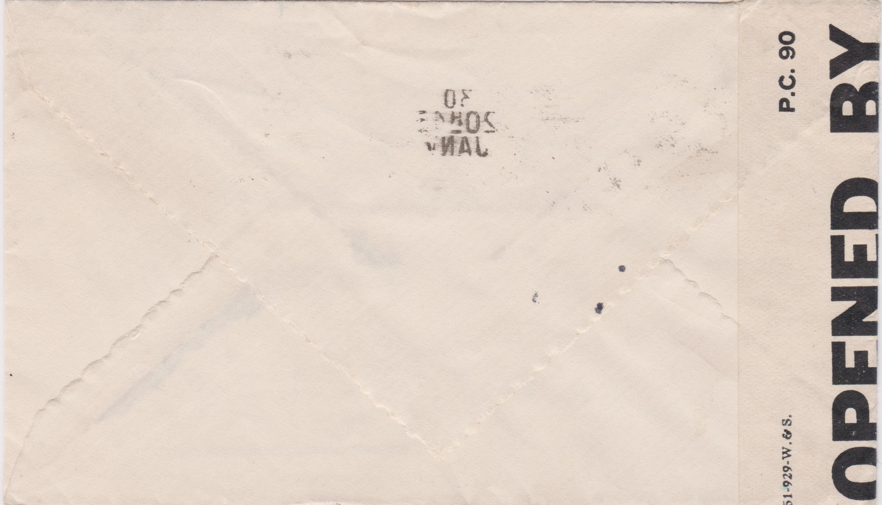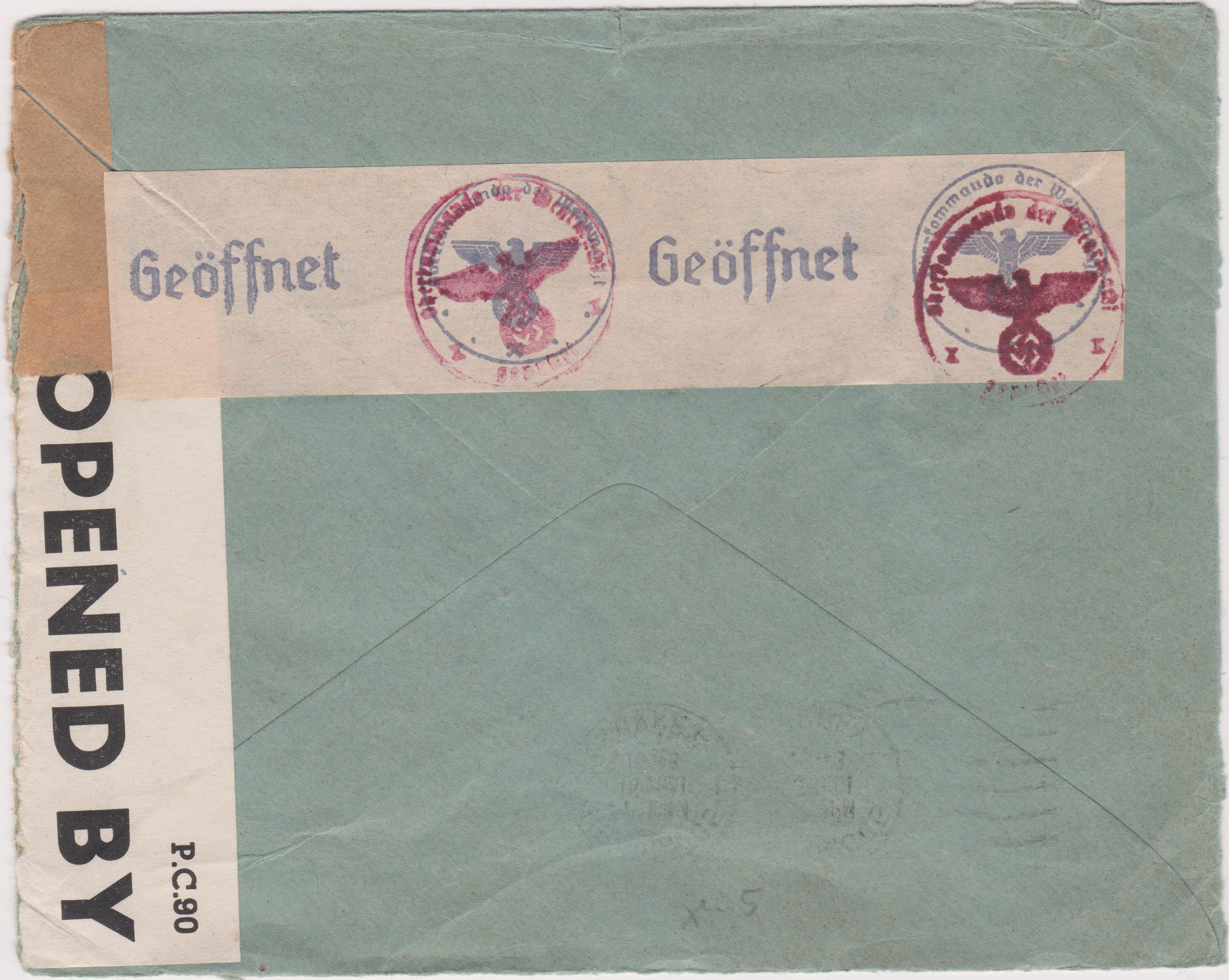 Der Beleg durchlief die britische Prüfstelle in London, wo er linksseitig geöffnet und nach erfolgter Prüfung mit einem Verschlußzettel "P. C. 90 OPENED BY EXAMINER 601" (P. C. = Postal Censorship) wieder verschlossen wurde.
