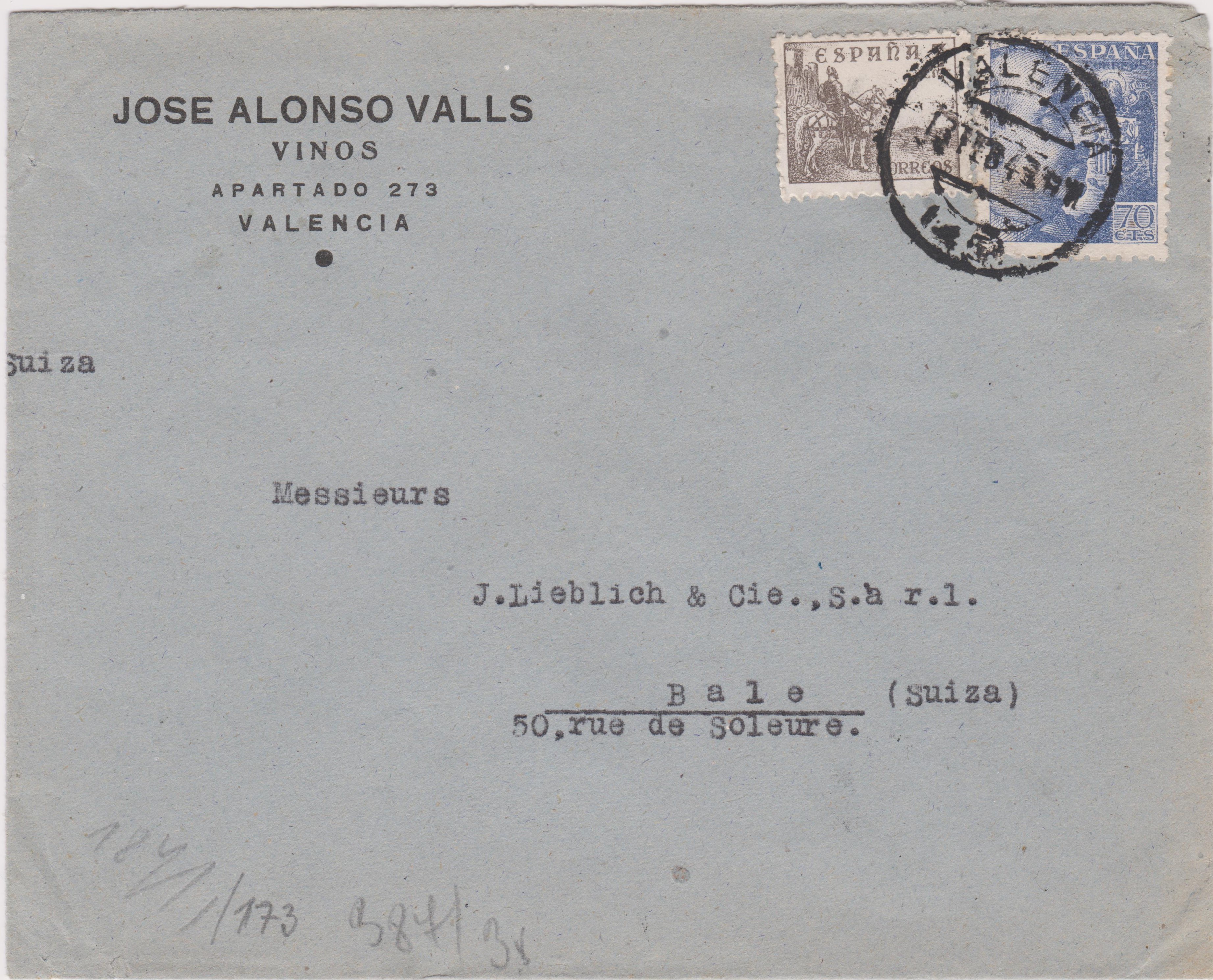 Dieser nach "Bale (Suiza)" (= Basel Schweiz) adressierte brief wurde in VALENCIA in Spanien aufgegeben: